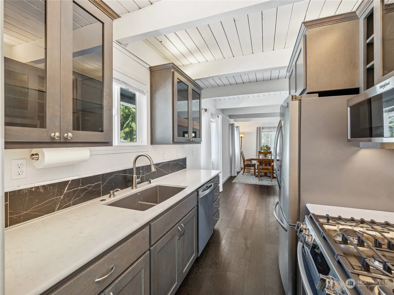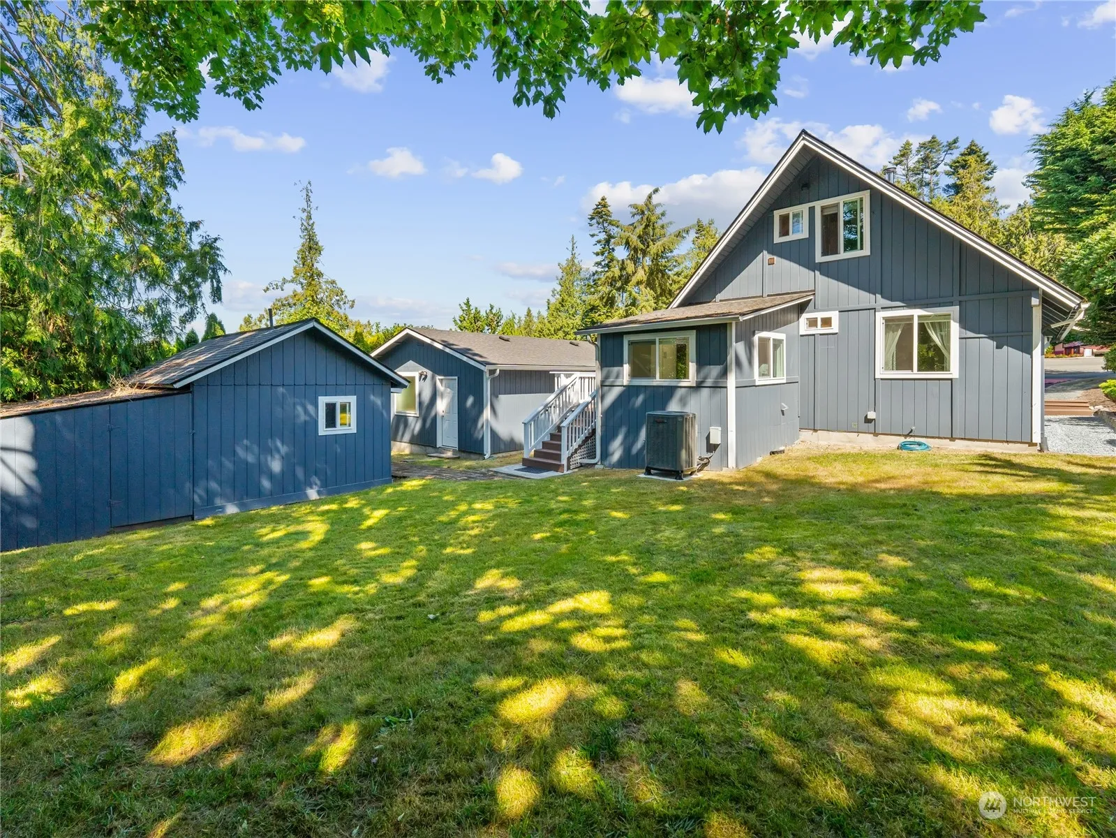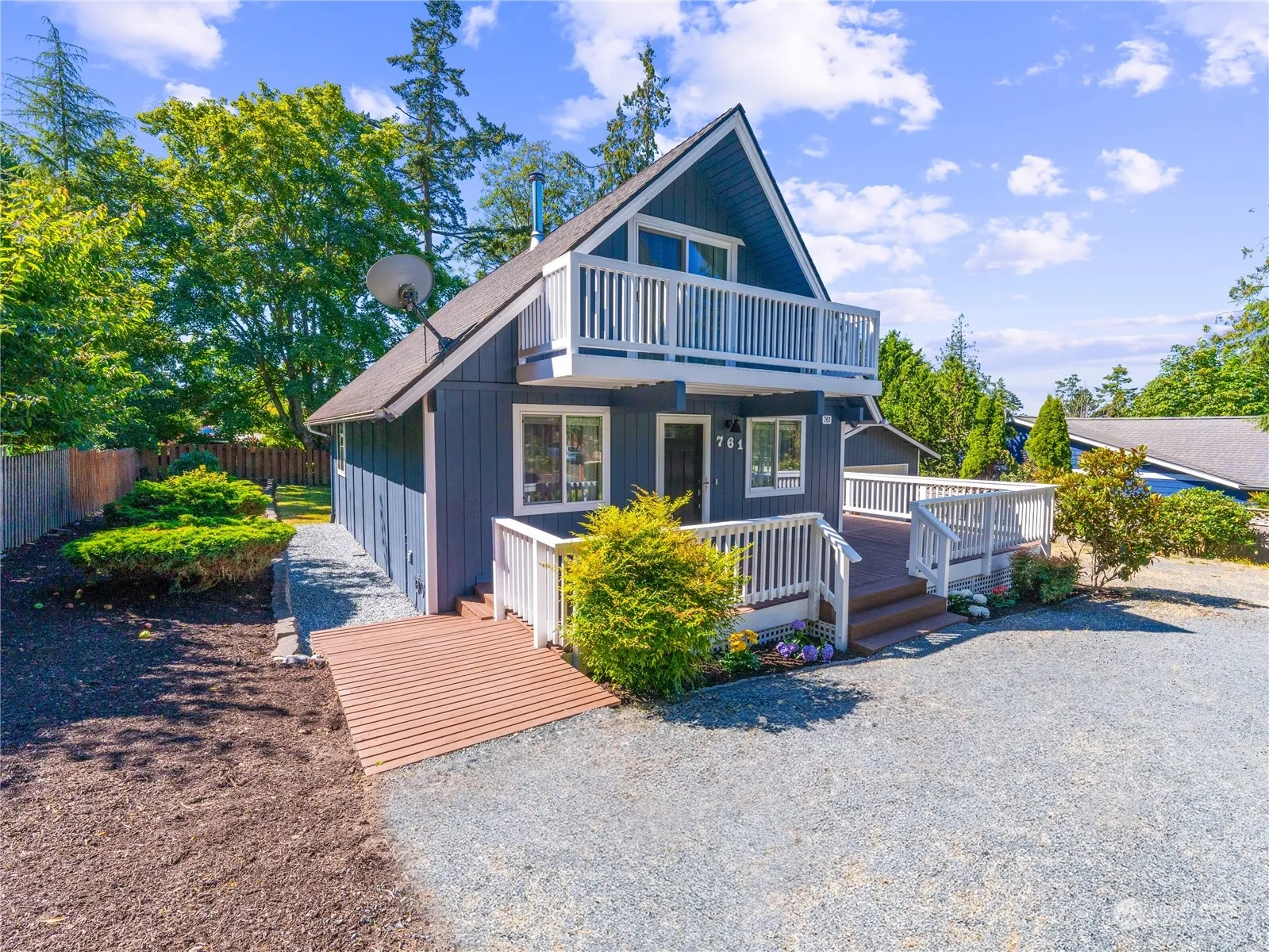 Northwest Chalet style home. Well maintained with updated kitchen, solid surface counters, quality cabinets & stainless steel appliances. Engineered hardwood flooring in living area, cozy wood burning stove & big windows. Large wrap around deck on main level and fenced back yard for outdoor entertaining. Nice sized Laundry/utility room off kitchen. One bedroom one bath on each level, Primary bedroom has built in storage, office/ hobby area, and a deck to enjoy. Detached Studio to use as work out area, office, guest room. Oversized detached garage, with custom cabinetry. Level yard. Community amenities include, swimming pool, tennis & Pickle courts, golf, private beaches, BBQ & picnic areas, Library, club house, marina, boat launch ramp.