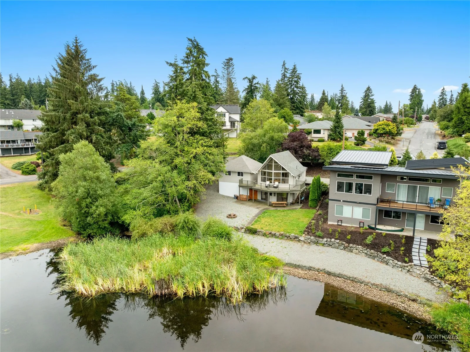 Come join the gated Golf Course Community of Camaloch. Located in the Sun Belt of Camano Island, this Lakeside A-frame Cottage features a beautiful spiral staircase in the center of the home that continues through all 3 levels. Offering 2 bedrooms, 1 bath plus a loft & bonus room. The wall of windows lakeside can be observed from every level. The 2 car detached garage has built-in raft room & plenty of off street parking, even room for an RV. Low HOA dues include water, unlimited golf, access to the 2 community pools, sport courts & more. Bring your golf cart, LET’S GO!