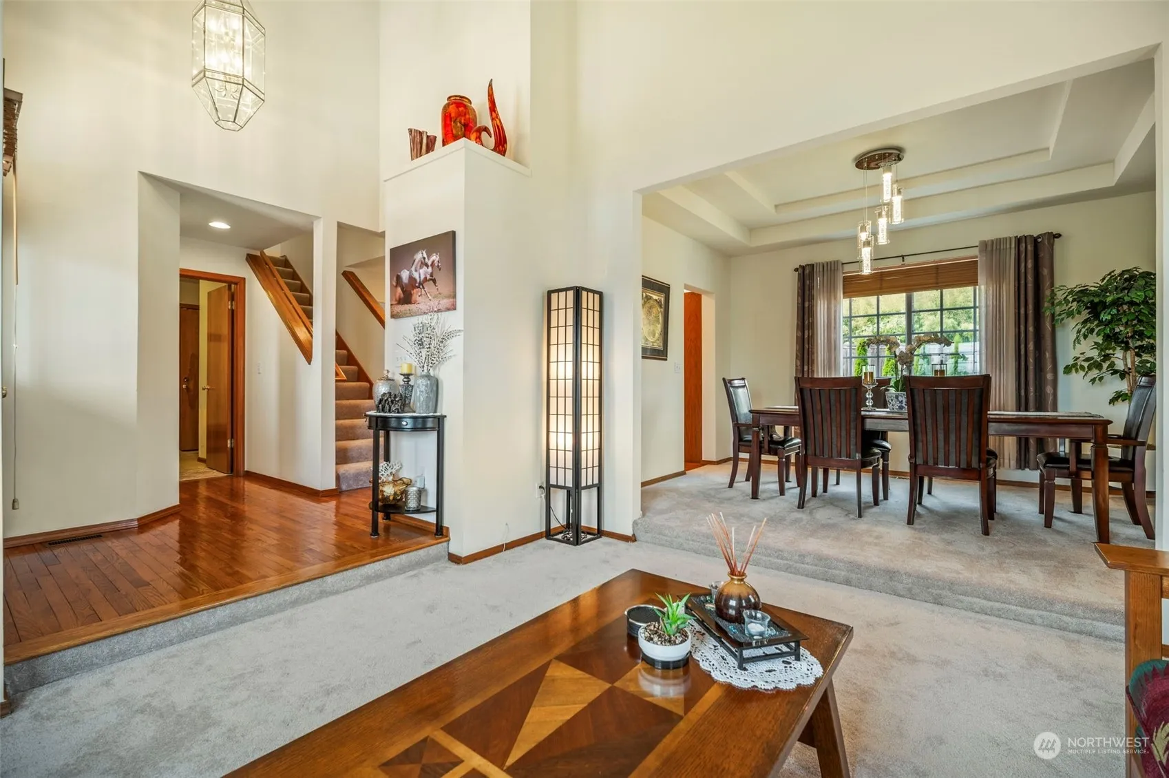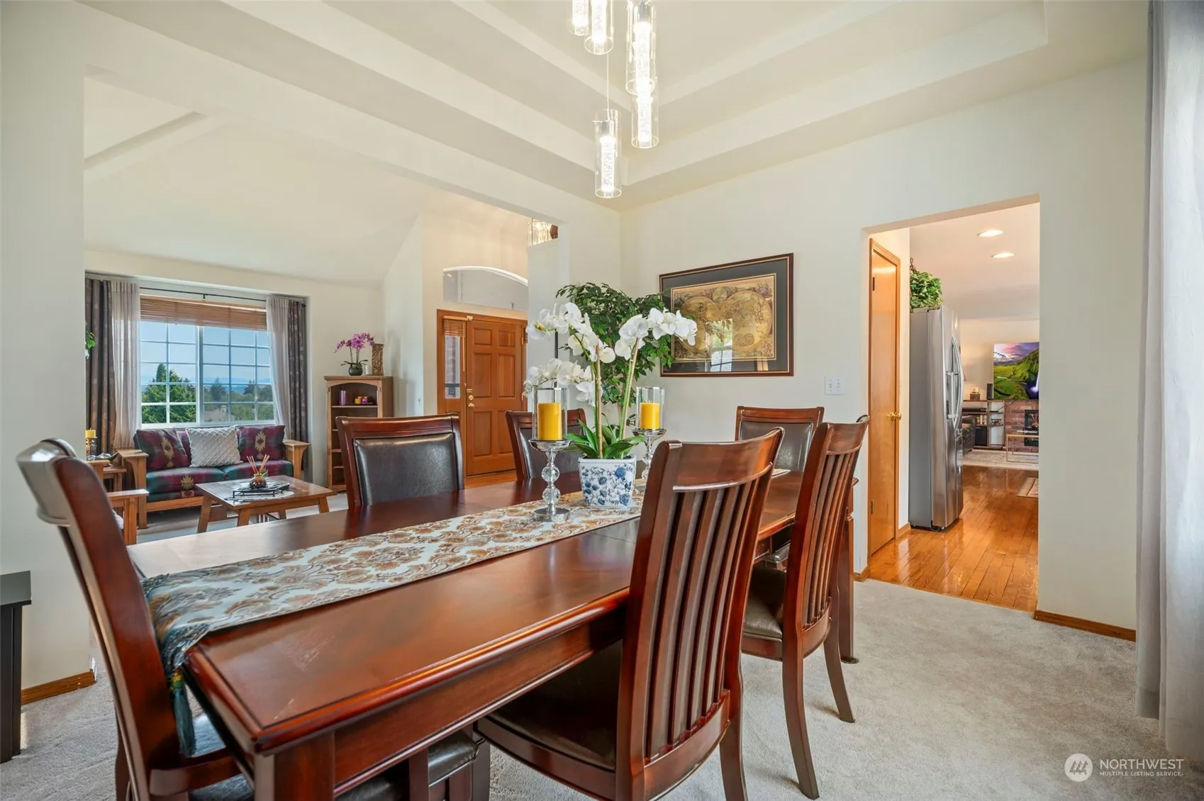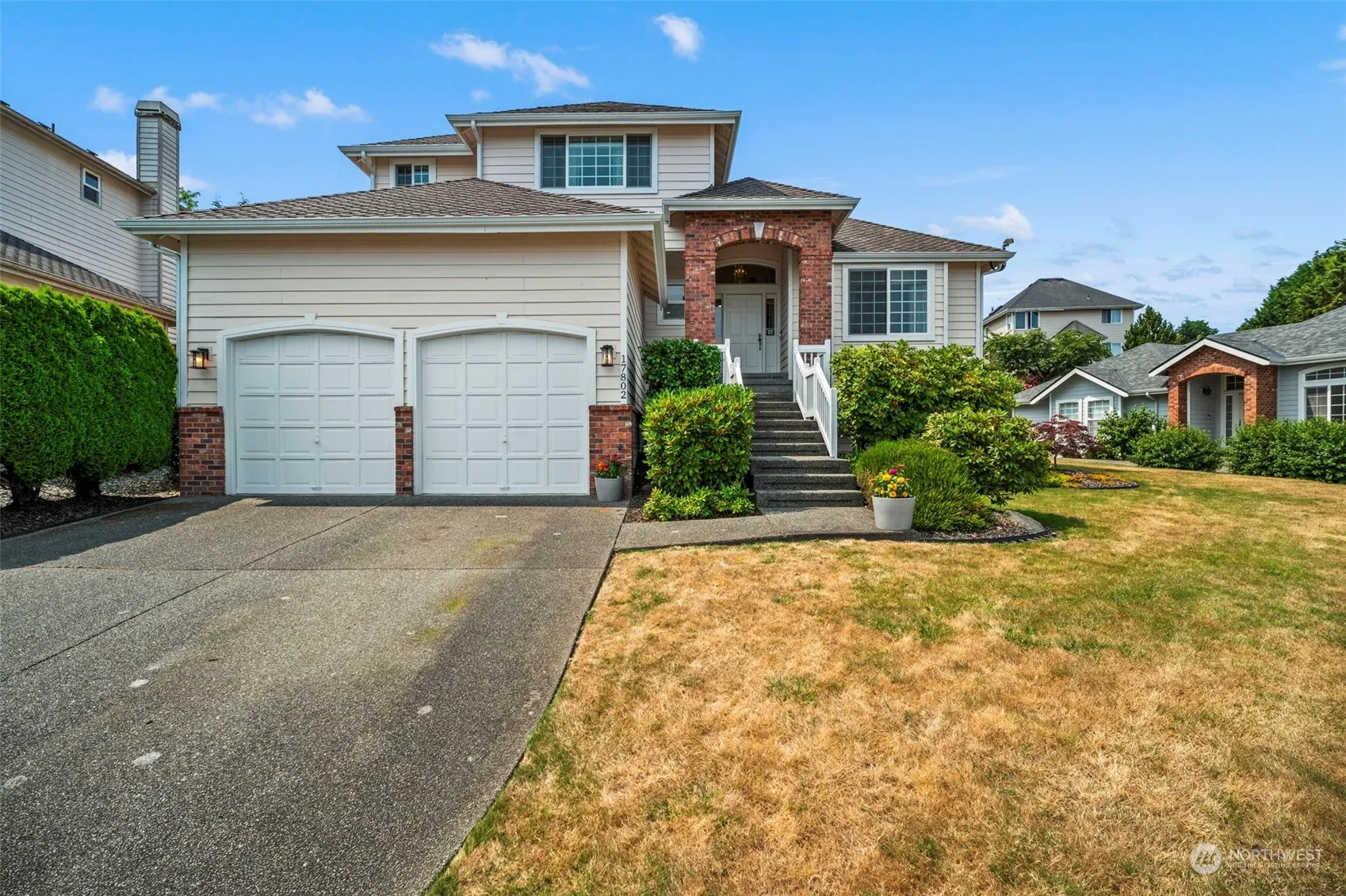 Unique one-owner, second-home property at end of quiet cul-de-sac in secluded neighborhood. Superbly maintained. Enter through the grand brick archway into sophisticated living & dining room with vaulted ceilings. Kitchen w/eating area opens to family room w/wood-burning or gas fireplace. Upstairs primary bedroom offers stunning views of Cascades & Mt. Rainier, 5-piece en-suite, & walk-in closet. Spacious bedrooms, utility room w/sink, & large, updated windows with custom coverings let in an abundance of natural light. Newer roof, carpet, paint, heat pump w/AC, appliances & sprinkler system. Walk out the kitchen onto the back patio with pergola for a serene oasis to relax or entertain. No air traffic noise! Don’t miss this gem!