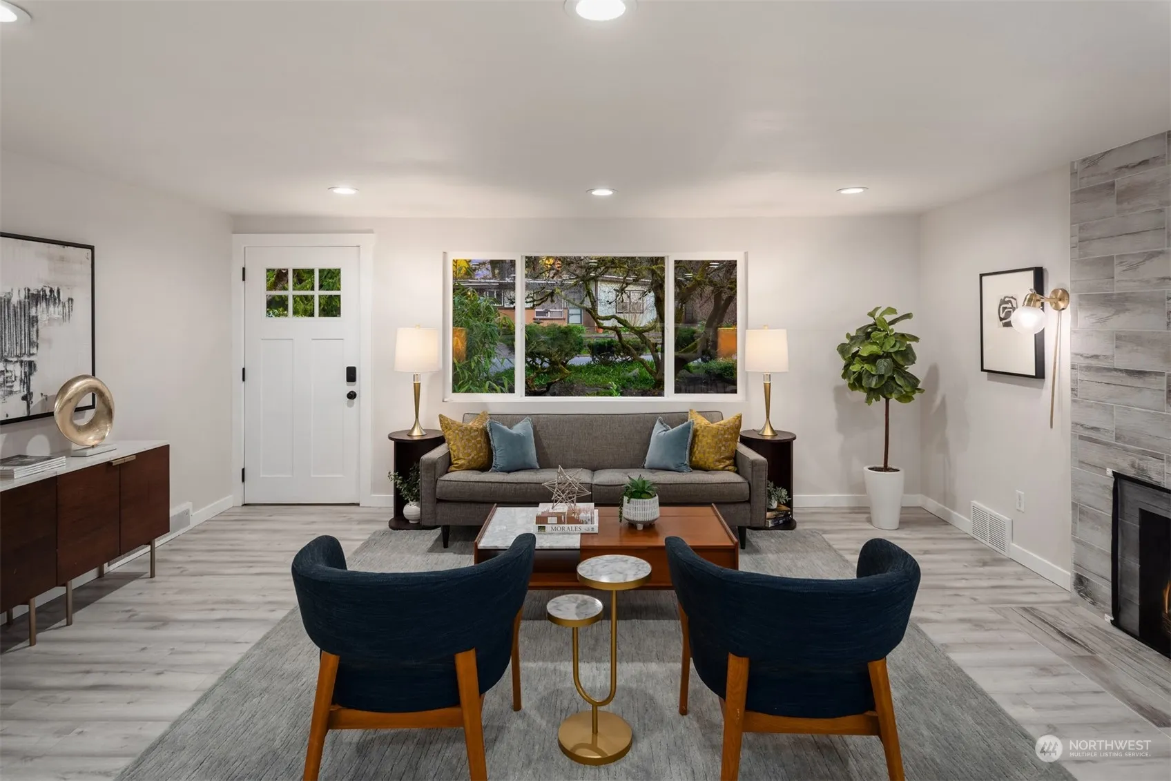 Charming mid-century home with open concept layout + exquisite renovations throughout. Interior spaces are bright with a stylish + modern color palette. Two living areas are accented by inviting fireplaces. Stunning kitchen features tasteful quartz counters, striking white cabinets + stainless appliances. Private primary bedroom with ensuite. Two full baths are expertly updated. Fantastic outdoor space with fenced + terraced backyard. Patio provides ideal spot for entertaining in warmer months. Towering trees create idyllic + secluded natural setting. Recent electrical, plumbing, roof + A/C. Located in highly regarded Shoreline School District, near major commuter routes, dining + parks.