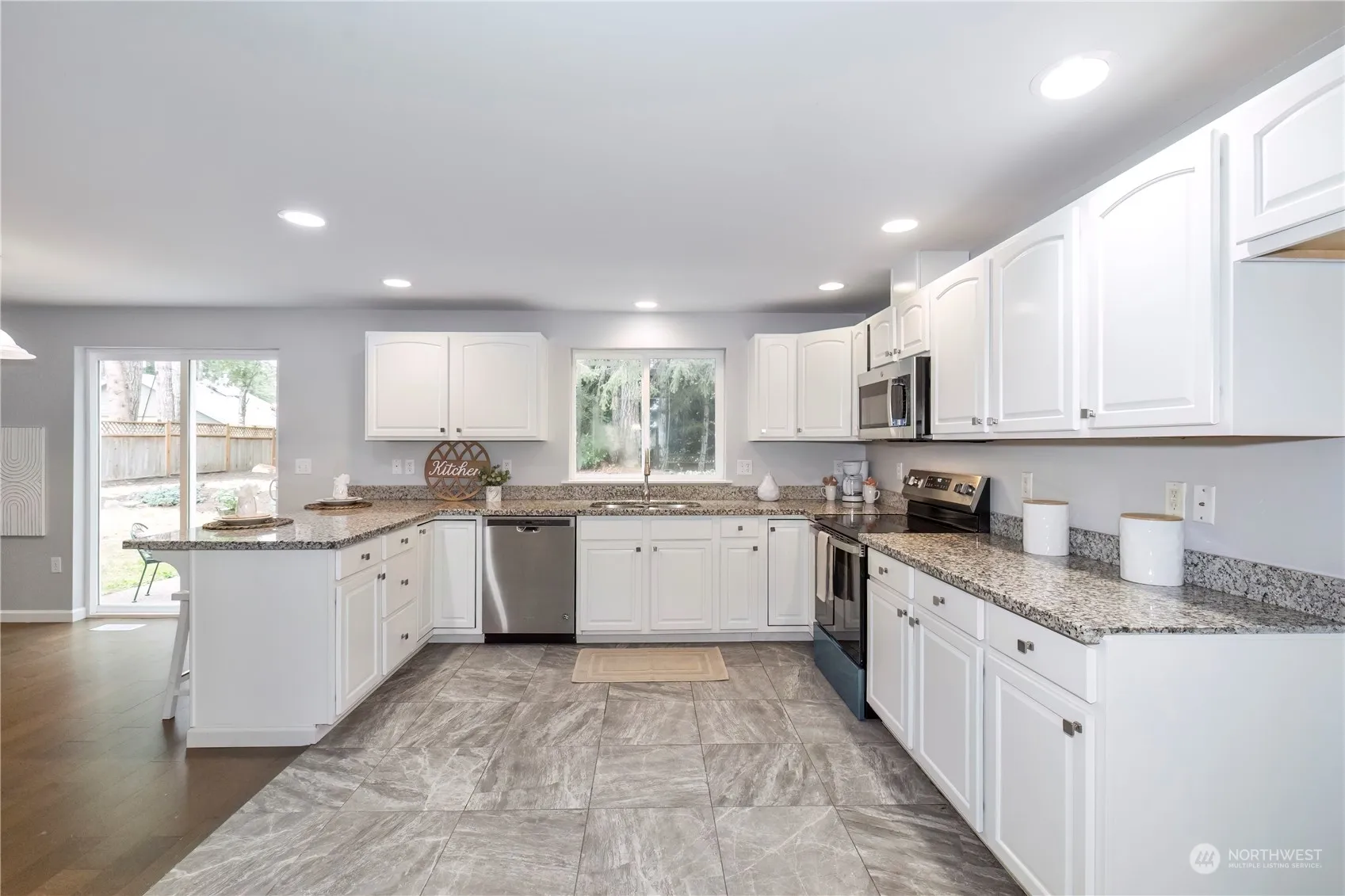 This home is located in Lakeland Village,a coveted and much desired coastal community with 27 hole golf course,clubhouse,restaurant,lake w/ boat launch,trails & playground.The home is now beautifully restored with new flooring,new paint throughout,new furnace/AC with heat pump,new stove and microwave.Large kitchen with granite counters invites for creative cooking,the capacious and comfortable family room, dining room and living room makes entertaining guests an enjoyable event.On the upper level 4 large bedrooms add to the comfort of this home.The primary bedroom has walk-in closet and full ensuite bath.Another full bath upstairs and 1/2 bath off family room and kitchen.Enjoy a BBQ on the patio in the private & fenced back yard.SEE VIDEO!