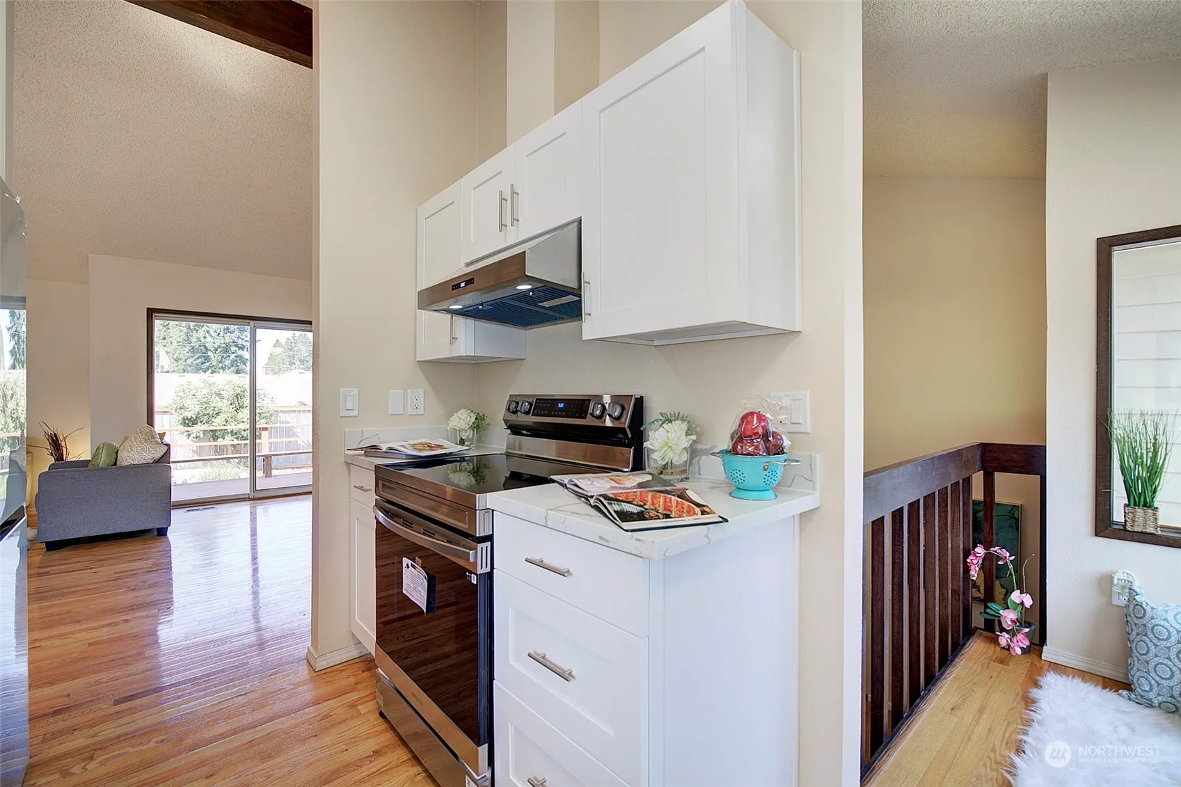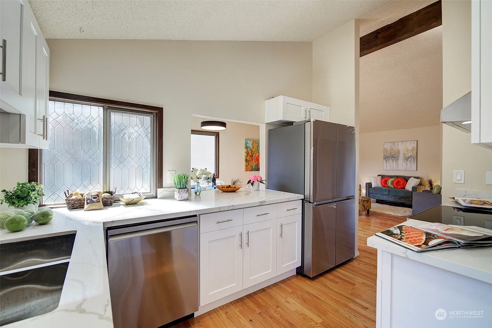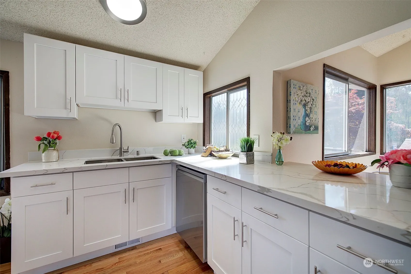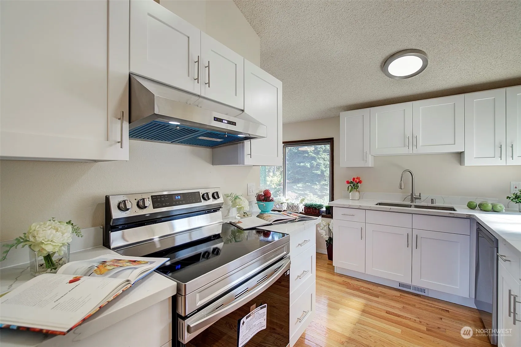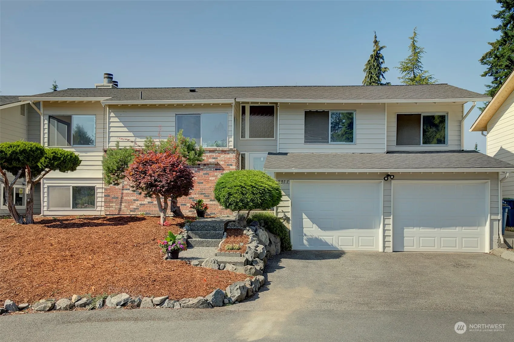 Beautiful newly remodeled mid-century construction on quiet well-kept cul-de-sac. Classic Split-level entry welcomes you w/open flow, new vinyl plank flooring. Chef’s kitchen w/quality stainless appliances, quartz counters, wood cabinets & sunny eating nook. Dining & living area flow together w/spacious vaulted ceilings & fireplace. Light & bright, main living area & master suit walk out to lg wrap around refinished deck. Huge basement rec room. Sunny backyard garden-ready w/mature trees & planting bed perfect for entertaining. Private master suite w/new bath. Conveniently located just mins to shopping, restaurants, parks, I-5, hiway 99. Comfortable quiet living. Newer gas furnace, roof, water heater. Great Edmonds school district too!