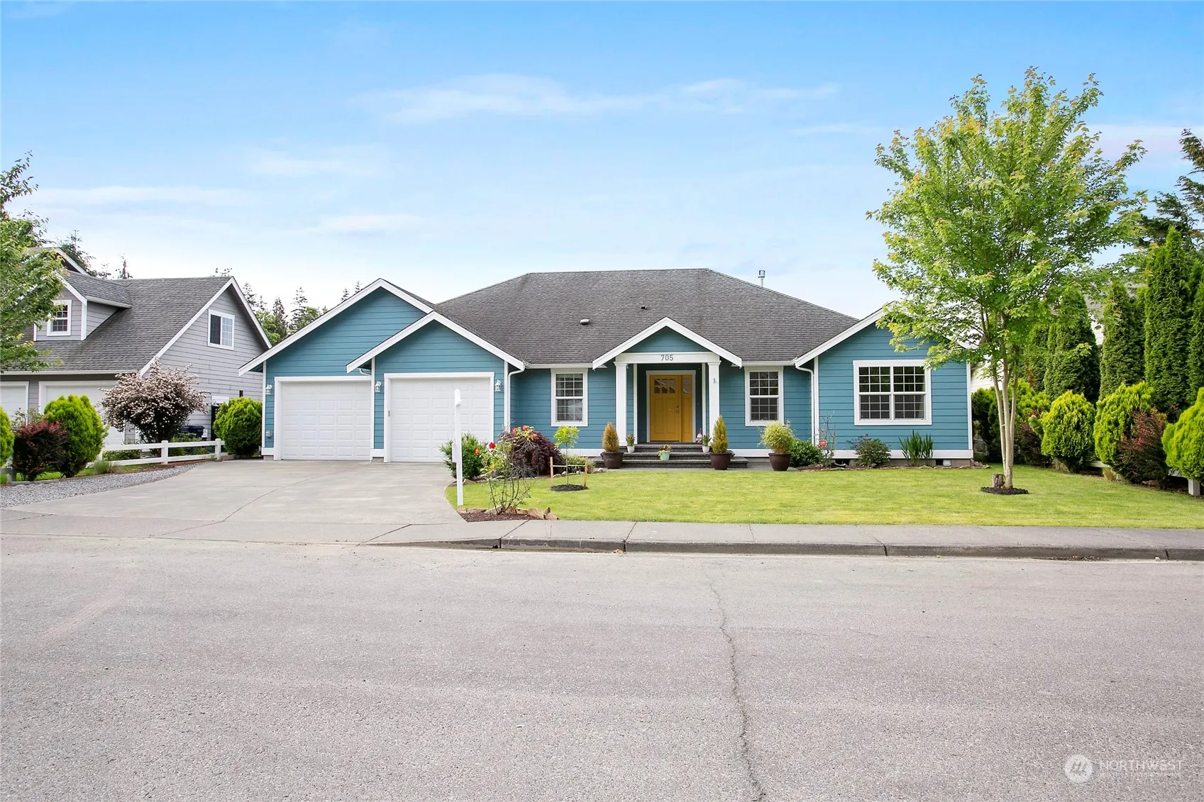Single level Everson charmer on a quiet street & in a fantastic neighborhood! Home boasts a thoughtful, open floor plan including a Great Room w/ vaulted ceilings & cozy gas FP, a family room & lots of natural light throughout. The bright living room flows to dining & kitchen area w/ granite counters & wood flooring. Kitchen w/ ES includes an abundance of counter/cabinet space. French doors off dining area open to a deck & spacious, fully fenced yard w/ raised beds. Home features 4 bdrms & 2.5 bthrms, a generous primary w/ walk-in closet & large ensuite w/ double vanity, a utility room & 2 car garage. Perched on a bright & sunny level lot, in a wonderful location w/ many outdoor activities nearby. You must see this lovely home!