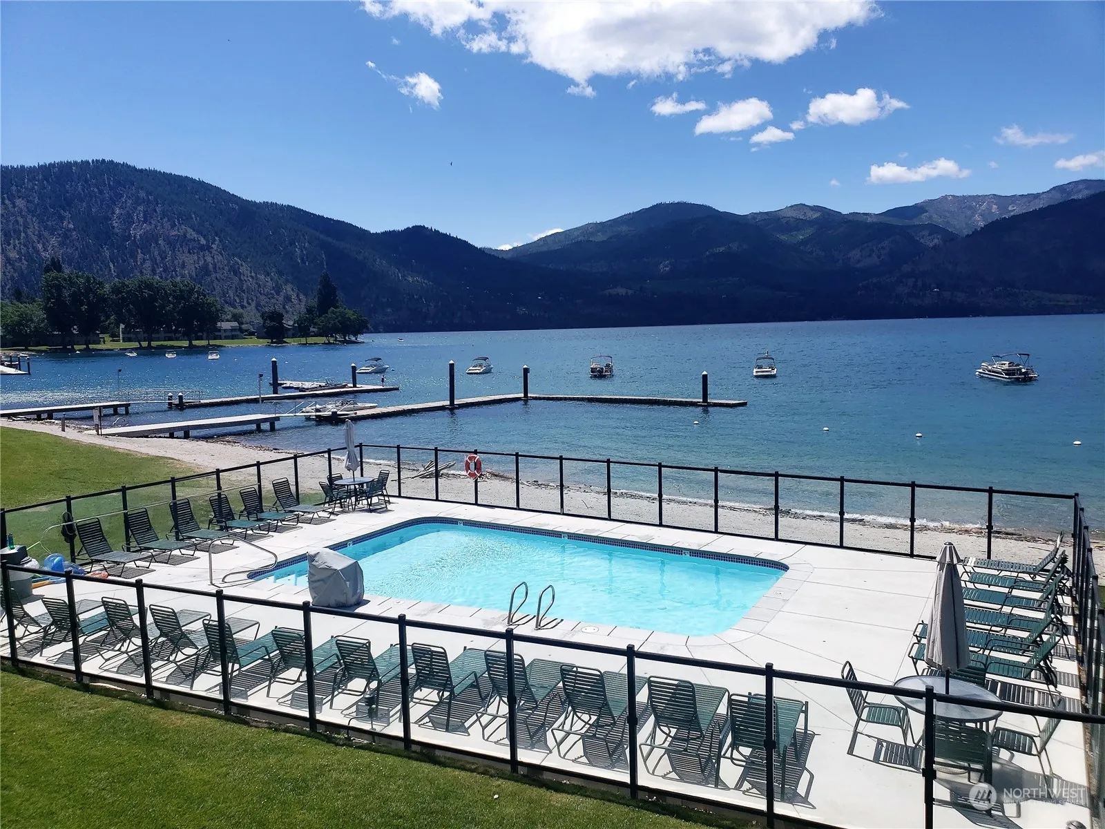 Enjoy July 4th Holiday June 28-July 5 in 2026 & watch fireworks from your private deck. Ground Floor CORNER luxury suite with unobstructed lake & mountain views and outdoor pool, lawn, swimming area, waterfront & boat moorage directly in front of unit. Buy NOW & use JAN 26-FEB 2, June 1-8 & best fall week Sept 28-Oct 5 in 2025. Upcoming prime weeks: July 25-Aug 1 & Thanksgiving Nov 21-28 in 2027 & Aug 27-Sept 3 in 2028. Newly remodeled in 2022. HOA Fees $895/quarter – 3 rotating weeks every year to enjoy all seasons. Located in the heart of all resort amenities: pickleball/tennis courts, boat moorage, children’s activity center, sandy beaches. Less than 3 blocks to downtown Manson restaurants, wineries, shopping, grocery store & more!