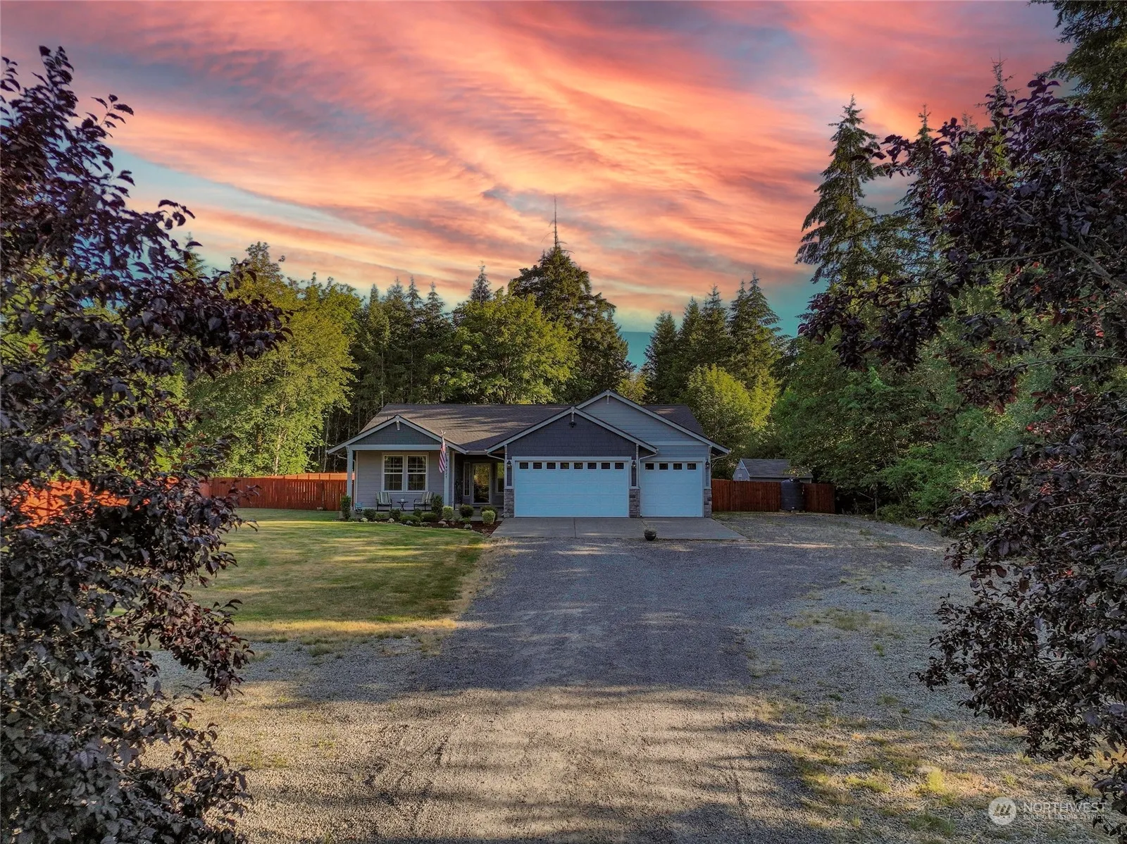 Secluded 5 acre rambler with exquisite landscaping and a tree-lined driveway. Step into an inviting open floor plan boasting beautiful flooring and elegant finishes. The spacious living room features vaulted ceilings and a striking stone fireplace. The kitchen is bright and functional, offering a pantry, ample eating space, a sprawling island with stunning quartz counters, and tile backsplash. All 3 bedrooms are generously sized, including a luxurious 5-pc. primary bath with a walk-in closet, and an additional bonus room! Outside, a large covered patio overlooks the fully fenced backyard. Additional highlights include a massive 3-car garage, tankless water heater, heat pump, RV parking, and wired for a generator for ultimate convenience.
