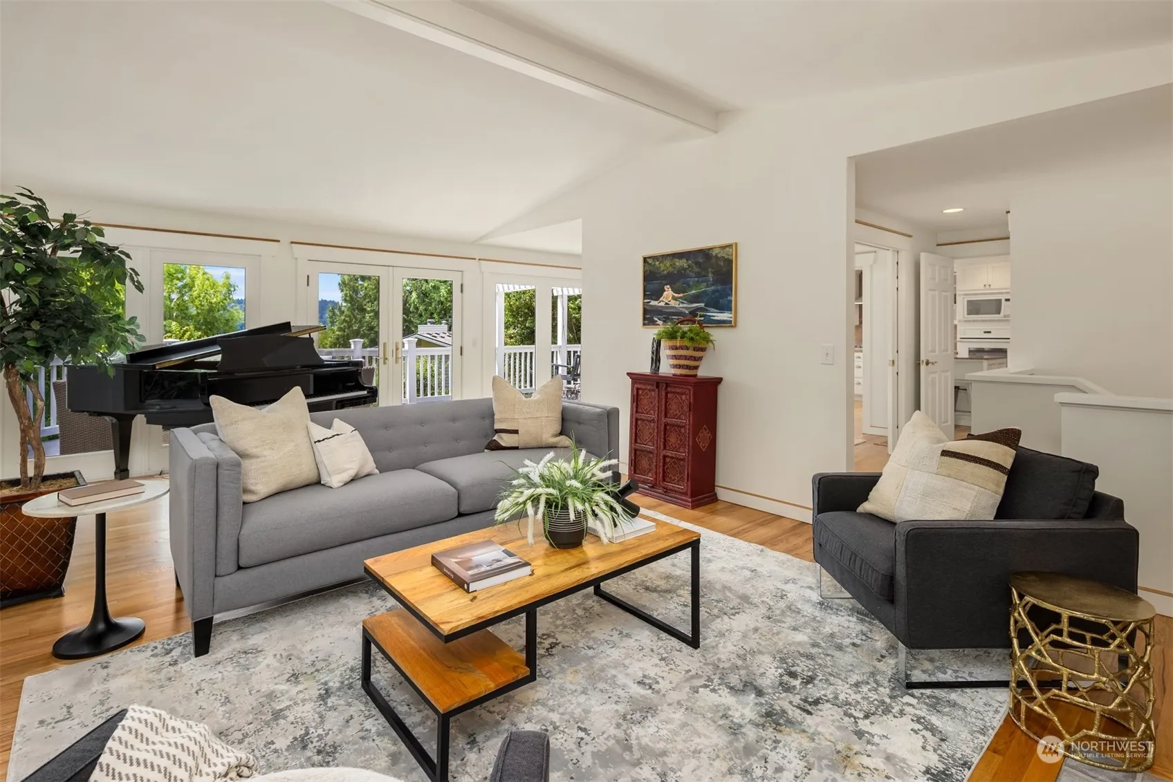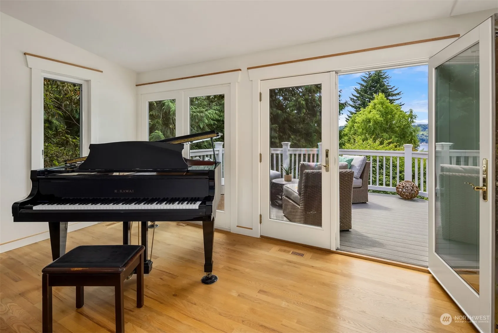 Spacious, flexible layout with views of Rich Passage! New deck faces west to enjoy the water view and sunsets. Large living room with vaulted ceiling opens to the deck and view. Freshly painted inside and out, new heat pump in 2020. Home was fully remodeled in 2002 adding a 2nd primary suite, family room with river rock fireplace, two flex rooms, 3/4 bath and a dark room! Hardwood floors throughout main. Lower level includes bedrooms and extra rooms that can be used for a home gym, office, art studio, or guest space. Lovely outdoor spaces with a variety of PNW trees, lawn, patio, greenhouse & terraced gardens. Located in a sunny community of 22 homes that share a trail to the private beach- 364 ft of deeded waterfront on Crystal Springs.