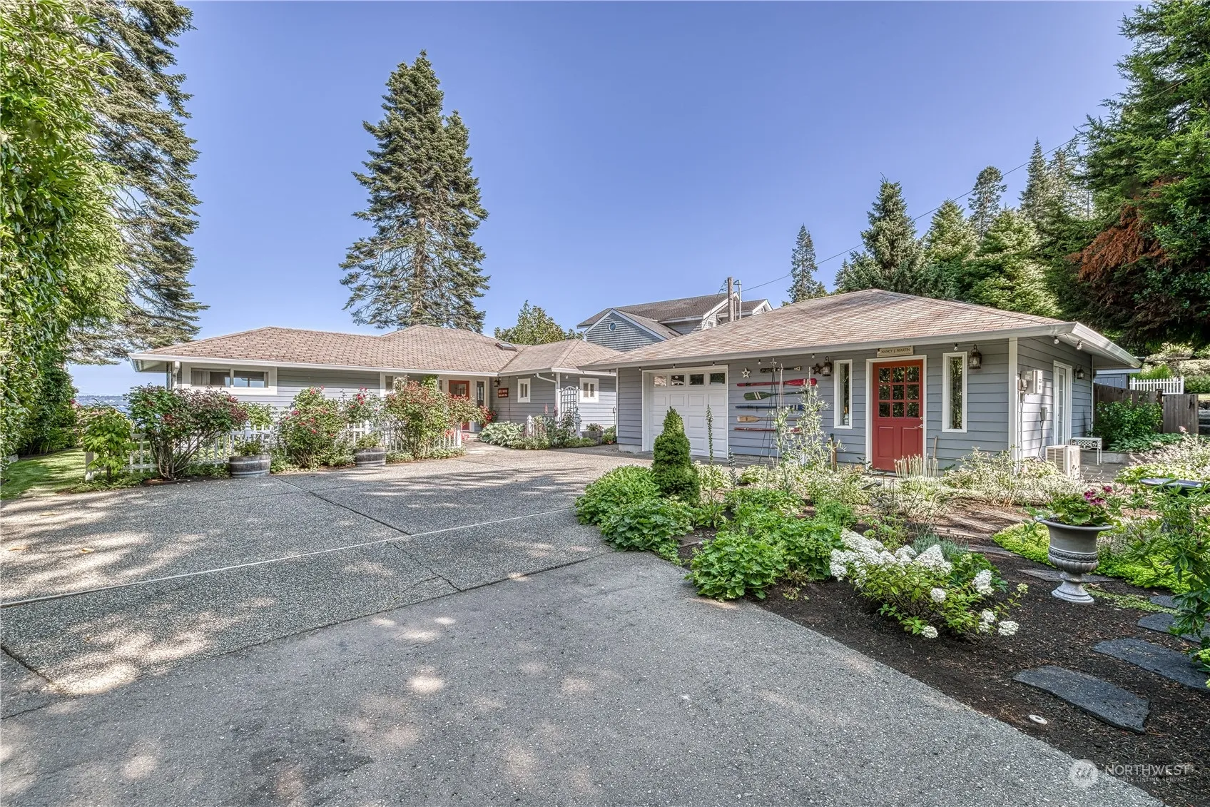 Seaside paradise w/unobstructed views of Apple Tree Cove! .75 acres of waterfront w/beach access! This gem captures your heart while upgrading your lifestyle. Fully updated, single level w/ a separate additional 400 sqft unit w/ garage & heatpump. Lush gardens & mature landscaping. Gleaming Peruvian olive wood floors & custom mill work throughout. Primary on main w/ spa bath. Host parties w/ a gourmet kitchen & spacious dining rm that opens to the oversized covered deck featuring a propane bbq line for the perfect indoor-outdoor living experience. Captivating views of the Cascade Range & shipping lanes! Garage w/epoxy finishes, new insulated doors w/ an attached BONUS RM! Tranquility w/convenience mins. to amenities, restaurants, & Ferries.
