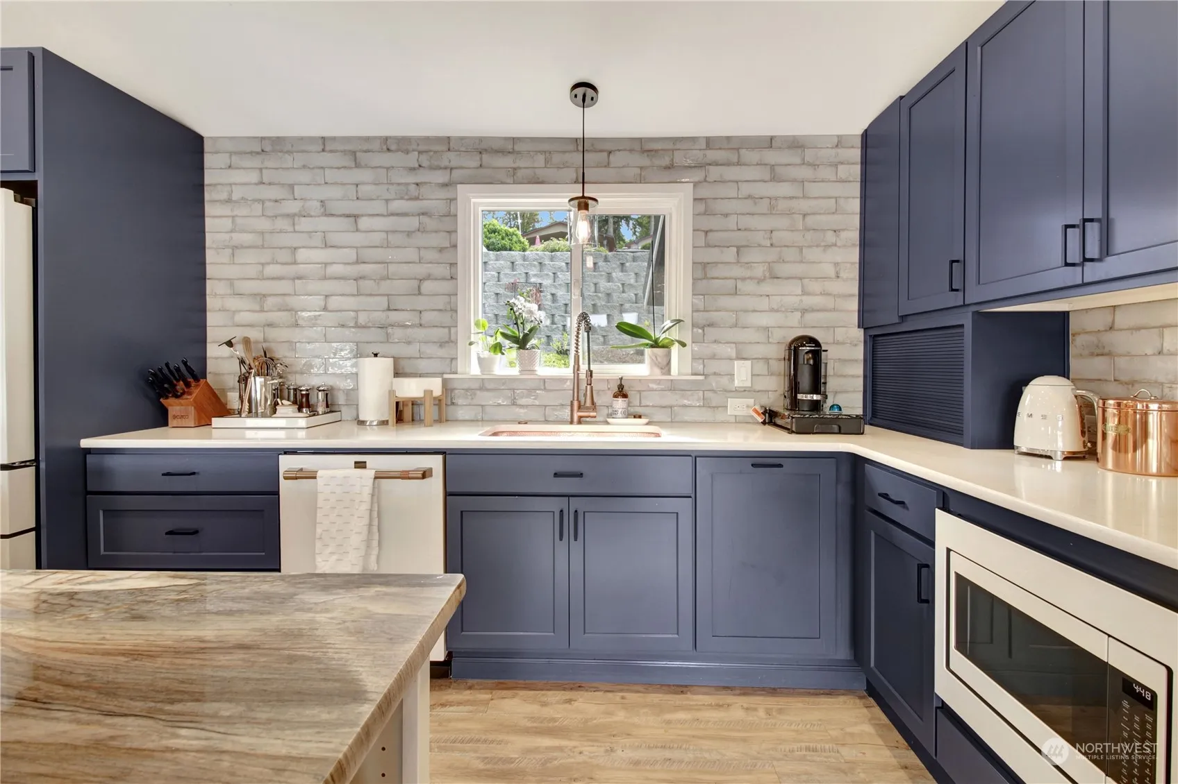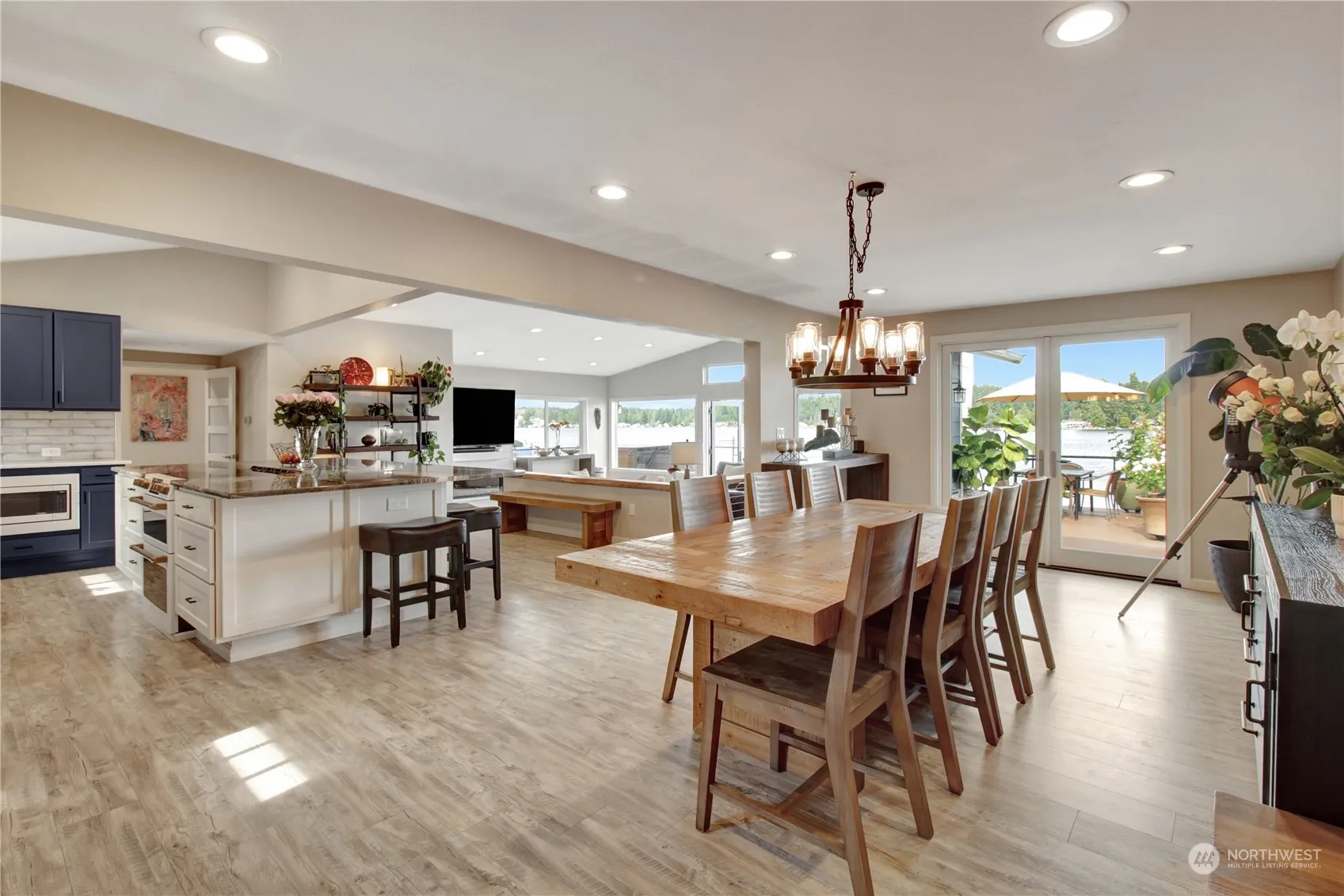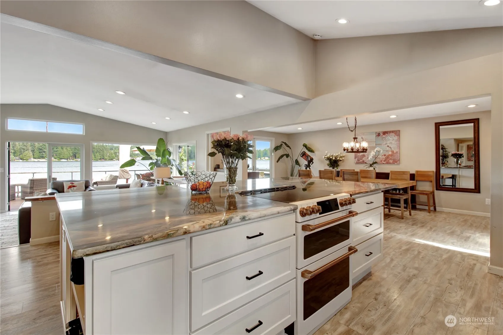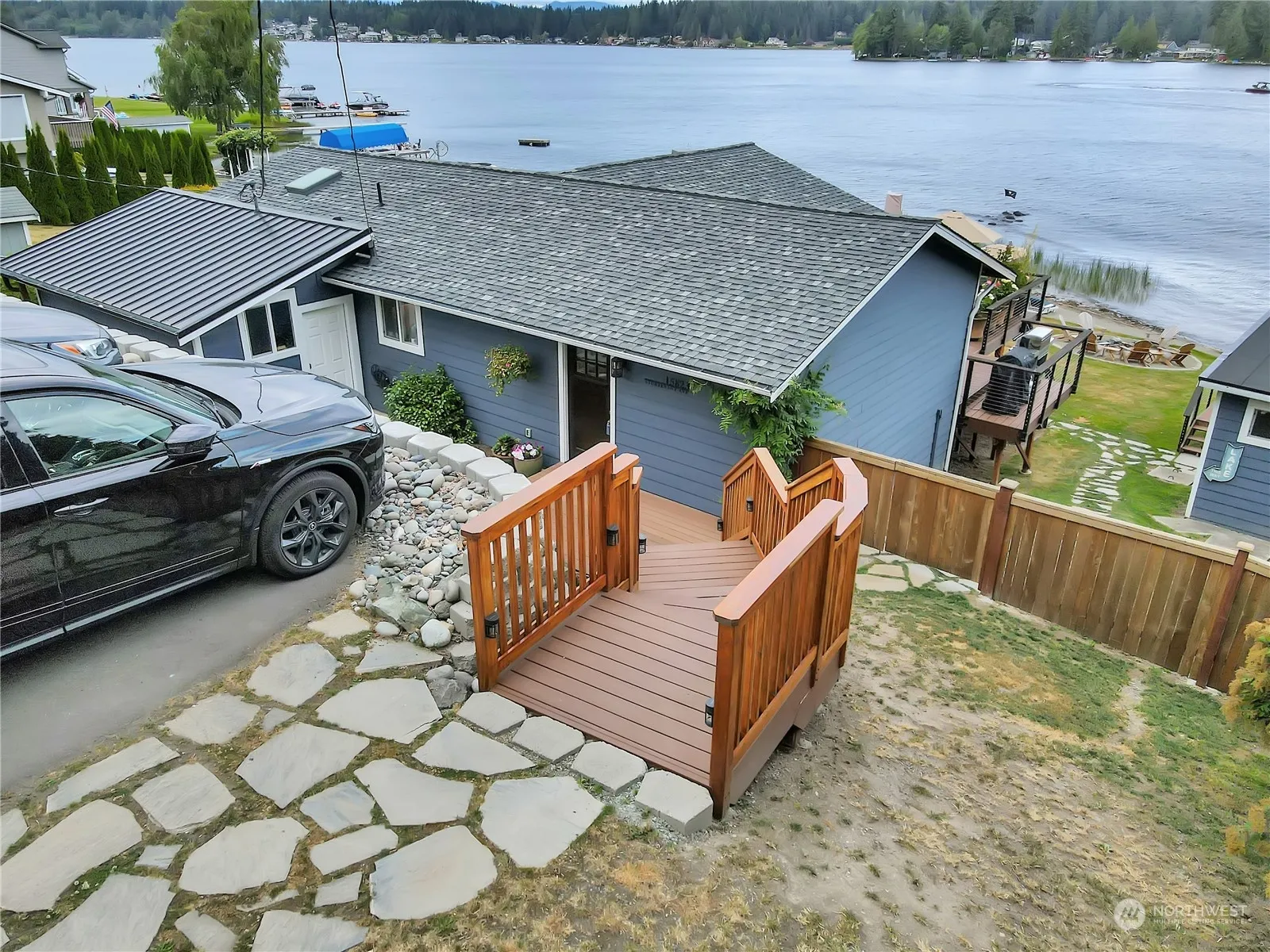 {BEST VIEW ON THE LAKE} From this fabulously appointed rambler w/ basement on a huge Lake Goodwin lot! Every inch of this lot is landscaped. Raised flower/veggie planters, flagstone walkways, sandy beach & more! Expansive composite decking, cabled railing, salt water hot tub, exterior lighting & amazing firepit! Inside, enormous Italian granite slab on island, custom cabinetry, double oven, live edge wood accent w/ custom lighting and linear fireplace as the focal point in LR. DR w/ built in bar too. 3 sets of French doors to deck, 2 master suites! Dock with covered boat lift & guest/bunk house has 3/4 BTH & kitchenette for overnight guests! Parking for 6 vehicles – an abundance of storage under home & at front of home! TOO MUCH TO LIST!!!