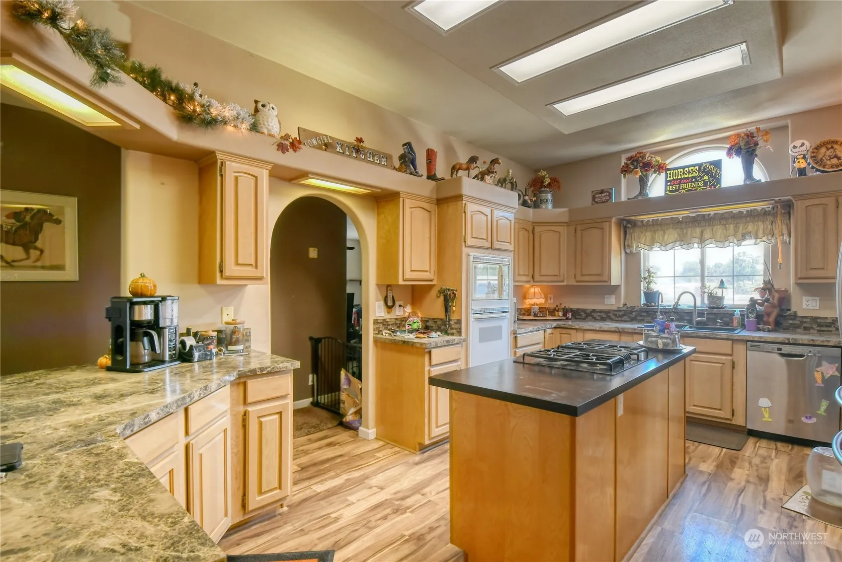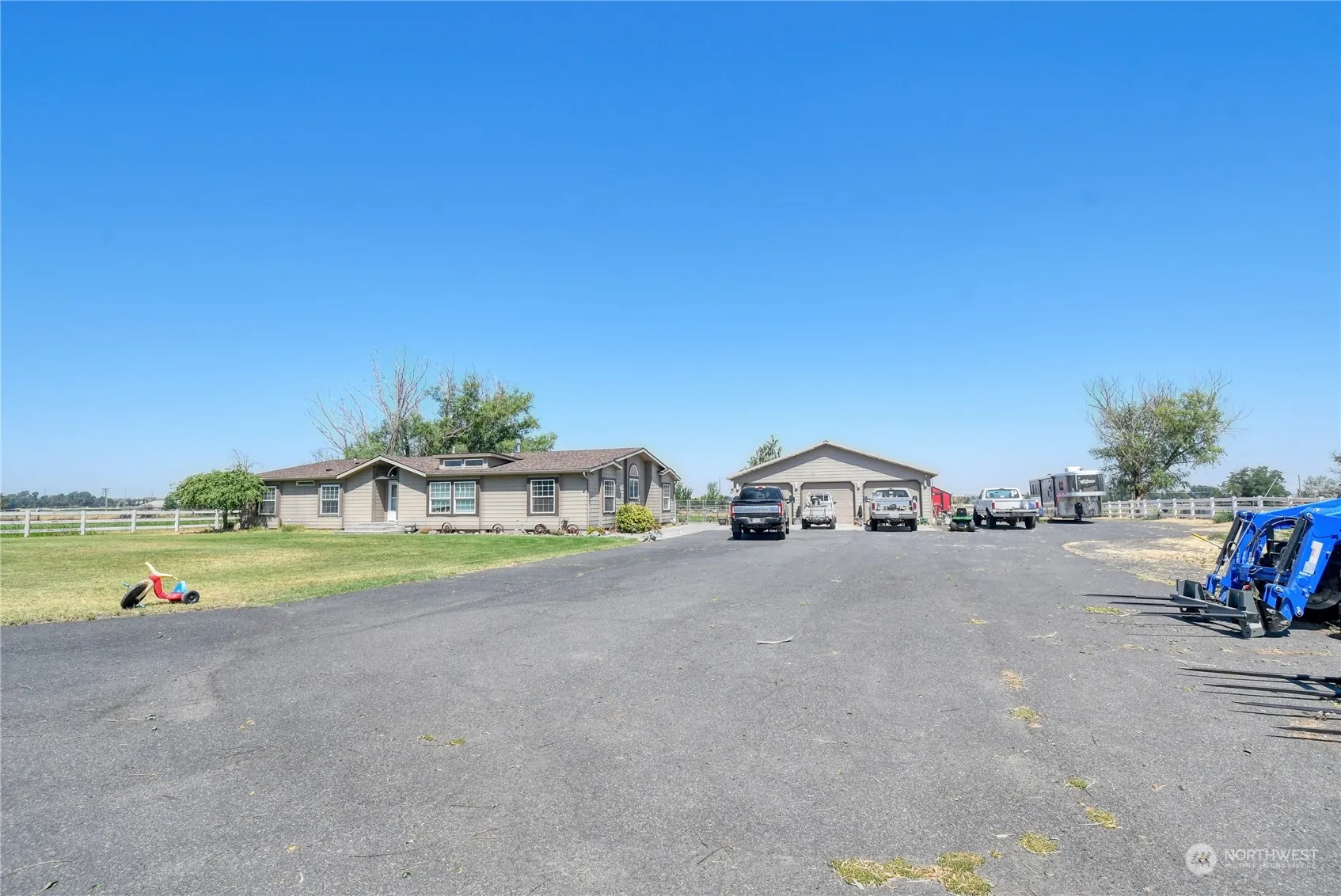Newly listed, quiet and peaceful home in the countryside! Adjacent property is also for sale. This spacious 3-bedroom, 3-bathroom triple wide manufactured home sits on nearly 6 acres of picturesque land with water rights, offering a perfect blend of comfort, tranquility, and versatility. Discover generous living spaces ideal for relaxation and entertainment, with the triple-wide layout ensuring ample room for everyone. The expansive land is ready for your gardening projects, livestock, or potential future expansions. Set up for horses, cows, chickens, or other animals, this property includes outbuildings designed to make animal care convenient. A large workshop provides ample space for hobbies, crafts, or storage of equipment and tools.