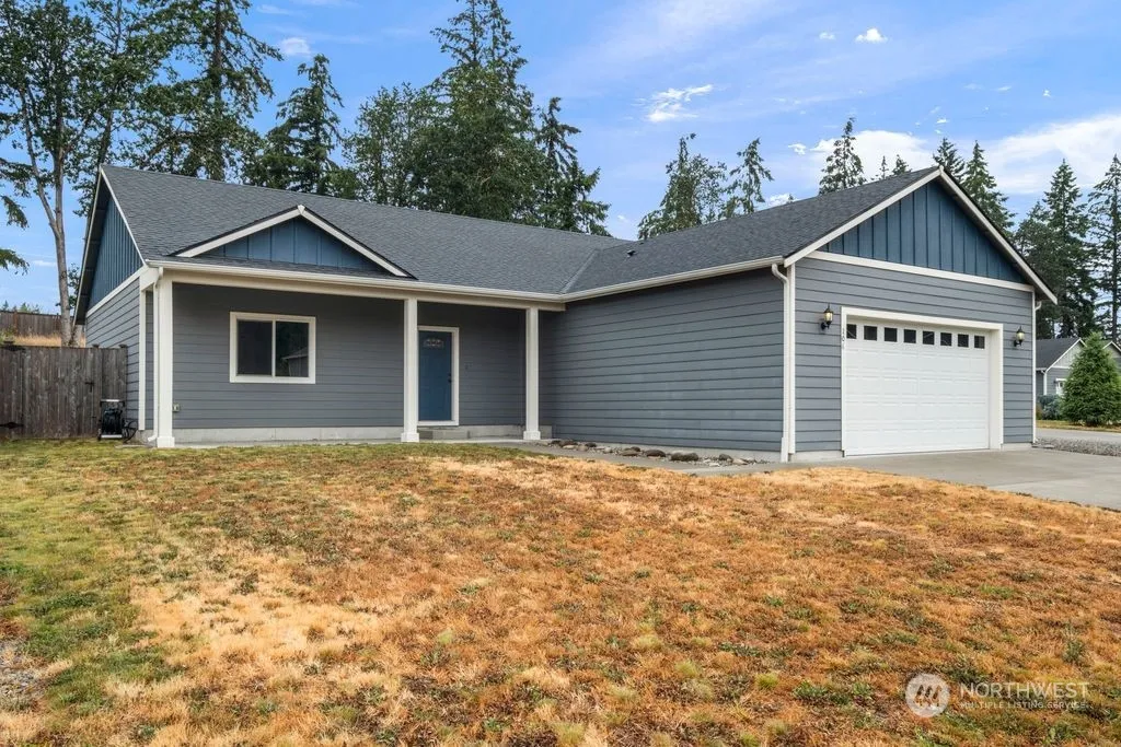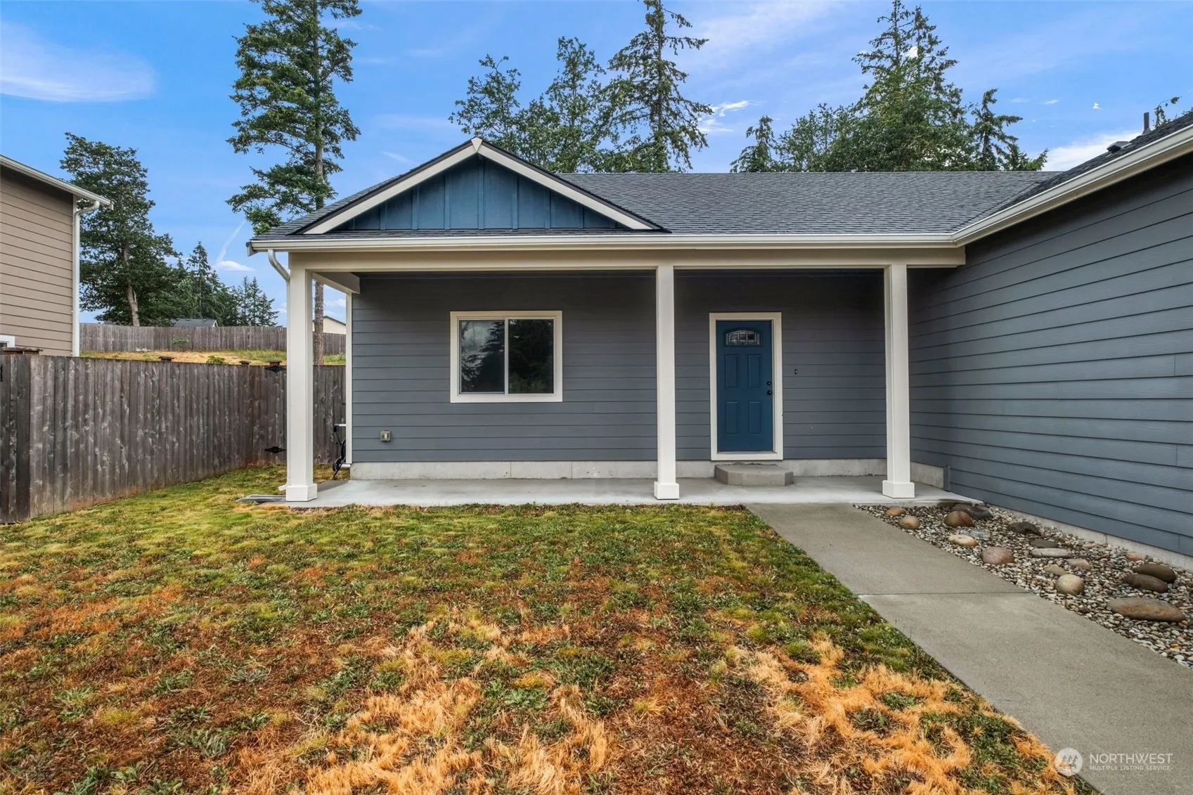 Welcome to this adorable, single-story home on quiet street with cul-de-sac. Home was built in 2017, single owner, and features an open floor plan with a split bedroom design. Primary bedroom sits on one end of the home and features a 5-piece bath. Remaining two bedrooms on opposite side with a bathroom positioned between. Open concept kitchen /dining /living area with 9-foot ceilings through-out. Fully fenced backyard that sits on almost a third acre lot provides lots of landscaping potential. Home has a covered front porch and large garage leading to the utility room w/sink. And bonus- this beauty has a heat pump providing year-round comfort to complete this perfect home! Short commute to Lacey and JBLM.