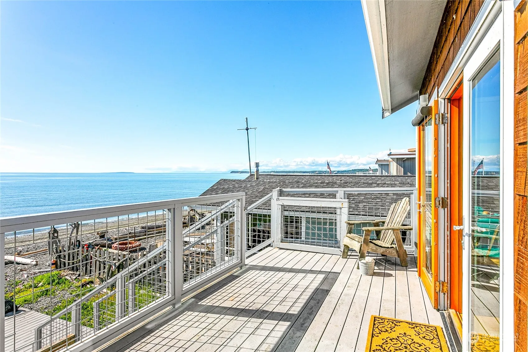 Serenity with a little sass in this west facing 4 bd, 1.75 bath sunny sanctuary with 50 ft of no bank saltwater frontage & stunning views of the Strait of Georgia, San Juan Islands, Mt Baker & Twin Sisters. Newly refinished birch floors, painted maple cabs w/slab granite counters, soaring ceilings w/walls of windows, three view decks, fir/hemlock doors & trim thru-out; floor-to-ceiling slate walk-in shower w/custom copper fixtures. 40-year standing seam metal roof, interior wood wrap Jeld-Wen windows, mini-split heating & air-conditioning, freestanding gas frplc, recent interior & exterior paint. Custom built one-owner home can’t be replicated for this price. Easy full-time or part-time living or lucrative VRBO. Pre-inspected.