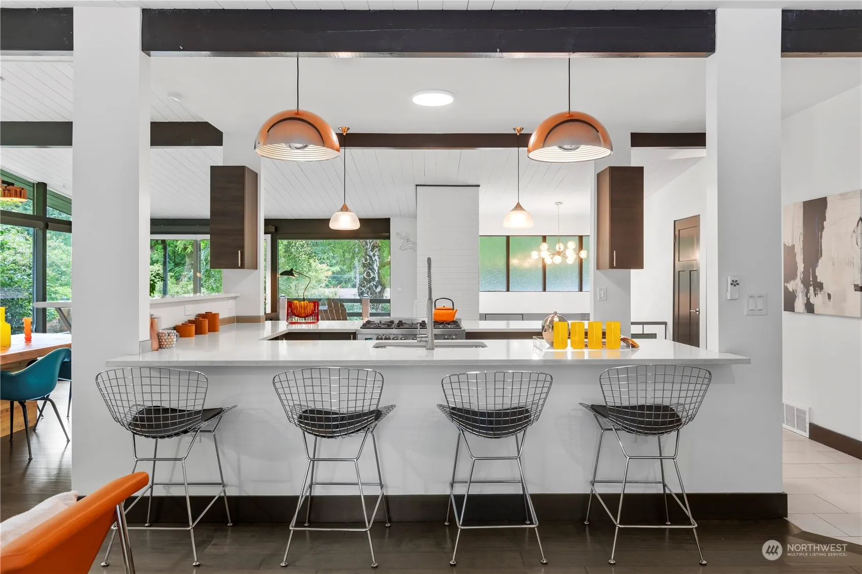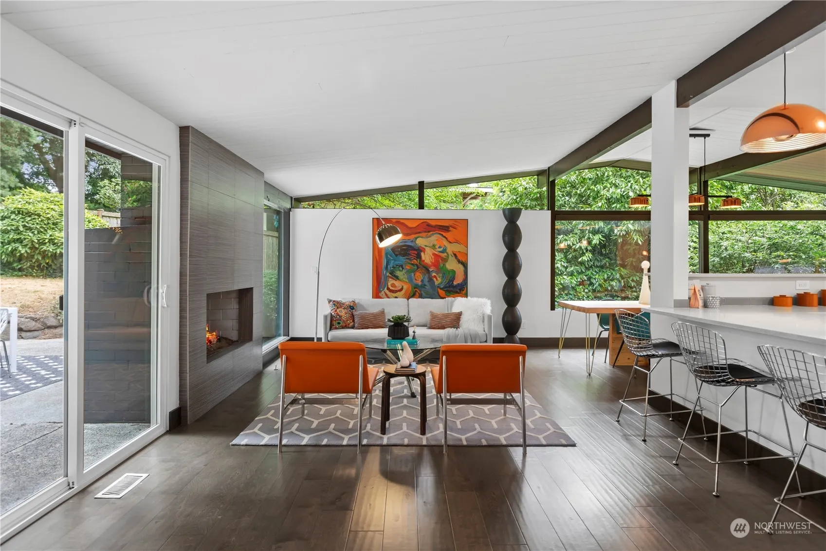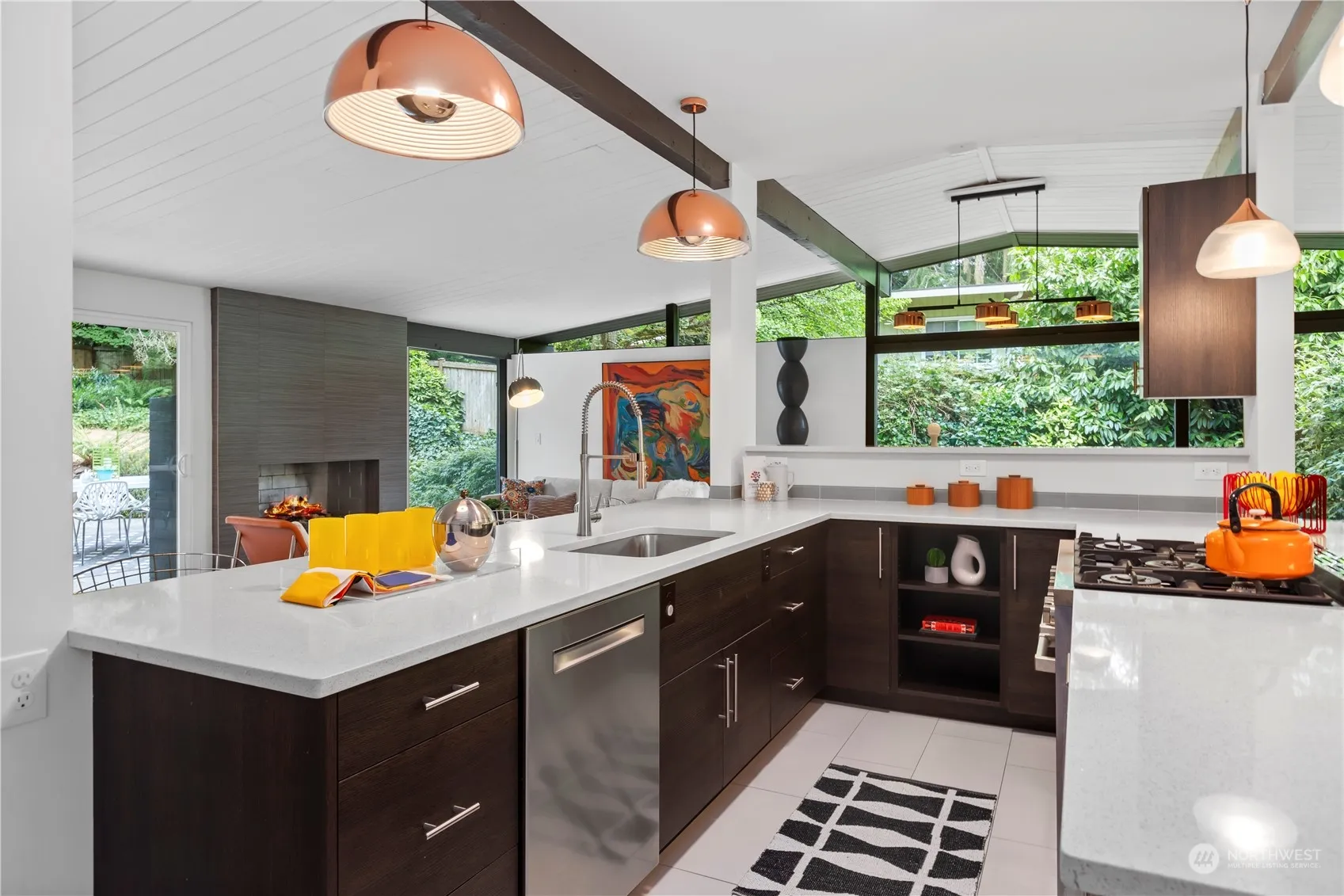 Impeccable. Stylish. Serene. Bask in nature & dappled light from this swanky MCM home featuring carefully curated modern updates seamlessly blended w/original architectural design. You will love the sprawling floor plan that lives like a rambler w/ FIVE bedrooms on the same floor. Huge great room is surrounded by windows overlooking the completely private yard w/ rad treehouse! An ideal entertaining home w/ easy flow inside & out. Open kitchen where all can gather features colossal walk-in pantry. Decadent primary suite has vaulted ceilings & spa-like bath. Downstairs is a media room w/ gas fireplace & lots of storage. A/C! New roof/gutters 2021. A private sanctuary seemingly miles away from the bustle, yet only minutes to downtown Edmonds.