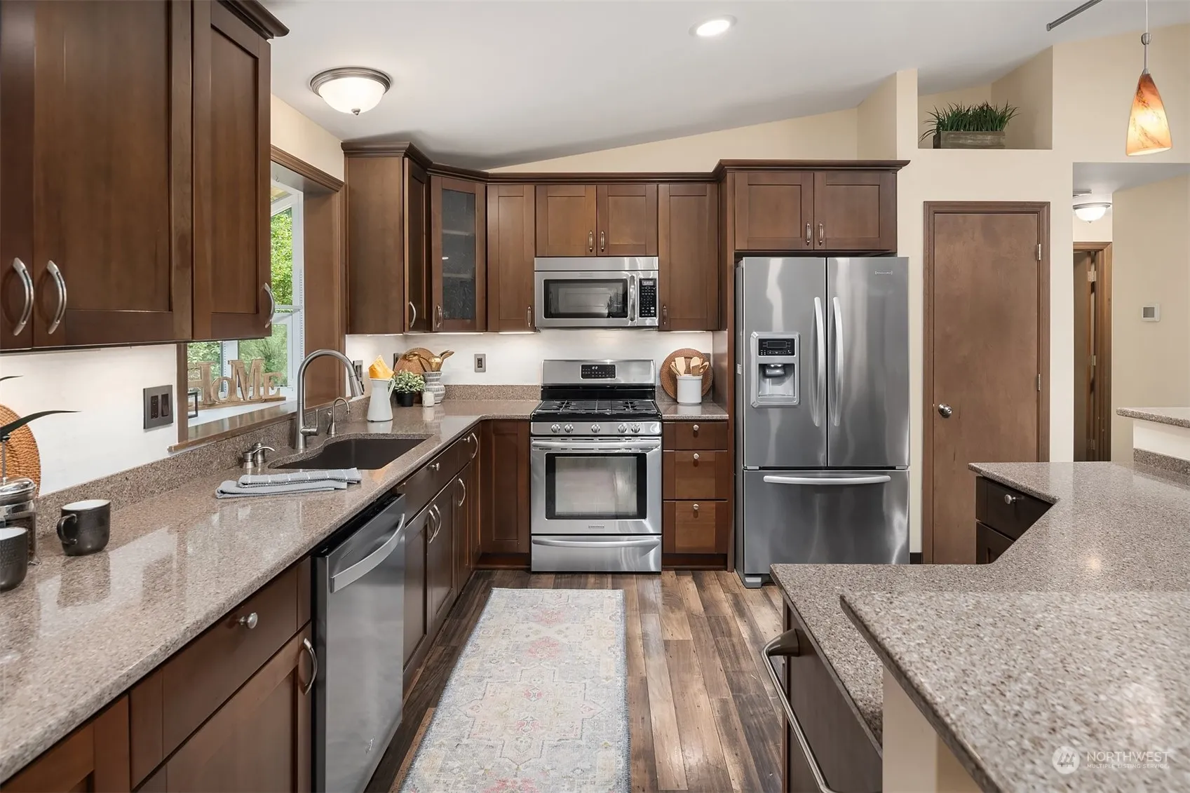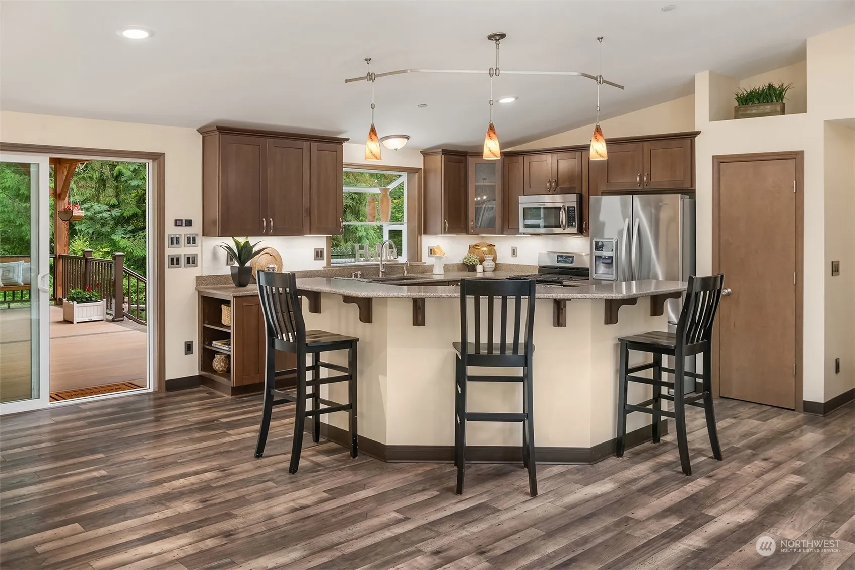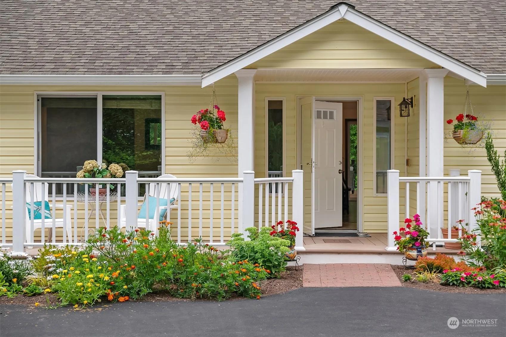 Come home to a sanctuary! Stunning 2204 SF Rambler nestled on 4.79 private acres. Desired open-concept floorplan w/3 large Bedrooms, 1.75 BA & Bonus Room. Vaulted ceilings & skylights for spaciousness & light. Kitchen features stainless appliances, quartz counters & soft-close cabinetry. Primary Suite w/double vanity bath. Bonus Rm attached to 2 car garage w/separate entrance, perfect for home business, shop or hobbies. Newer Air conditioning/furnace & water heater. Custom closets & storage galore. Enjoy outdoor living w/massive covered deck w/gas fireplace wired for TV & heated for year-around use! “Deer-proof” raised garden beds, 2 sheds, fire pit, RV Parking! Wired for generator. Truly special and only minutes to town and all amenities.