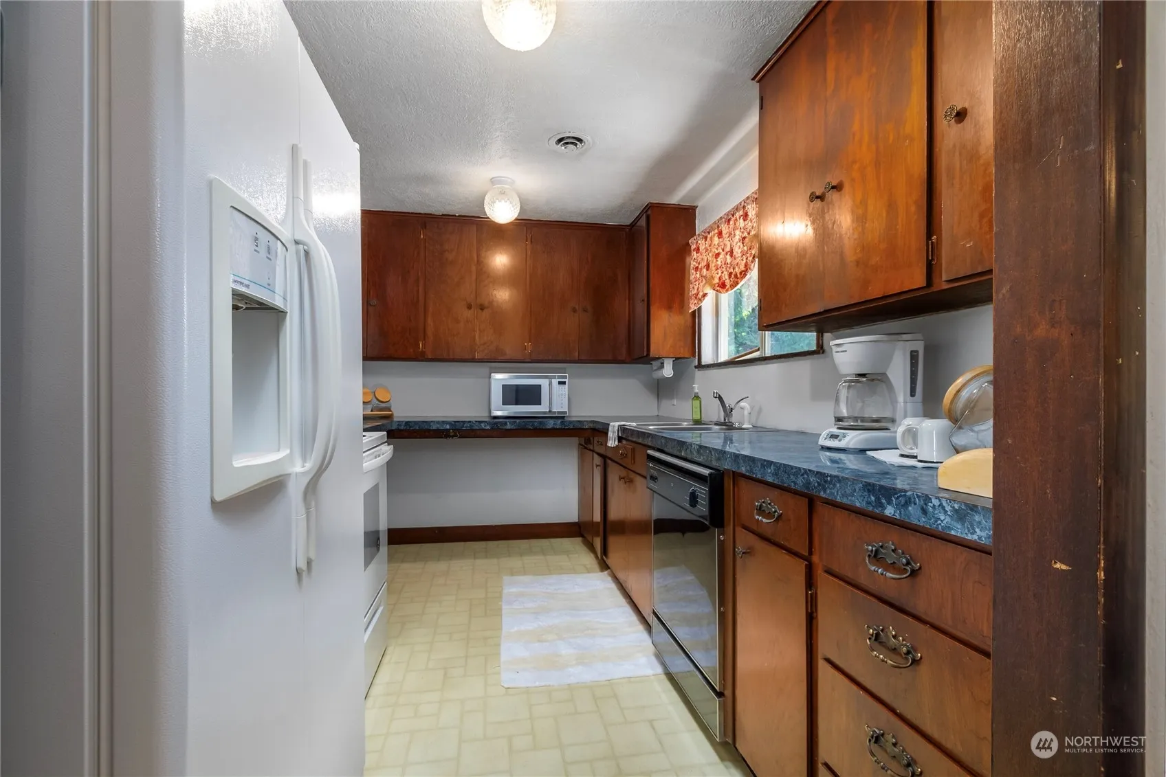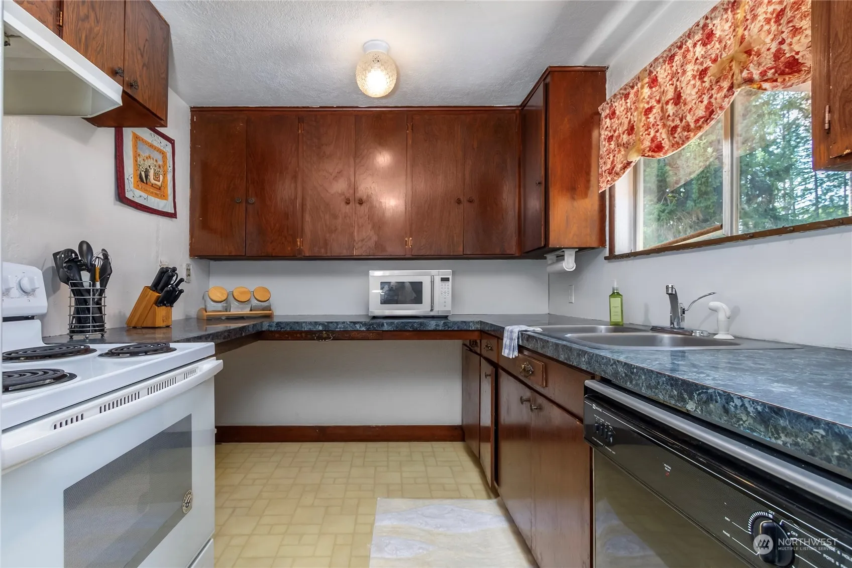 This 3 bed 2 bath house with massive garage is in a great location! The house is 1540 sq ft and the garage is 1288! Galley style kitchen with plenty of countertops and a dishwasher. Walk-in closet and .75 bath off of the primary bedroom. Pellet stove in living room. Private well located in garage. The back yard is fully fenced and there is a pet door. Large back yard with patio, and basketball hoop. Fish pond by back deck, just bring your own fish! Off street parking leads to two parking spots in the garage and two distinct work spaces, plus a wood shed behind. 3 minutes to nearest school and 4 minutes to the nearest grocery store. Easy driving distance to Mt Rainier, Mt St Helens, hiking, fishing and more.