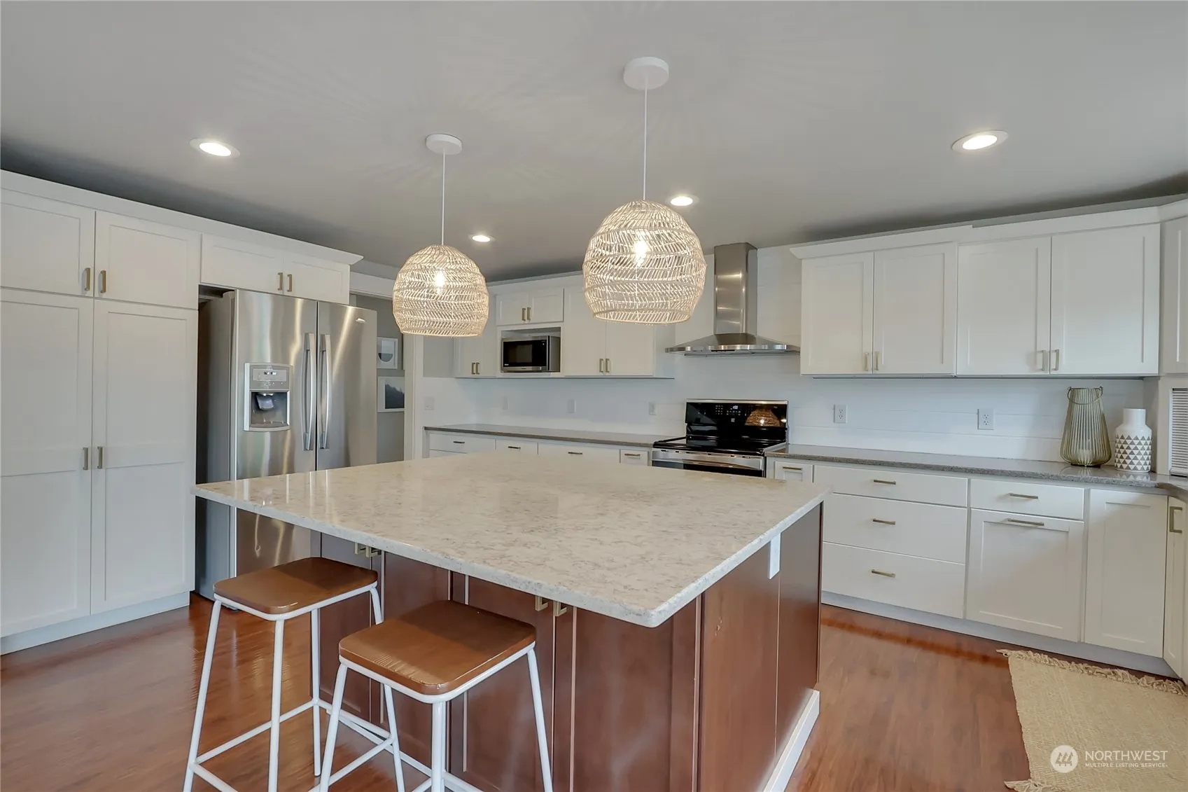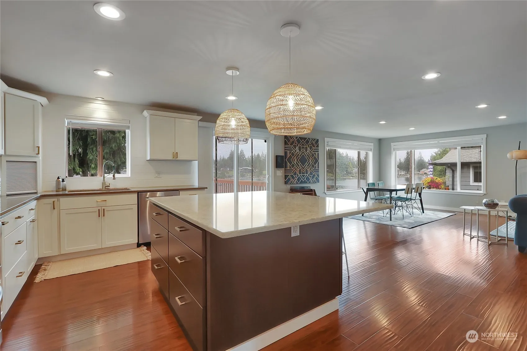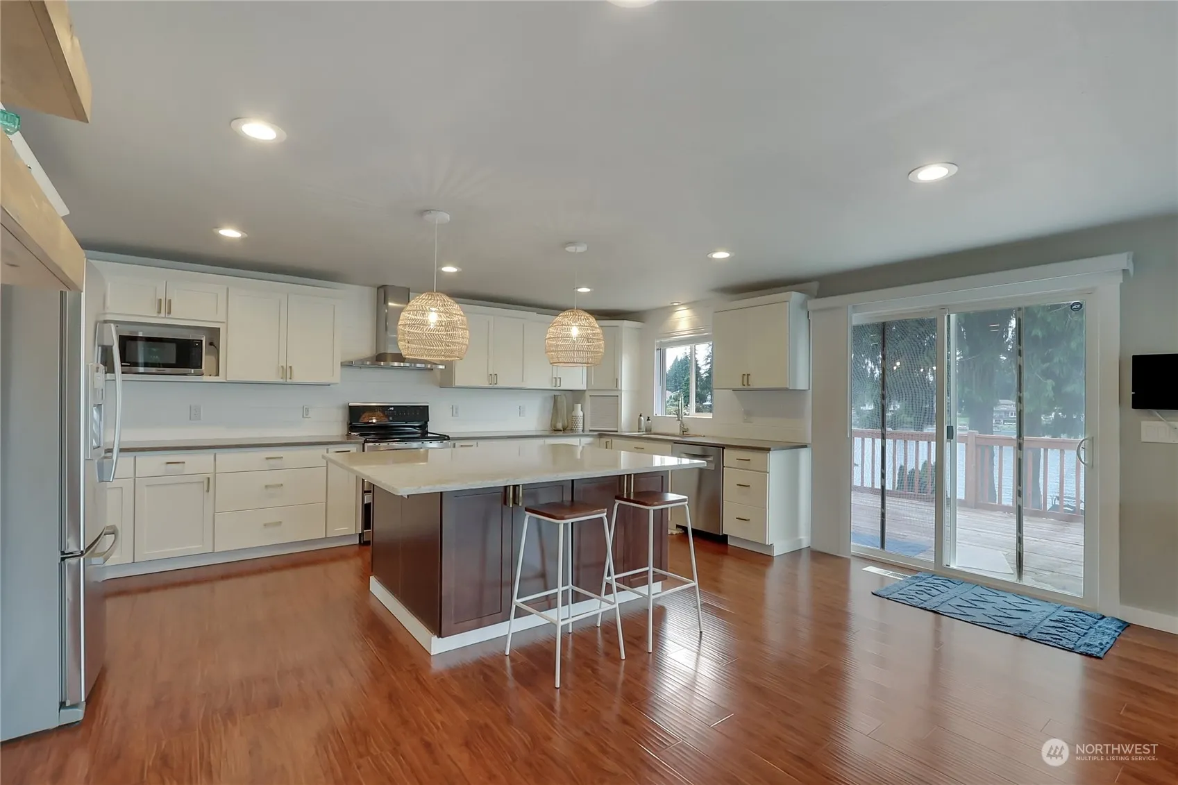 Waterfront living is now a reality! This 3000sf home on Driftwood Point offers 4 bedrooms~3 bathrooms and 70 feet of fenced waterfront. Upper kitchen features large island~stainless appliances~quartz counters and plenty of space for entertaining. Stunning lake views with a Mid Century Modern vibe in both upstairs and downstairs living space. Choose your primary bedroom or create your own vision of living. New lower level kitchen with wine fridge~dishwasher~ice maker~floating shelves~tile wall and new flooring. Huge utility rooms on both levels for all of your storage needs. Room to roam in the expansive newly fenced yard offers garden boxes~shed~sprinkler system~dock and boat lift. New A/C for the summer days. See you on the water!