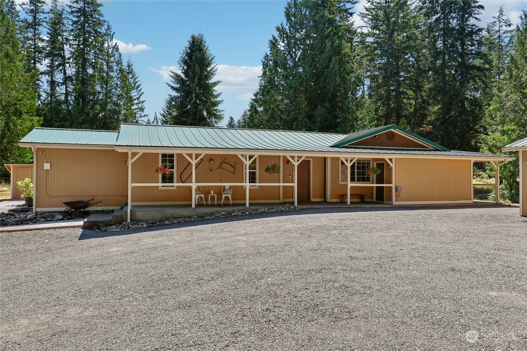 Welcome to this 5.76-acre mini-farm! This property boasts 3 BR & 1.75 BA w/2,092 SF of finished living space. The LR has a propane FP for comfortable living. Expansive Primary has propane FP, WIC & updated BA w/heated flooring. The updated KIT is a cook’s dream w/SS appliances, quartz countertops, large WIP & laundry. Mudroom w/sink next to fully updated bath w/heated flooring & jetted tub. Featuring AC & forced air and wired for generator. Pus 3 covered decks/patios. Also private well, automated gated, partial fencing, insulated 3-bay garage w/carport/equipment storage, covered 3-bay RV storage, 2-stall barn w/storage, greenhouse, fenced garden & round coral. The lower section has power meter, possible subdivision or additional building.