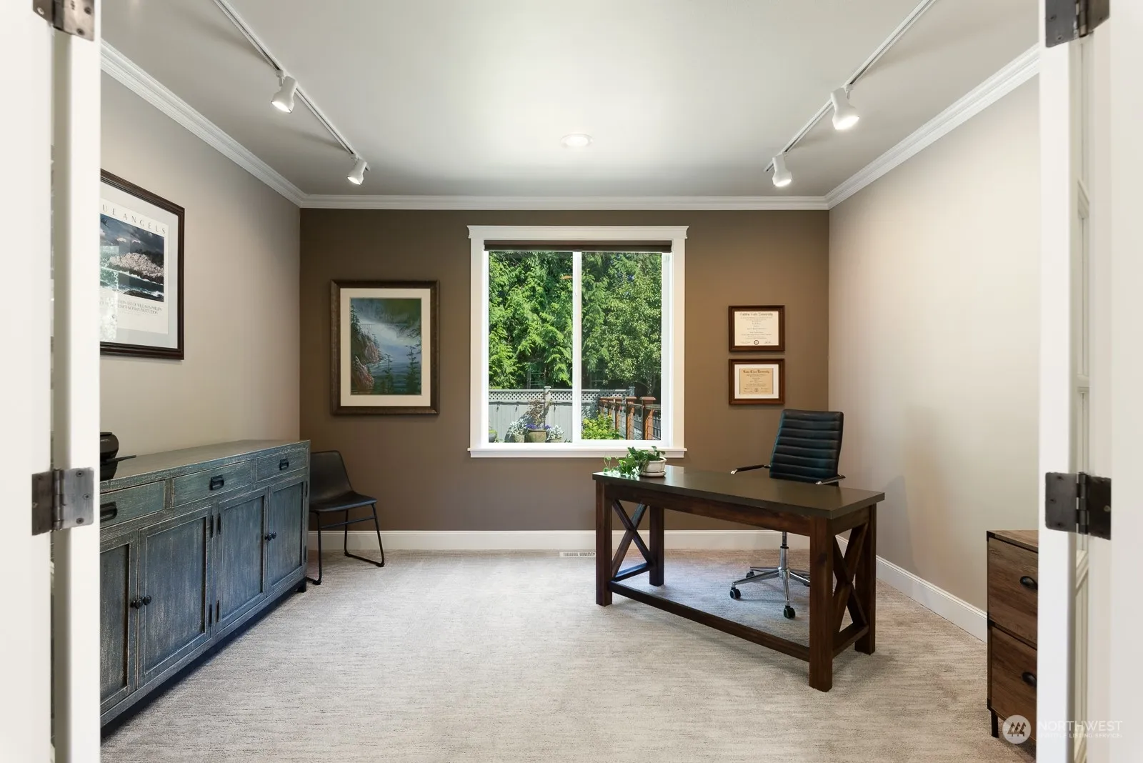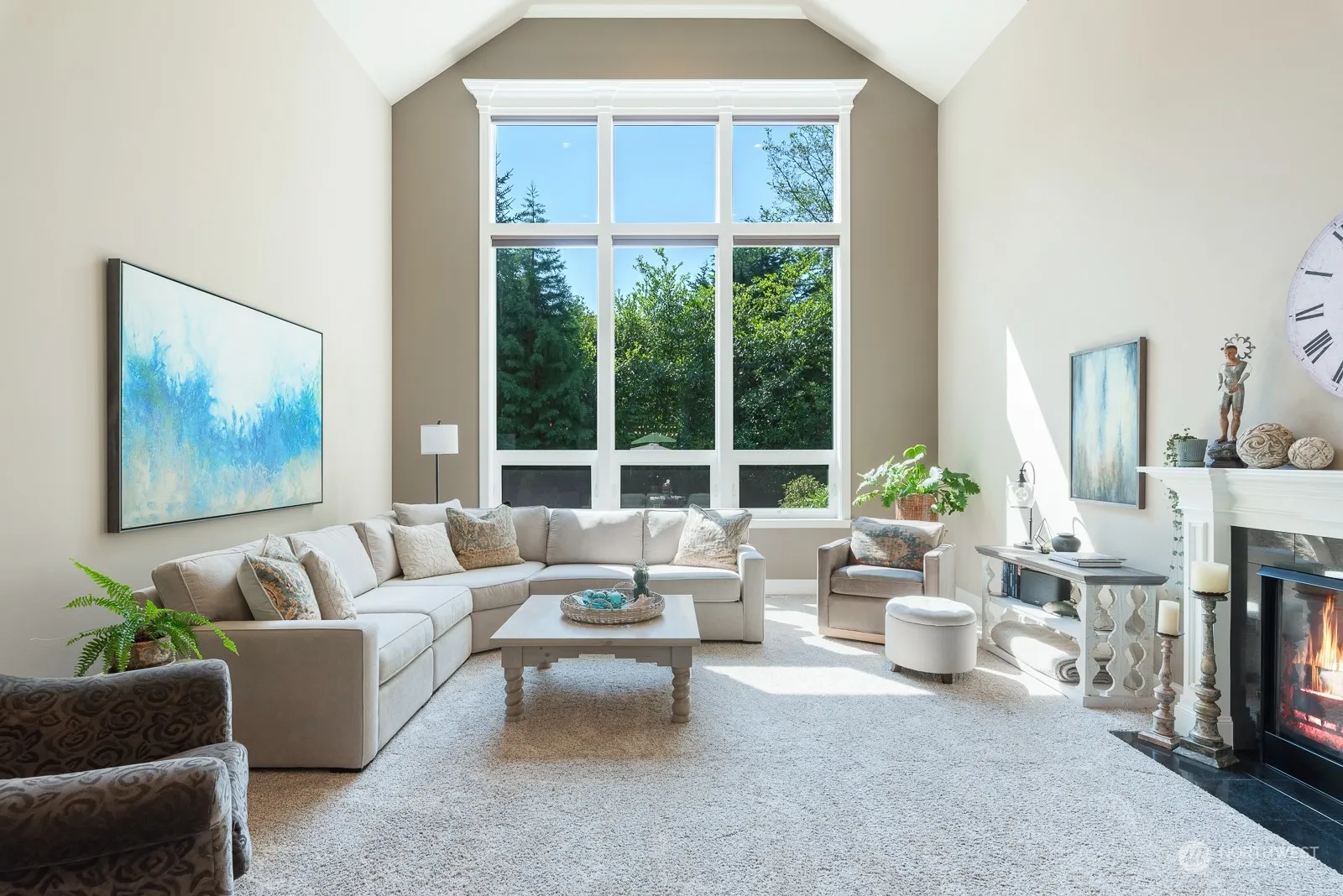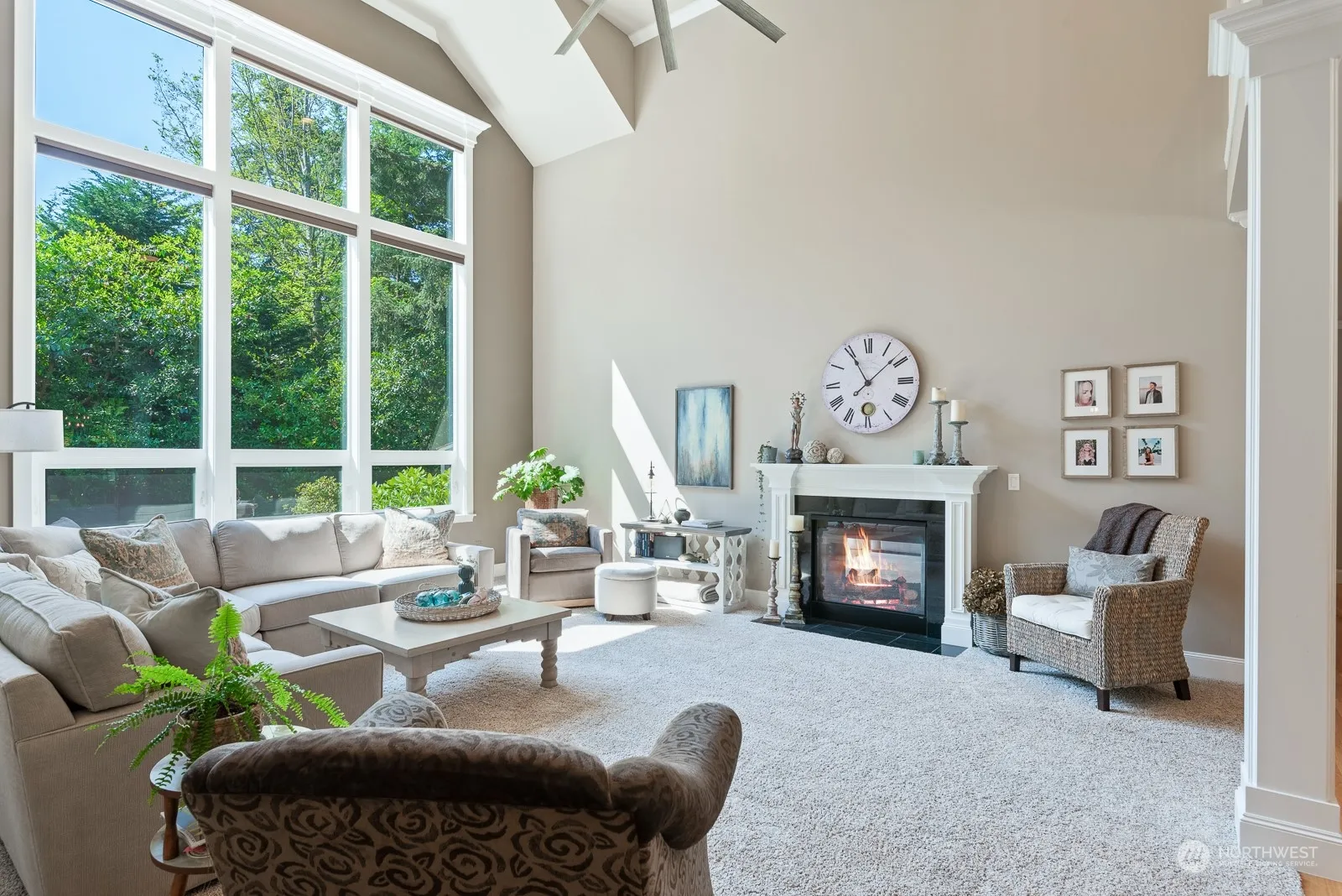 Truly remarkable inviting home. Well situated for privacy in the picturesque Parkside neighborhood. This home has it all featuring sunlit soaring ceilings flowing around into living room which provides open living with dining & see-thru fireplace to family room joining the show stopping kitchen-floor to ceiling marble tile, quartz counters, 2 ovens, walk-in pantry. Calming primary suite offers cozy fireplace, private balcony & 5-piece ensuite w/walk-in closet. Addit 2 bdrms, full bath, laundry & large 4th bdrm or bonus rec room w/murphy bed, office & powder. French doors off the dining area to fenced patio with turf, beautiful waterfall & lush plantings. Incredible parklike outdoors, not one area left unaware. A place to come home & relax.