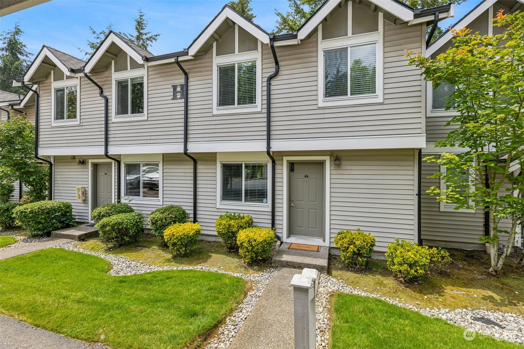 MOVE IN READY! Enjoy all Mill Creek has to offer with this gorgeous 3 bedroom 2.5 bath townhouse located directly across from the Mill Creek Town Center, shopping and restaurants. This unit offers soaring vaulted ceilings and open concept living. Freshly painted, new carpet and laminate flooring. The kitchen has all s/s appliances, lots of storage and cooking space. Primary offers two closets w/en-suite bath. Two additional rooms are well proportioned as well as guest bathroom and laundry space. Stay cozy this fall with the wood burning fireplace. Large balcony w/storage closet. Covered parking directly in front of unit. Community cabana w/pool, kitchen and workout area. Just mins from 1-5, 1-405 and major bus lines.