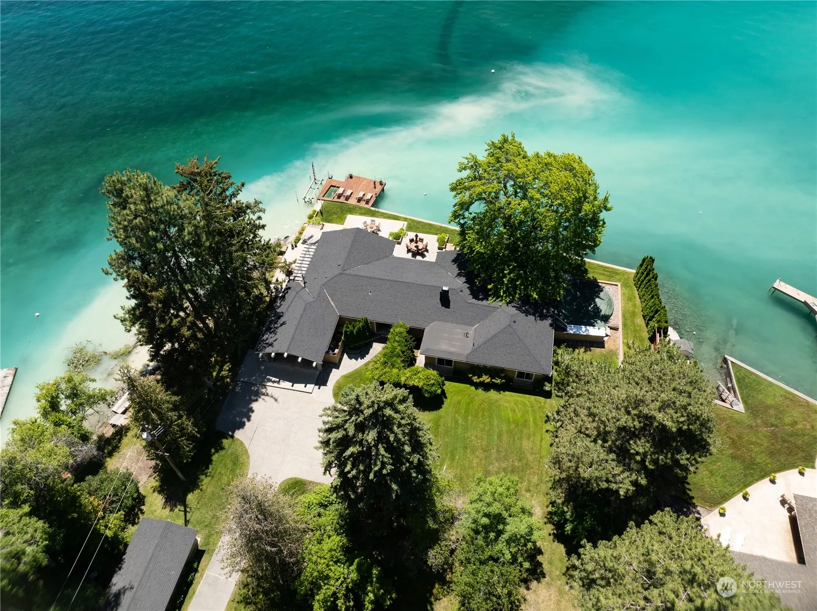 PREMIER WATERFRONT LOCATION! This desirable property on a flat end lot is the ultimate lakeside retreat, offering 140ft of waterfront & nearly 270deg of stunning panoramic views. Enjoy an open concept home designed for entertaining! This 3,372sqft rambler boasts a theater/game room, floor-to-ceiling windows, & chef’s kitchen w/ 12ft granite countertops, dual dishwashers, and wet bar. French doors open for seamless flow between kitchen & patio w/ desirable outdoor kitchen space. The waterfront features a private 20’x20’ dock, 2 boat lifts, & buoys. Privacy is incomparable on this exceptional ¾ acre property with a perimeter of mature trees. Make it your own or build your dream home in this once in a lifetime location!