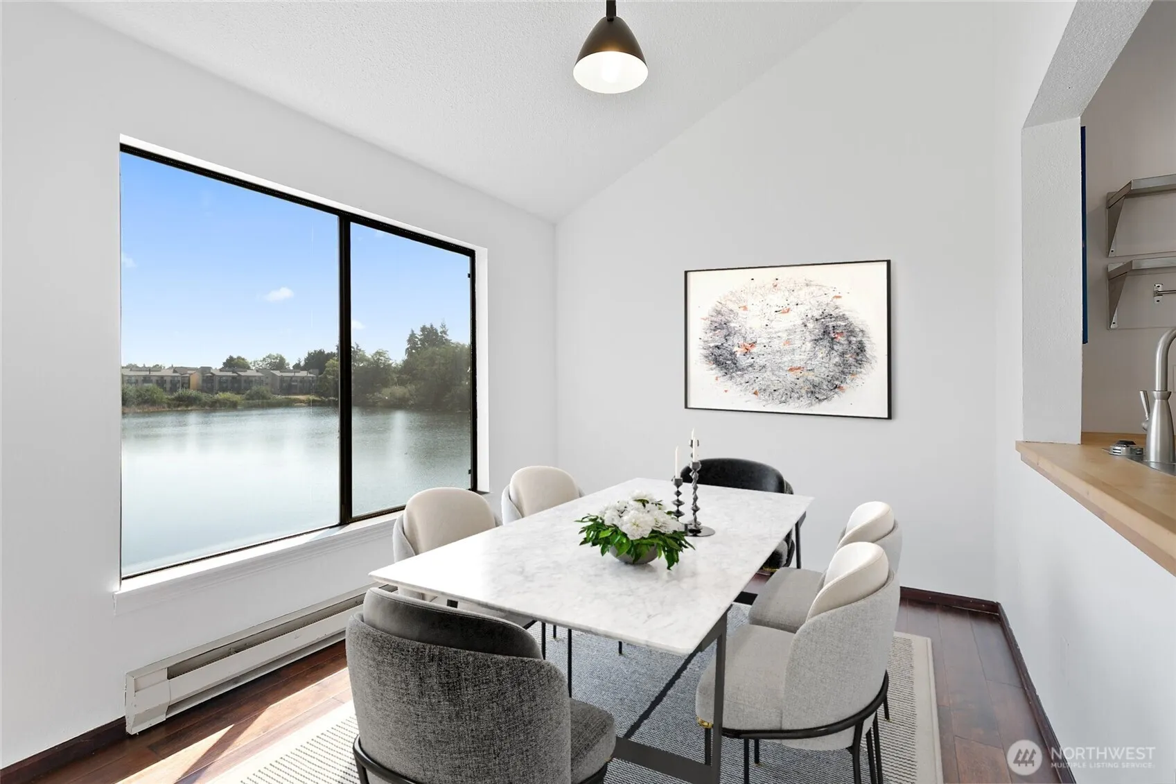 Top-floor condo in desirable Lakeside Village Condos w/sweeping views of Easter Lake! Light-filled living room boasts vaulted ceilings & a cozy wood-burning fireplace, while the dining flows seamlessly into an updated galley kitchen featuring stainless appliances, butcher block counters & floating shelves. Bathrooms shine w/contemporary vanities & sleek designer sinks. Relax on your private balcony overlooking the lake or enjoy the community’s in-ground pool, tennis & basketball courts, cabana & tranquil lakeside walkways. Conveniently located near shopping, dining, theaters, fitness & transit—an ideal blend of comfort, views & lifestyle. Welcome Home!
