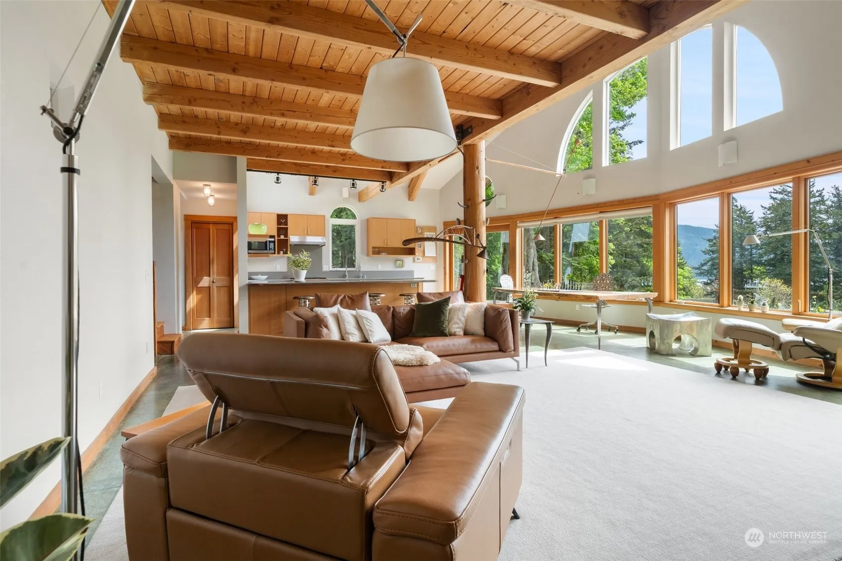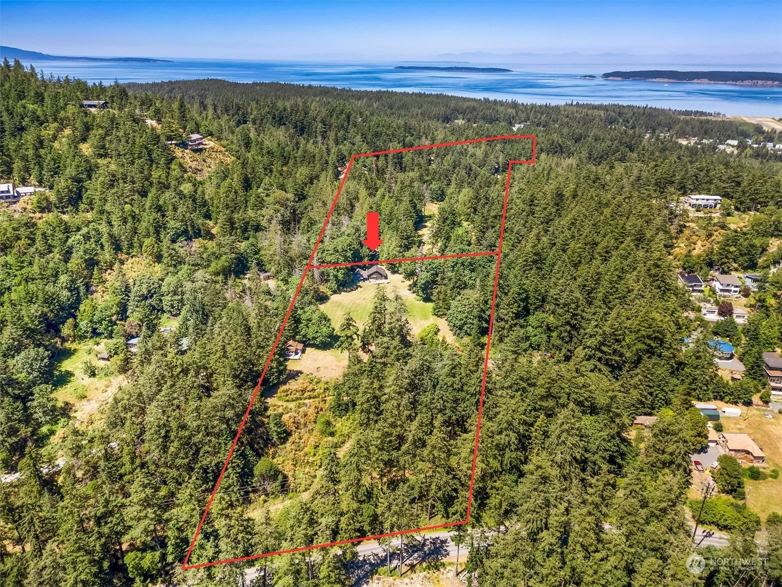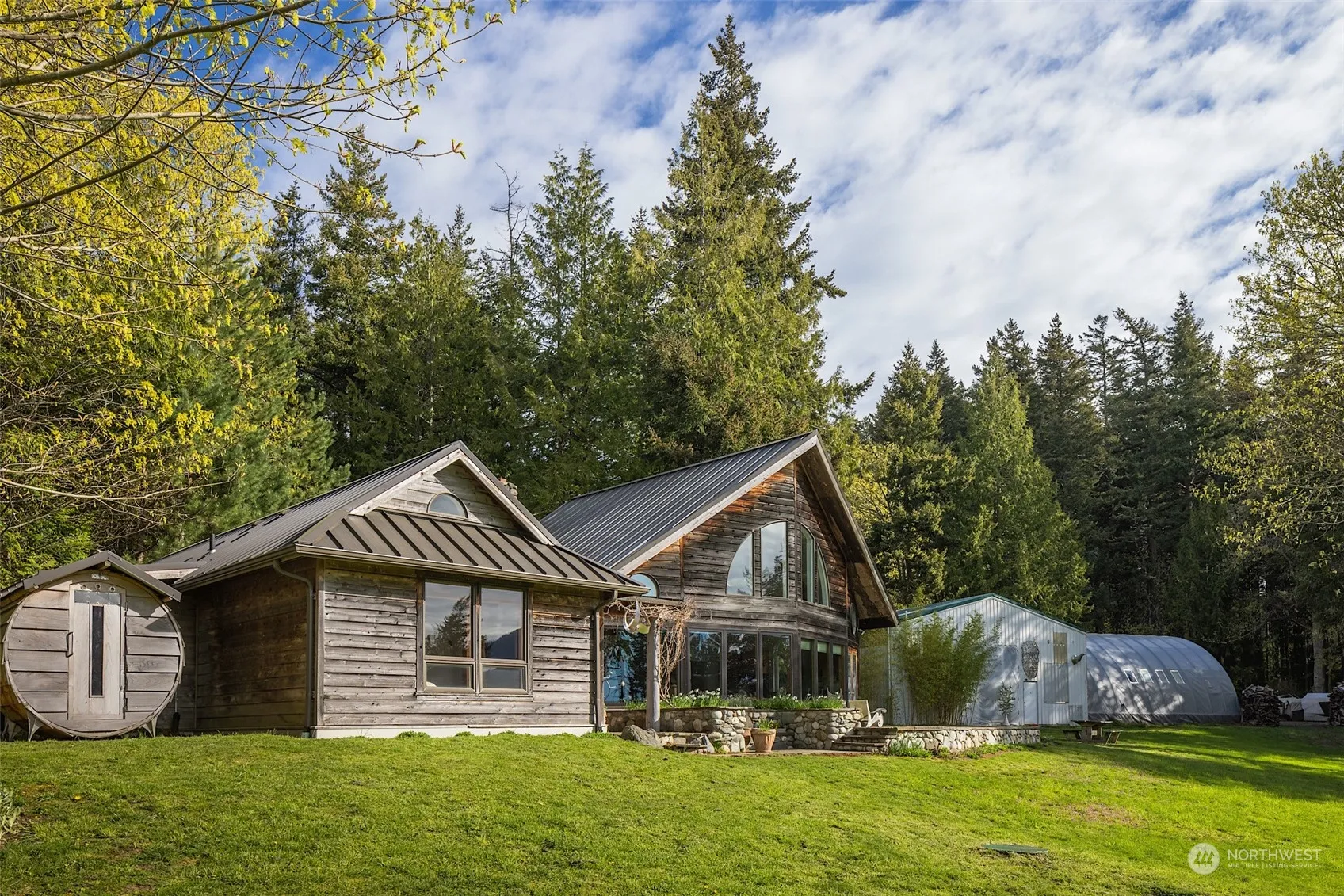 South-facing main level living w/ sleeping loft home on ten brilliant park-like acres. 1/4 mile west of Eastsound. Since 1996 this creative haven housed the home and studio of renowned PNW sculptor, Anthony Howe. Water and mountain views border the landscape, offering privacy for everyday living, gardening, animals, and the potential for a thriving cottage industry all just minutes by car or foot to shops, schools, restaurants, and the lively Eastsound Village green. The home and grounds include many artistic features and a sunny cabin with a separate driveway for guests to enjoy, which has a full kitchen, bathroom, plus sleeping loft. 10-acre lot already subdivided into two 5-acre lots, Lot B ready for site plans north of 4,000 sqft shop!