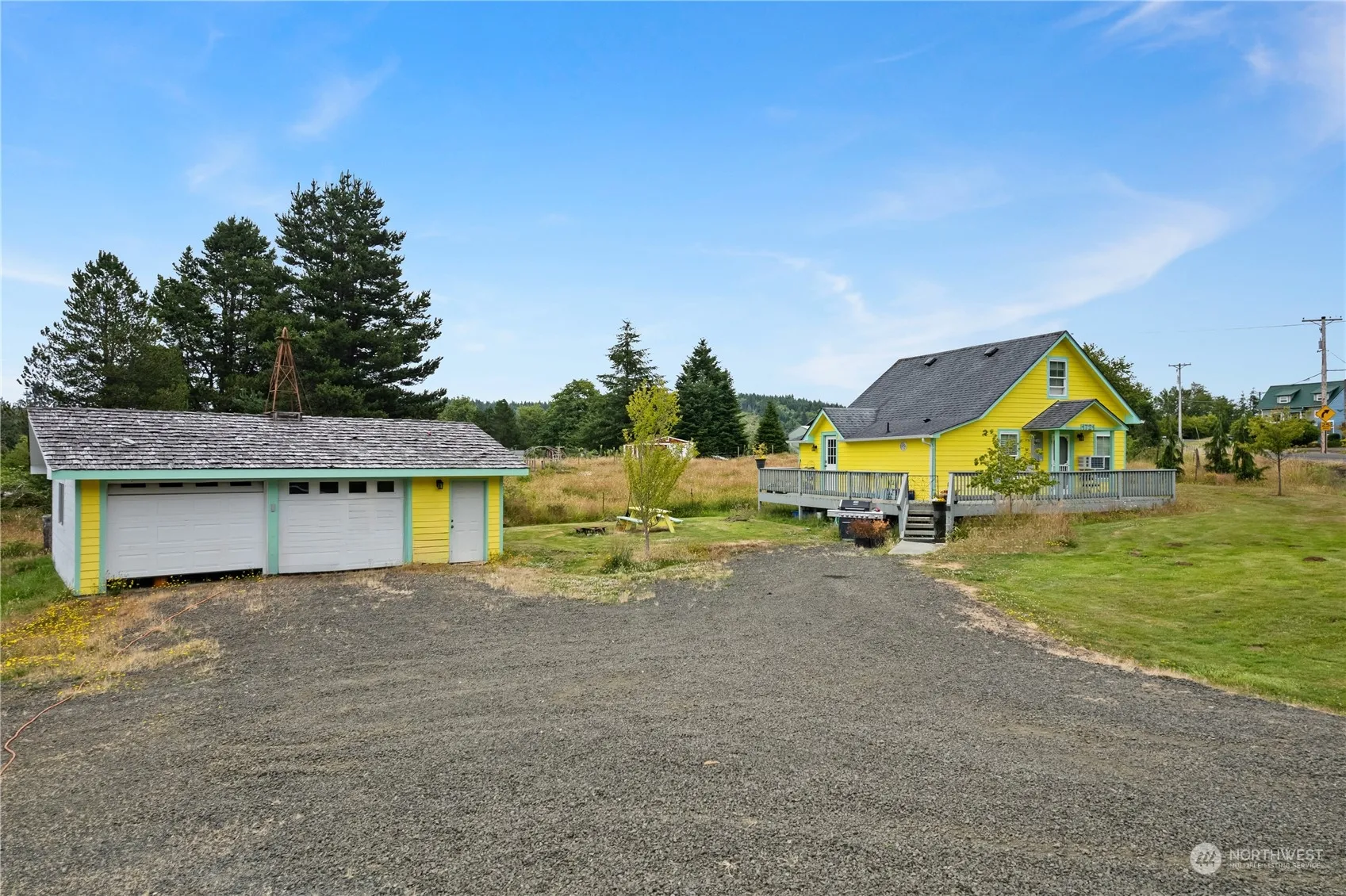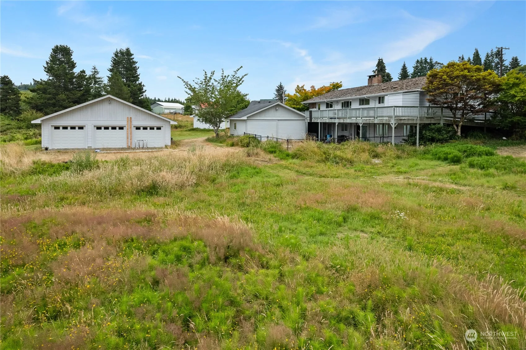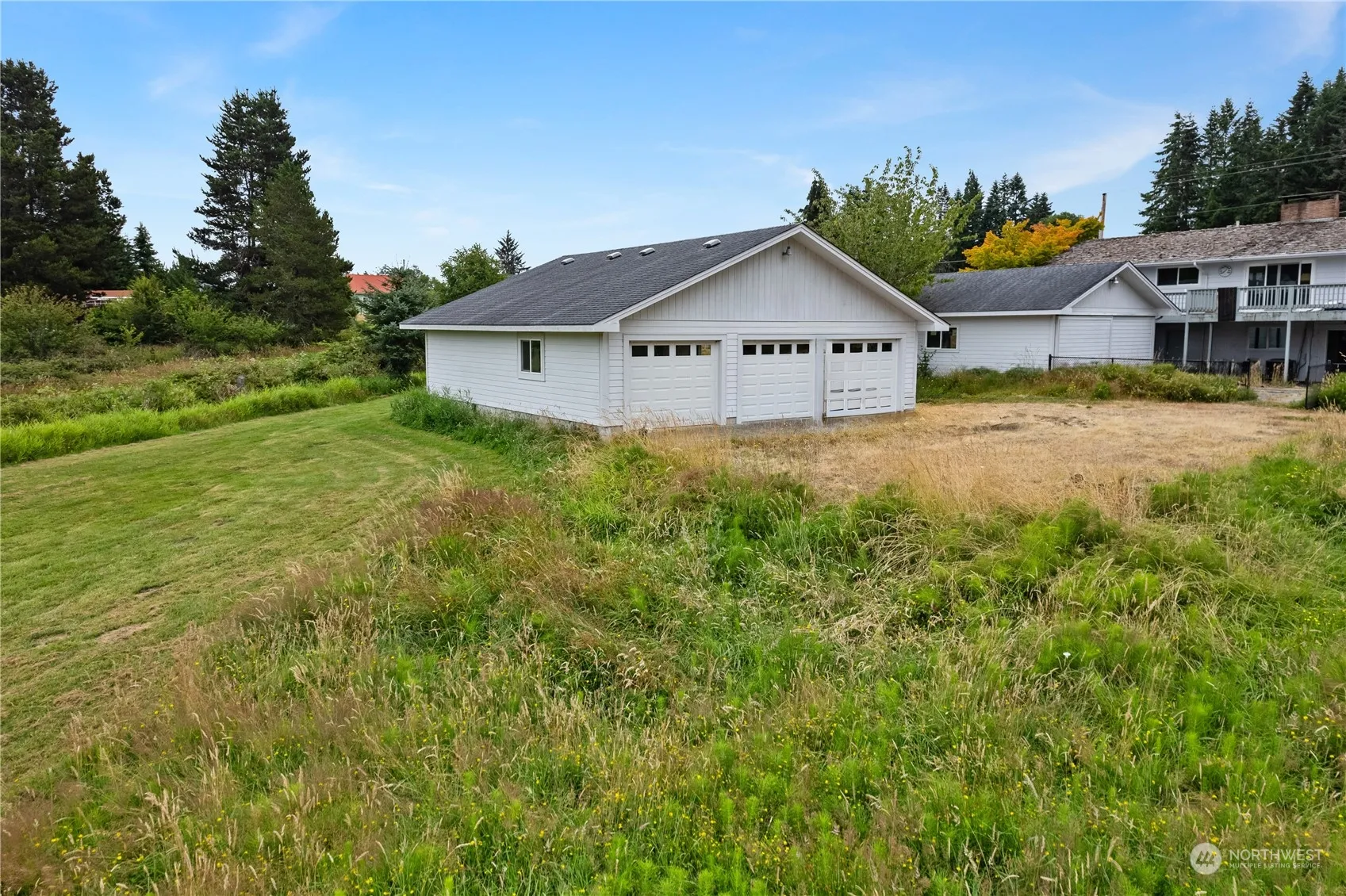 Main Home: Two-story, 1,522 sq ft with 3 beds and 2 baths. Renovations started, need completion. 760 sq ft finished basement with a sink and kitchen, plus an additional 750 sq ft unfinished basement. Detached Home: 924 sq ft, tenant-occupied, with 2 beds and a bonus room upstairs. ADU is currently a short-term rental offering excellent cash flow. Garages: Three garages with a total of 8 bays, potential for conversion to another residence (verify with county). Large driveway with ample parking. Located close to downtown Raymond and recreation, including a newly renovated golf course. The 3.46-acre lot offers stunning territorial views. Contact us for details or to schedule a visit.