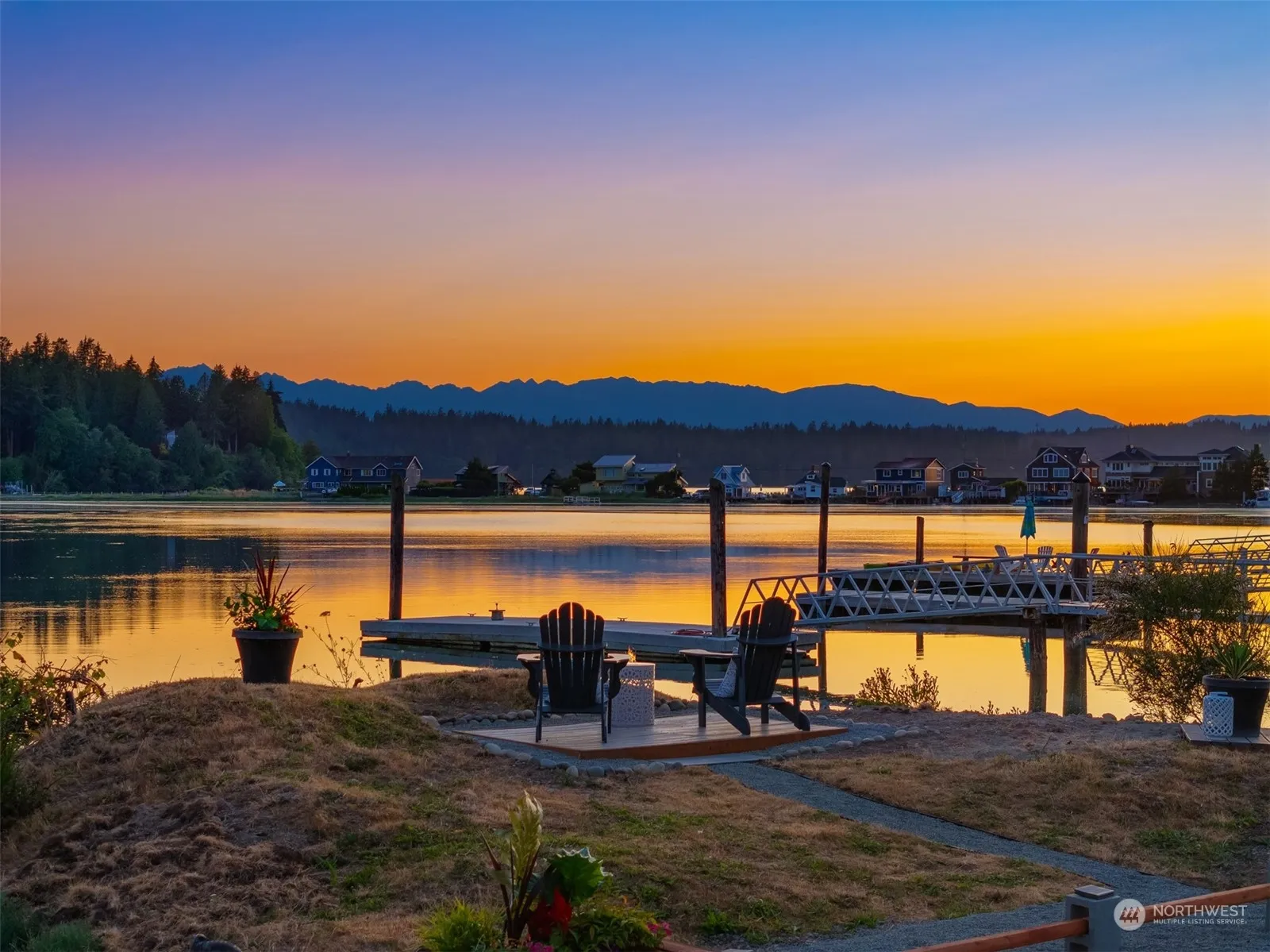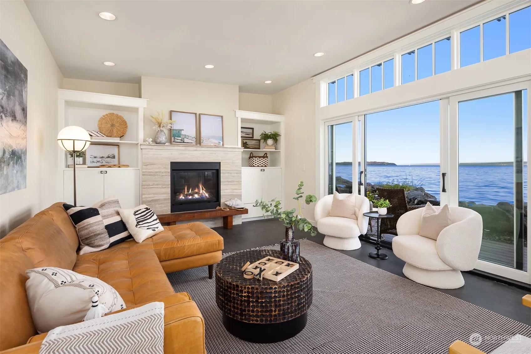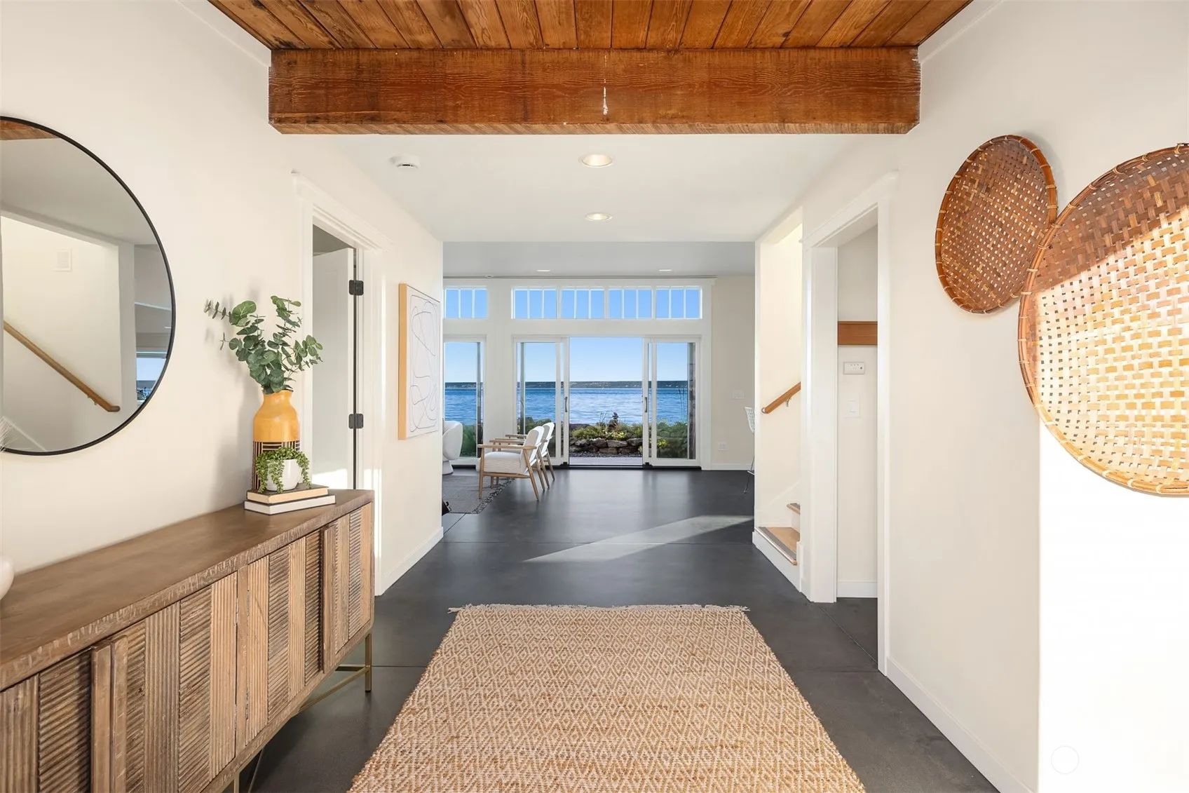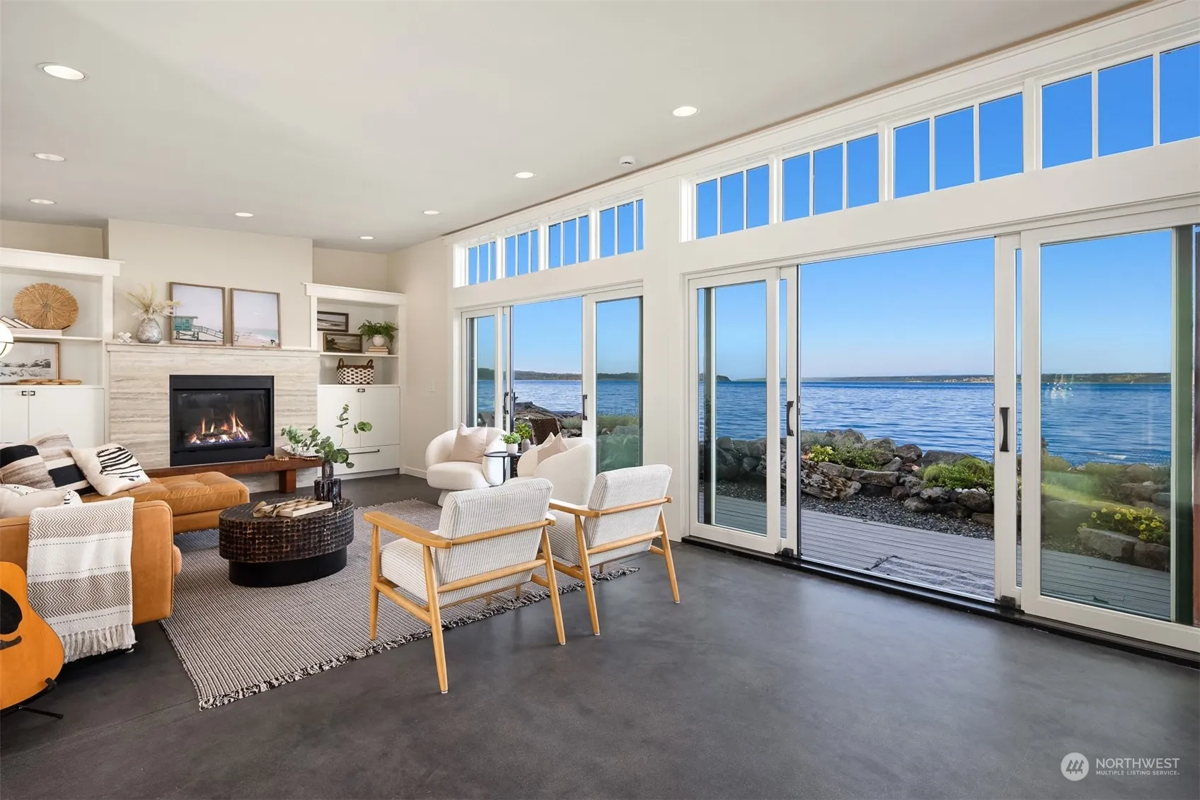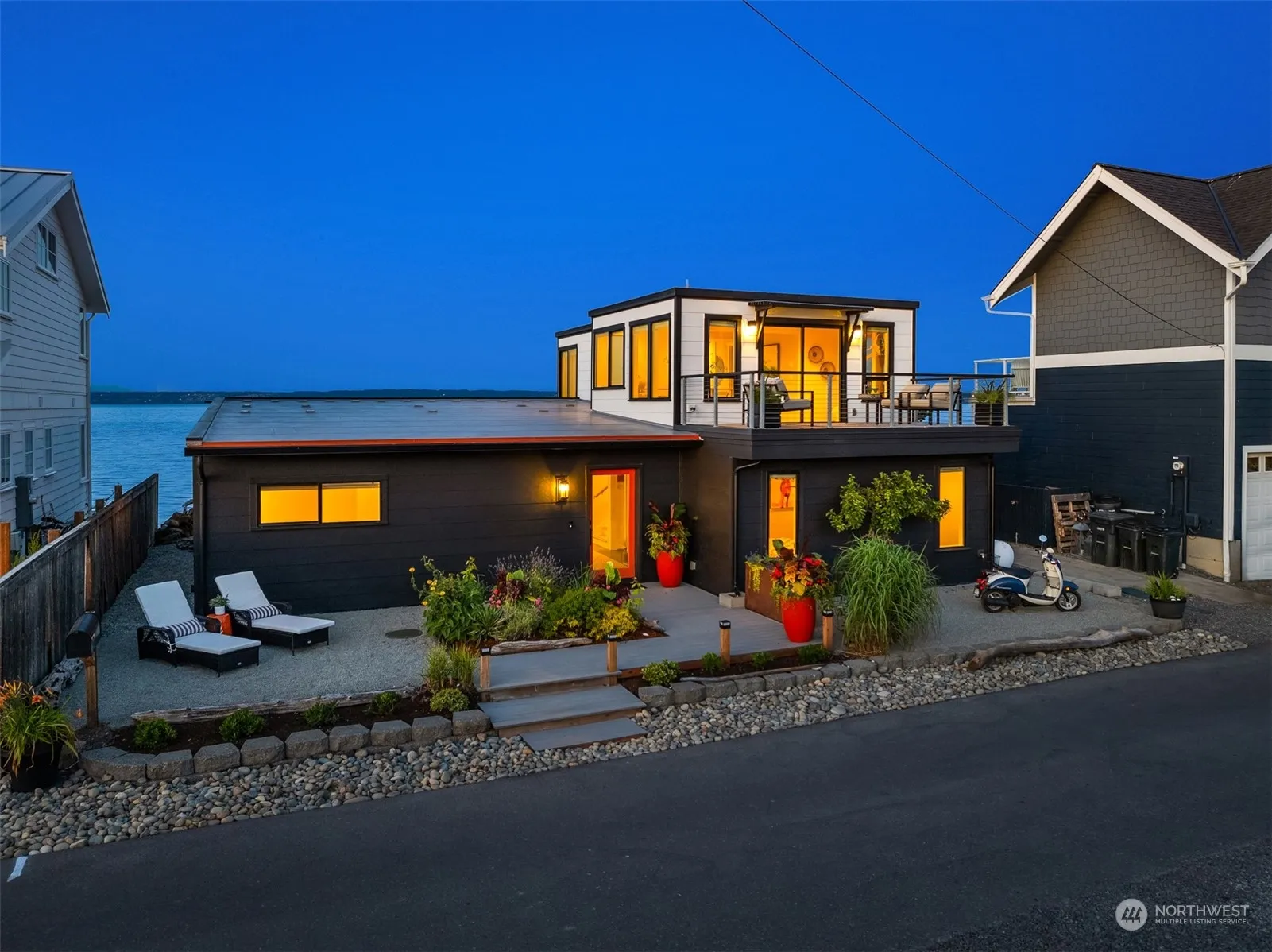 Modern design meets timeless charm on Bainbridge. This waterfront home perfectly blends clean lines and natural textures to complement the stunning serenity of the 360 views. Home has incredible entertaining spaces with soaring ceilings and light. Newly renovated in 2024, its oversized glass panels lead to a landscaped waterfront patio on the east and sunny deck with lagoon mountains views on the west. Flexible layout with 3+ large rooms for bedrooms, office, den or guests. Property has private off street parking for 5. The Pt. Monroe Spit is a friendly community that also serves as a popular vacation spot, perfect for lifestyle living or income. Few homes provide this combination of polished design, drama and lock and go lifestyle.