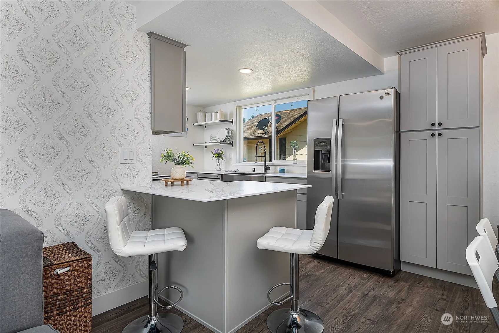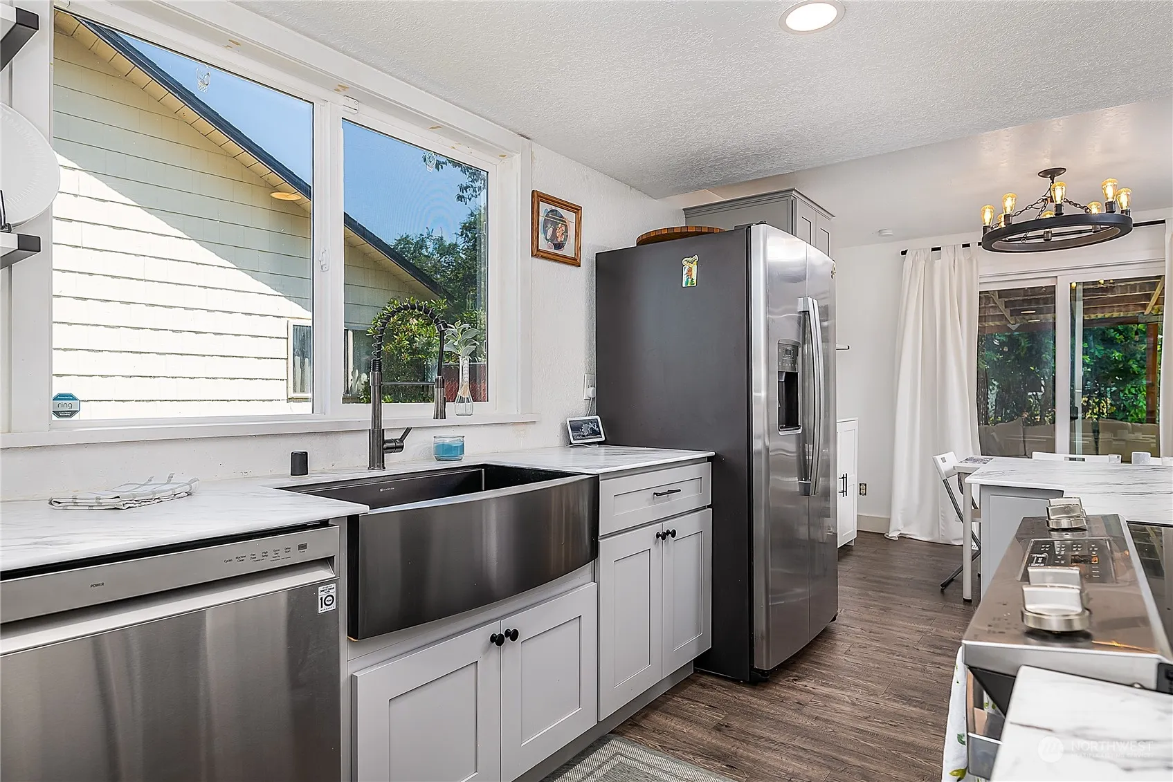 Welcome to this Enumclaw Gem! This charming 3-bedroom rambler boasts a thoughtfully open circular floorplan with a spacious living room featuring modern fireplace, perfect for chilly evenings, & central A/C for these summer days. The adjoining dining area and kitchen with breakfast bar create an inviting gathering space. Updated kitchen and bathrooms offer modern convenience, while new laminate hardwood flooring adds a touch of elegance throughout. Peek at Mt. Rainier from the comfort of your living room, or step outside to the large, level-fenced backyard with a covered deck, ideal for relaxing or entertaining. Nestled on a quiet cul-de-sac conveniently close to downtown Enumclaw & amenities. 2-car garage, RV parking, and more.