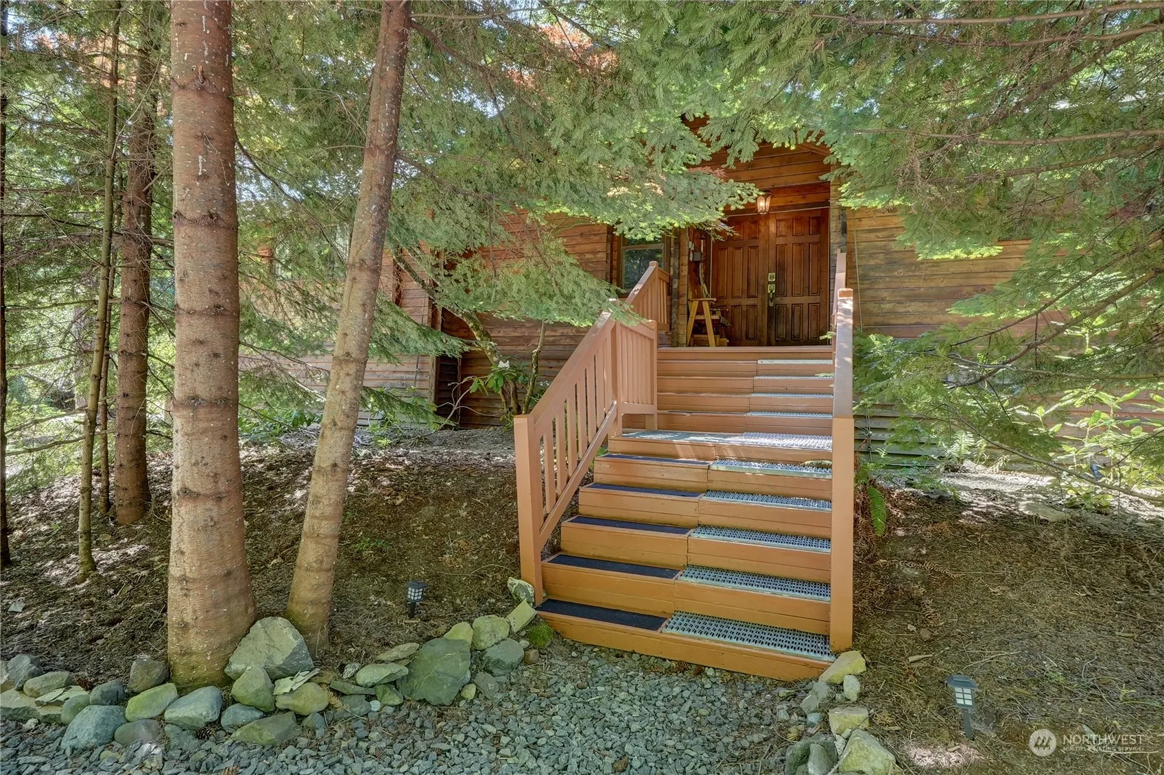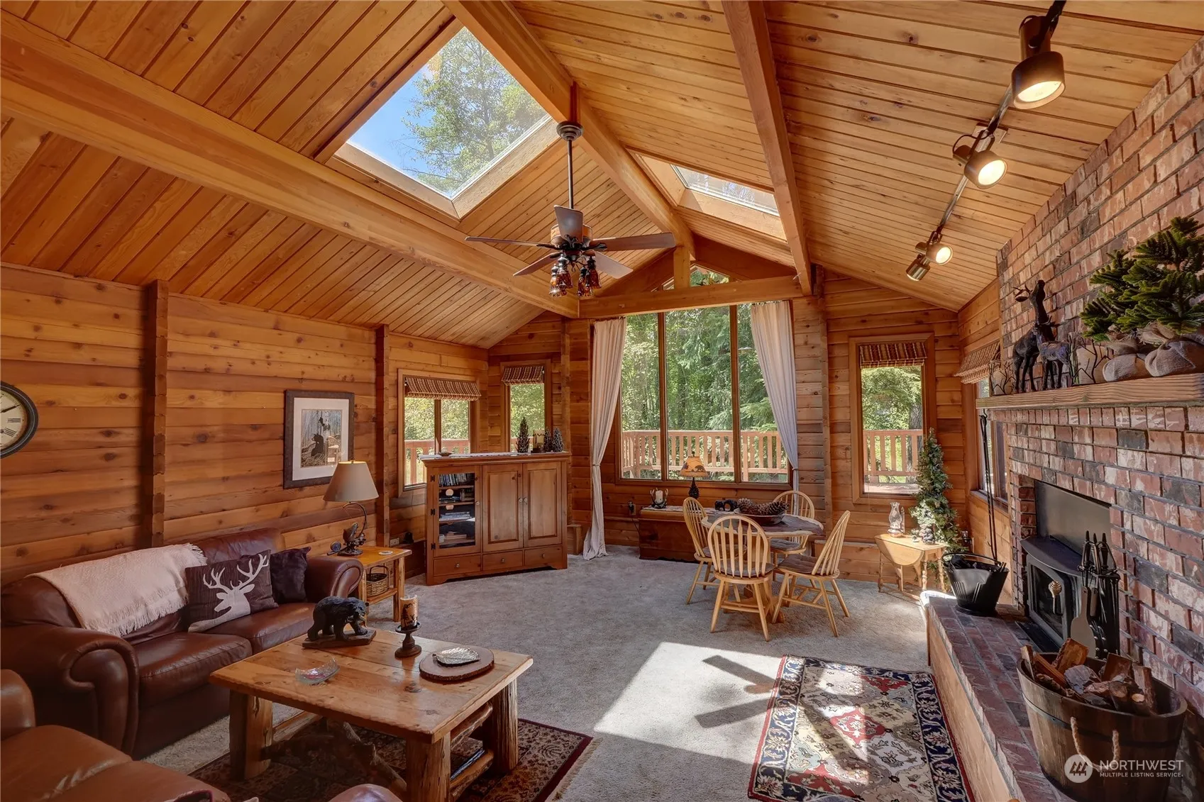 Crystal River Ranch 2552sf classic “Pan Abode” Cedar log home will steal your heart. Secluded sylvan lodge for mountain gatherings & exciting outdoor adventures. Crystal Mt & Mt Rainier within easy reach. Hike, bike, snowshoe, XC ski out the door. Impressive deck (1200sf) & large living spaces on both levels designed for entertaining. 3 bedrms plus office/den sleep crowd of 10+. Chefs & guests linger & love spacious kitchen & dining layout. Living rm snugs you in with captivating forest views, skylights, cedar walls & lofty beams. Handsome brick fireplaces broadcast warmth & anchor ambiance. Hot tub & stone fire pit stretch evenings well into the night. Carport access to big shop for recreation gear, storage & projects. Say hello to nature!