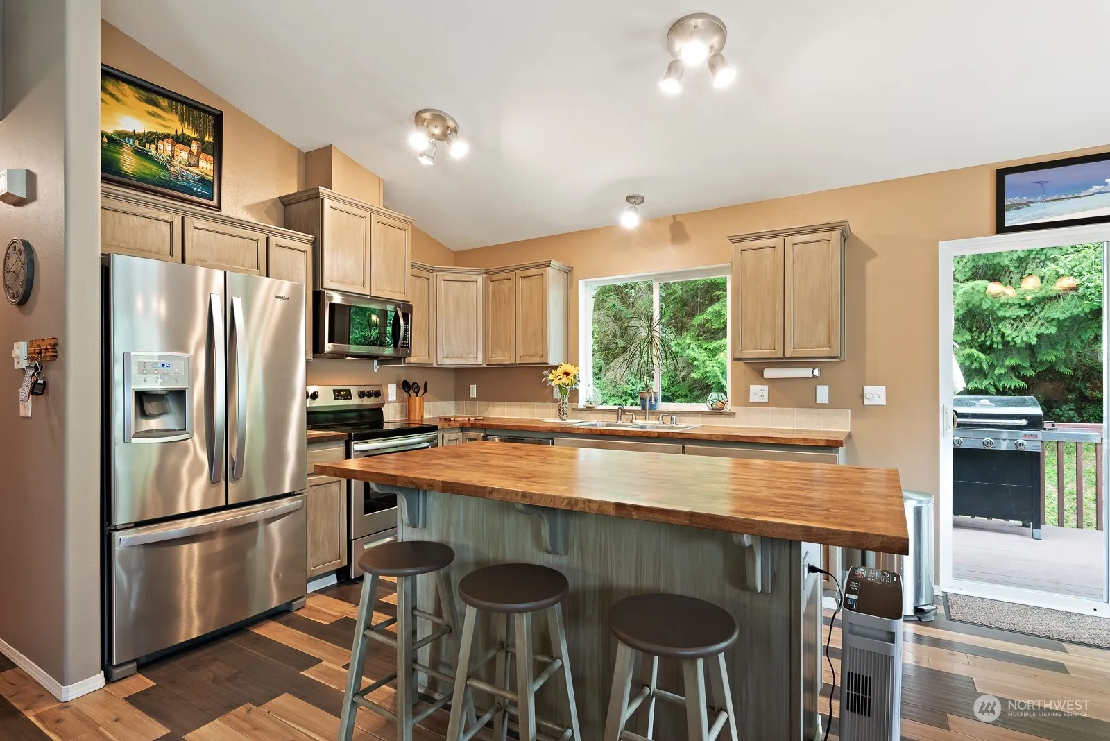 Must-see 3-bedroom, 2-bath home, just minutes from town, in an up and coming neighborhood. Spanning over 1,500 square feet, this updated gem features an open living area with a modern kitchen equipped with newer appliances, refinished cabinets, and butcher block countertops. Enjoy the rustic elegance of 3/4″ thick Acacia wood floors. The primary suite includes a new tile walk-in shower, double vanity, and vessel sinks. The lower level boasts a spacious utility room and a third bedroom with a walk-in closet. The expansive Trex deck, Bluetooth outdoor sound system, and private backyard offer perfect spaces for relaxation and entertaining. Plus, it’s wired for a generator. Don’t miss out!