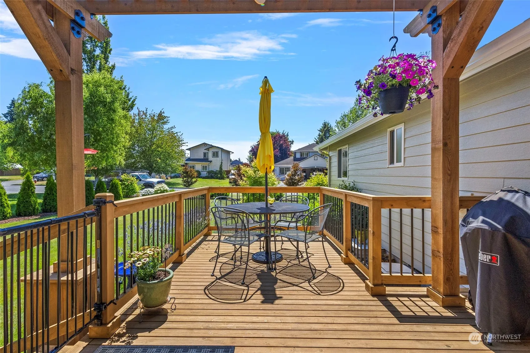 Hard to find, spotless ONE LEVEL home with a 3 CAR GARAGE. Bring the RV, boat and your hobbies! You will love this level/oversized corner lot with low maintenance landscape and garden space. Primary bedroom with walk-in closet and a ¾ bathrm. NEW appliances in the Kitchen and plentiful cabinets with pantry space. Dining area is easily accessed from the kitchen and BOTH living areas. Main living rm has vaulted ceilings and cozy gas frplc with tons of natural light. NEW laminate floors and NEW carpet. Exterior and interior paint have been done for you too! Custom built deck w/ pergola provides plenty of space & privacy for relaxing and entertaining. Minutes to schools and shopping. Easy commute to I-5 and 50 minutes to Seattle. A MUST SEE!