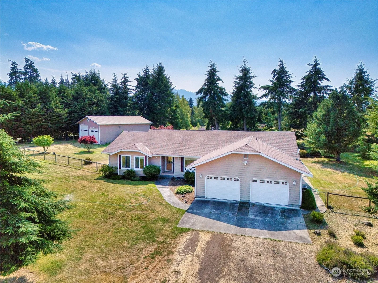 Sweet! Come on in to this wonderful light filled home on 1.29 ac on a private lane. A spacious living room w/floor to ceiling fireplace flows into the kitchen with loads of storage, counter space, pantry w/island seating & dining space. There’s a formal dining room & an office w/french doors. The primary bedroom w/walk in closet & ensuite w/tub, shower, double sinks also has sliders to a private deck w/hot tub. There’s 2 more bedrooms. one w/own ensuite & walk in closet. There’s 1 more full bath & a 1/4 off the laundry leading to a double garage. A full deck off the back looks over a beautifully landscaped backyard. The cherry on top is the huge 1500′, double RV garage & shop w/loft & wired for a generator. All that’s missing is YOU!