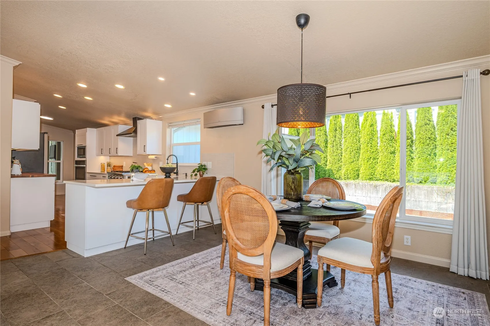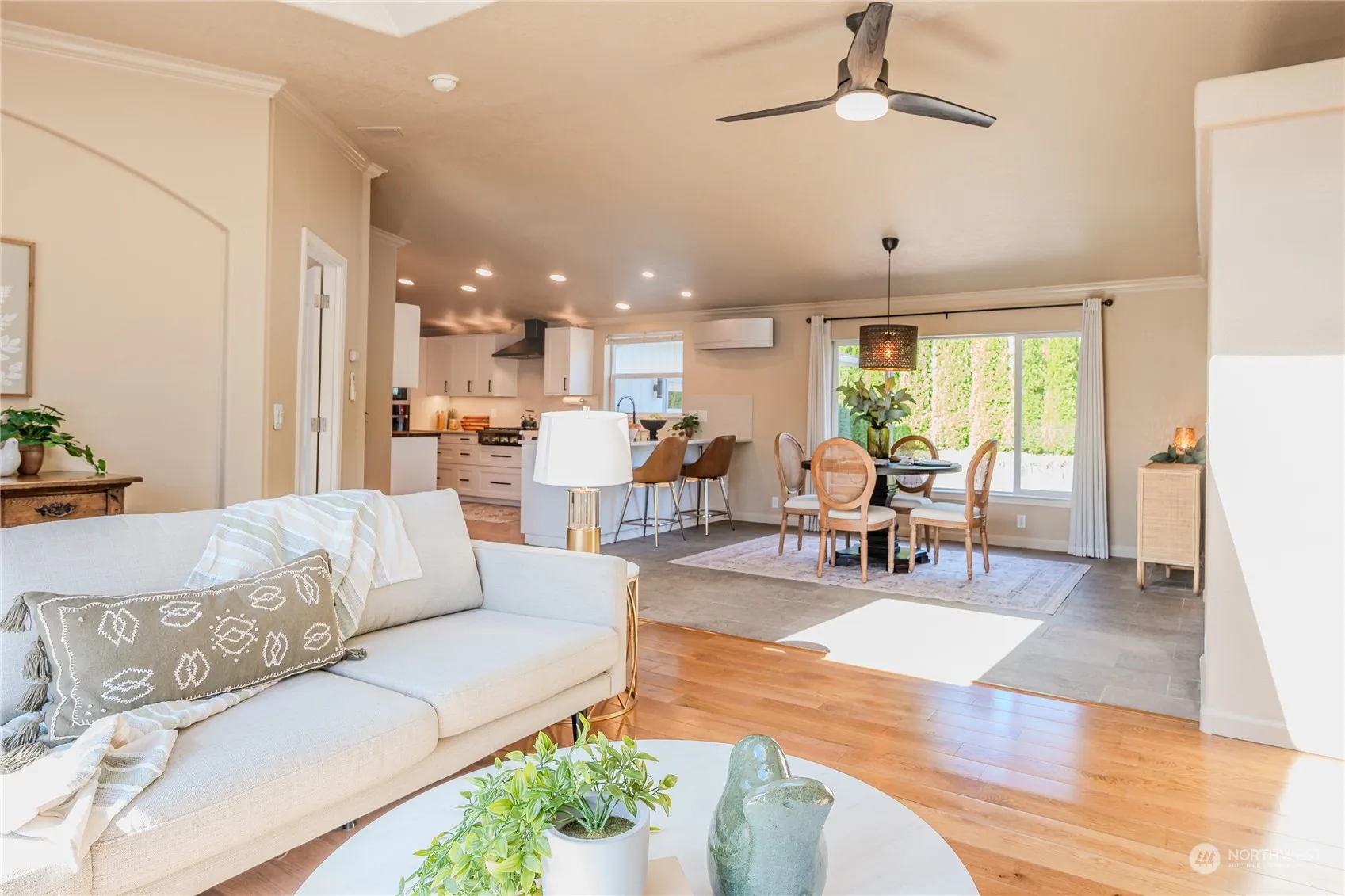 Immaculate home with fabulous, modern updates throughout in desirable 55+ Klahowya! Large windows, skylights & vaulted ceilings give a bright, open feel & zoned ductless HP system provides heat & cooling in season. Stunning new Kitchen boasts quartz counters, slate appliances, gas range w/hood, white farm sink & coffee bar- all open to spacious Dining & Family Room. Abundant custom cabinetry featuring 29 lighted, soft close drawers & cabinets keeps Kitchen beautifully organized. Dreamy Primary Suite w/walk-in closet & luxurious 5 pc bath! Lg Guest Rm & 3rd BR/Off w/built-in shelves. 2nd bath w/ADA shower. Sun/Flex Rm w/peaceful views of pretty, low maintenance yard, Trex deck, patio & greenbelt! XL 2-car Gar w/blt-in shelves! IT’S AMAZING!