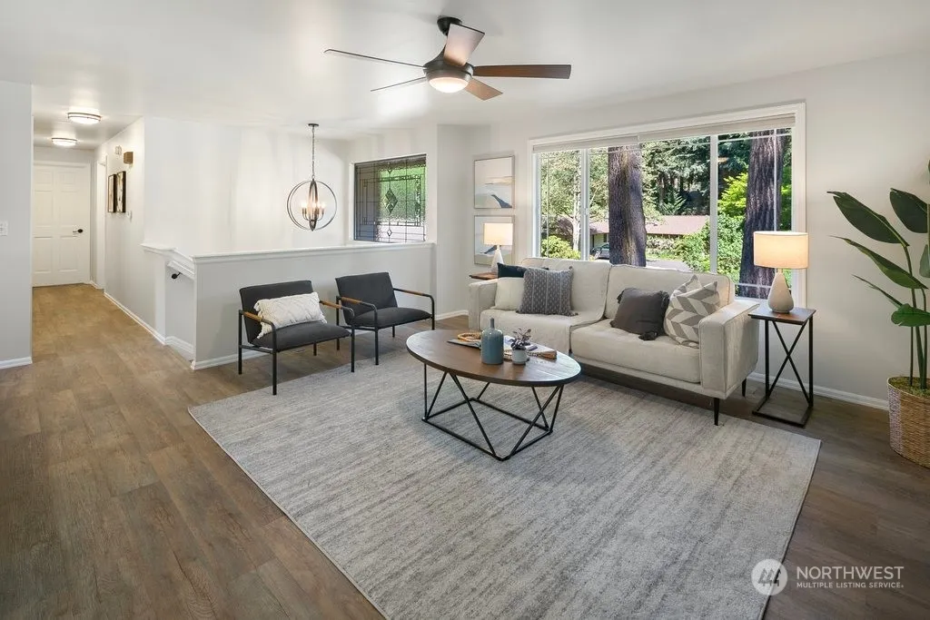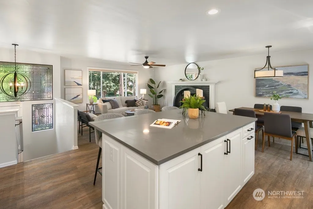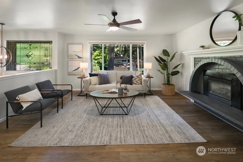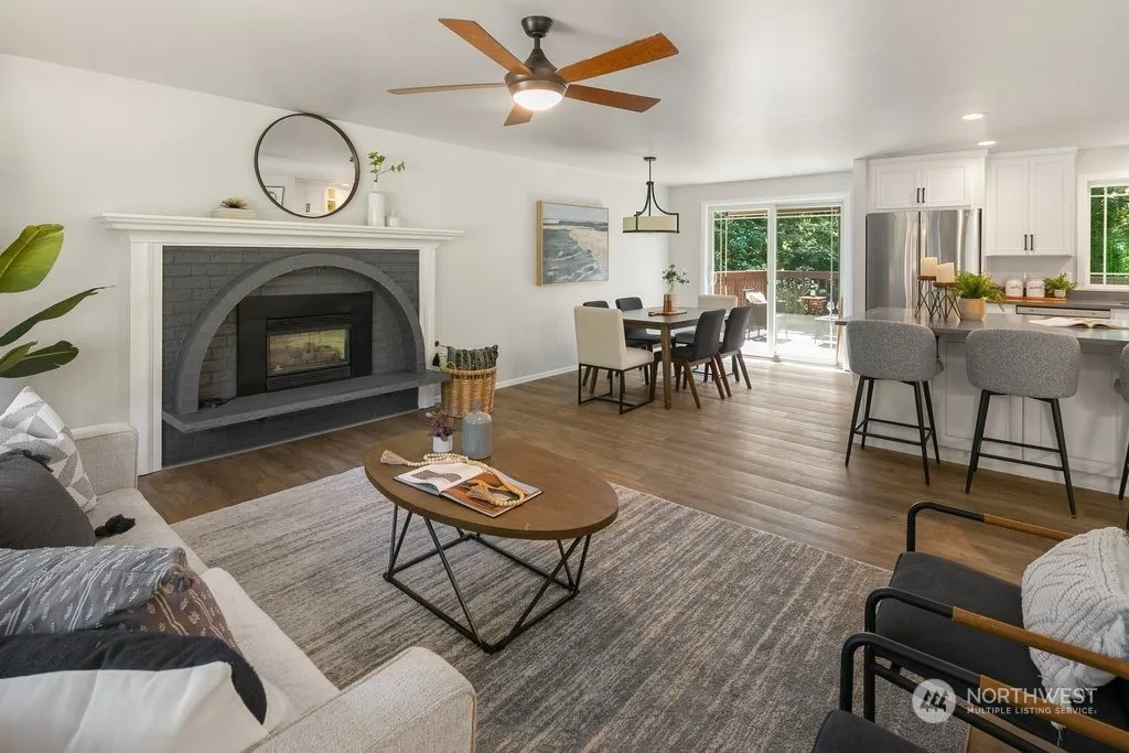 Discover this beautifully updated turn-key home nestled in a serene park-like setting. The expansive open-concept main level boasts a spacious living room with a cozy fireplace, a kitchen adorned with a large island, quartz countertops, subway tile backsplash, stainless steel appliances, and freshly painted cabinets. Downstairs, find two bedrooms, a ¾ bath, and a generous family room complete with a wet bar. Updates include new paint throughout, upgraded bathroom fixtures, vanities, lighting, countertops, and hardware. Step outside to an outdoor oasis featuring a fire pit, hot tub, gazebo, entertainment deck, patio, ample garden space with a sprinkler system, ambient lighting, and RV parking. Enjoy the community park and nearby trails!
