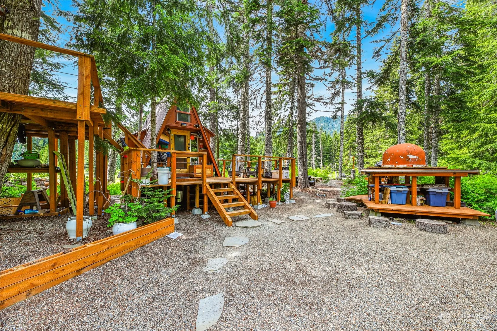 Discover tranquility and seclusion on nearly 9 forested acres on Gold Creek only an hour east of Seattle. With 1000 feet of creekfront adjacent to Gold Creek Pond, this property boasts a charming off-grid A-frame cabin, solar-powered for sustainable living. Or build your dream cabin with multiple build sites. Enjoy the spacious lower and upper decks. Three additional structures provide versatility. Ski in the winter and stay cool in the summer. Outside, find a shower, tub, trails, swimming spots, and breathtaking views. There’s a pizza oven and firepit for cozy gatherings. The property is secured by a heavy-duty iron gate and multiple security cameras. A once-in-a-lifetime opportunity to own the largest single property in the SkiTur Valley.