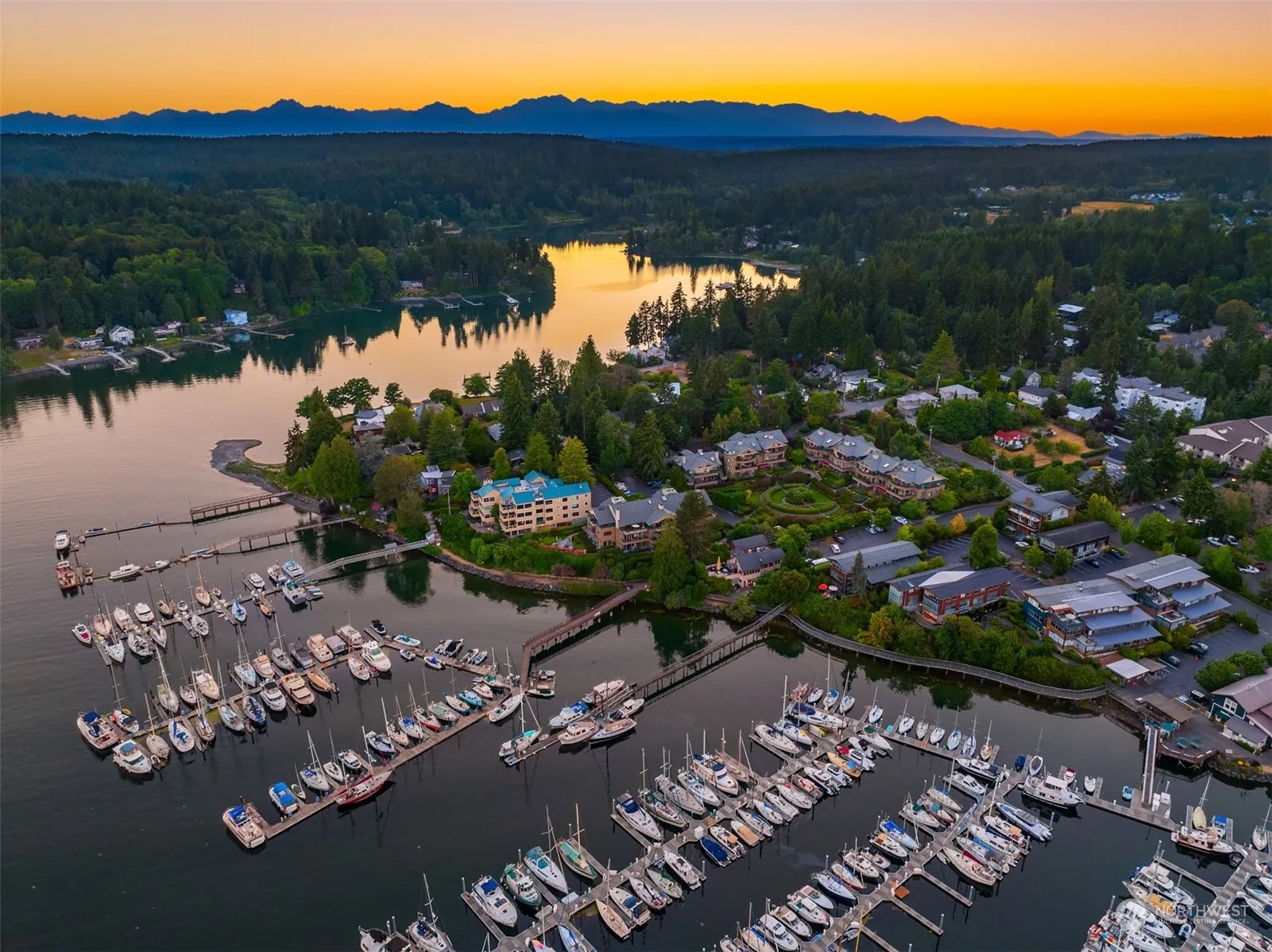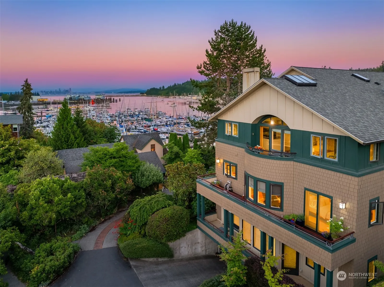In-town living—everybody loves it! This sophisticated, turnkey condominium boasts magnificent views of the Winslow marina and the Seattle skyline. Light-filled, gracious floor plan with wonderful flow. Two large decks are ready for fabulous container gardening. The kitchen accommodates many cooks with island seating to enjoy those beautiful views! An adjacent sitting room features built-ins and access to the deck. The gorgeous primary suite offers a large walk-in closet and updated full bath. In addition there is a guest suite and third bedroom currently being used as an office. This building has only 10 units with excellent storage and two-car garage. Community outdoor entertaining area on the water’s edge is ideal for gatherings!