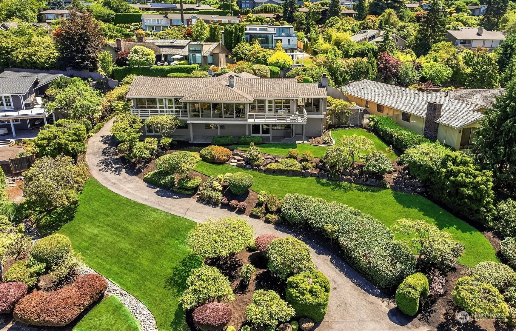 Located in Aqua Vista, a peaceful & coveted neighborhood at the heart of Clyde Hill, yet mins away from the vibrant downtown. Built in 1972 & update over the years, this home, set on a nearly 1/2 acre lot, offers the perfect canvas to move right in, renovate, or build new. Floor-to-ceiling windows capture nightly sunsets & west-facing views of Seattle skyline & Olympics. Designed for gatherings, host poolside parties or holiday celebrations in the expansive living, dining & family rooms that surround the kitchen. The flow and functionality make entertaining a breeze! Spacious main floor primary w/ his-and-her walk-in closets & large bath. Additional bedroom or home office on main + 3 bedrooms & large bonus room down. Central A/C (2016).