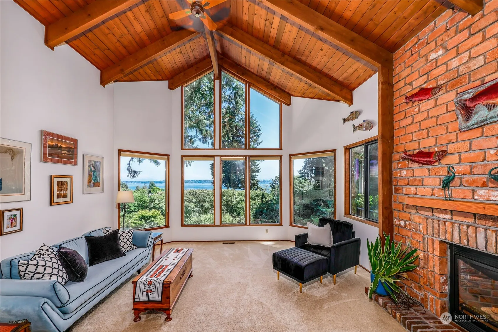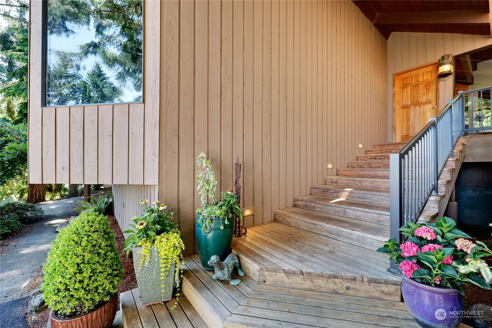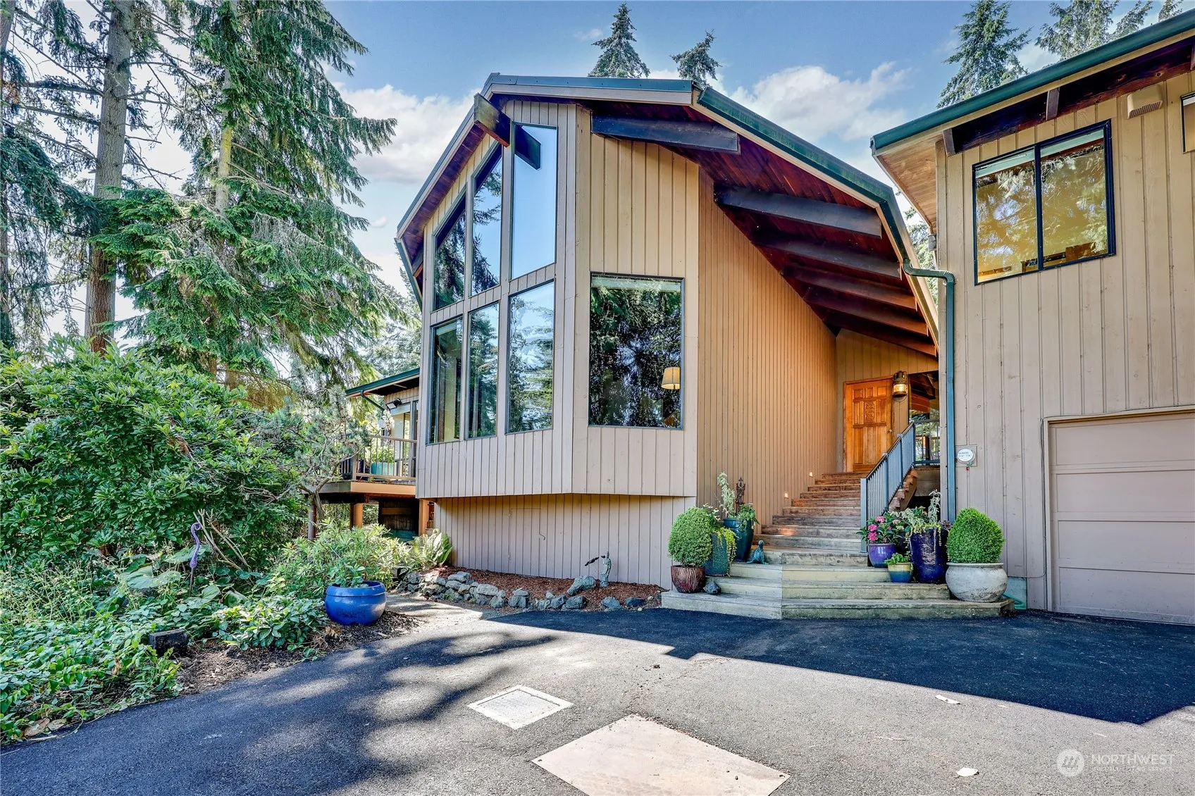 Welcome Home to the desirable Murden Cove neighborhood. This 3 bedroom and 2.5 bath home has vaulted beamed ceilings with floor to ceiling windows that bring in the captivating views of Puget Sound, the shipping lanes and the Seattle skyline. Surrounded by gardens this thoughtfully renovated home has gleaming oak floors and a remodeled kitchen that boasts soap stone counters and cherry cabinetry. The primary bedroom enjoys the same views with modernized bath and walk in closet. There is even a hot tub room with private balcony. The outdoor decking is the perfect place for alfresco meals. Surrounded by nature, you are just steps away from Manitou beach, and just minutes to Winslow. The neighborhood enjoys 168 feet of private community beach.