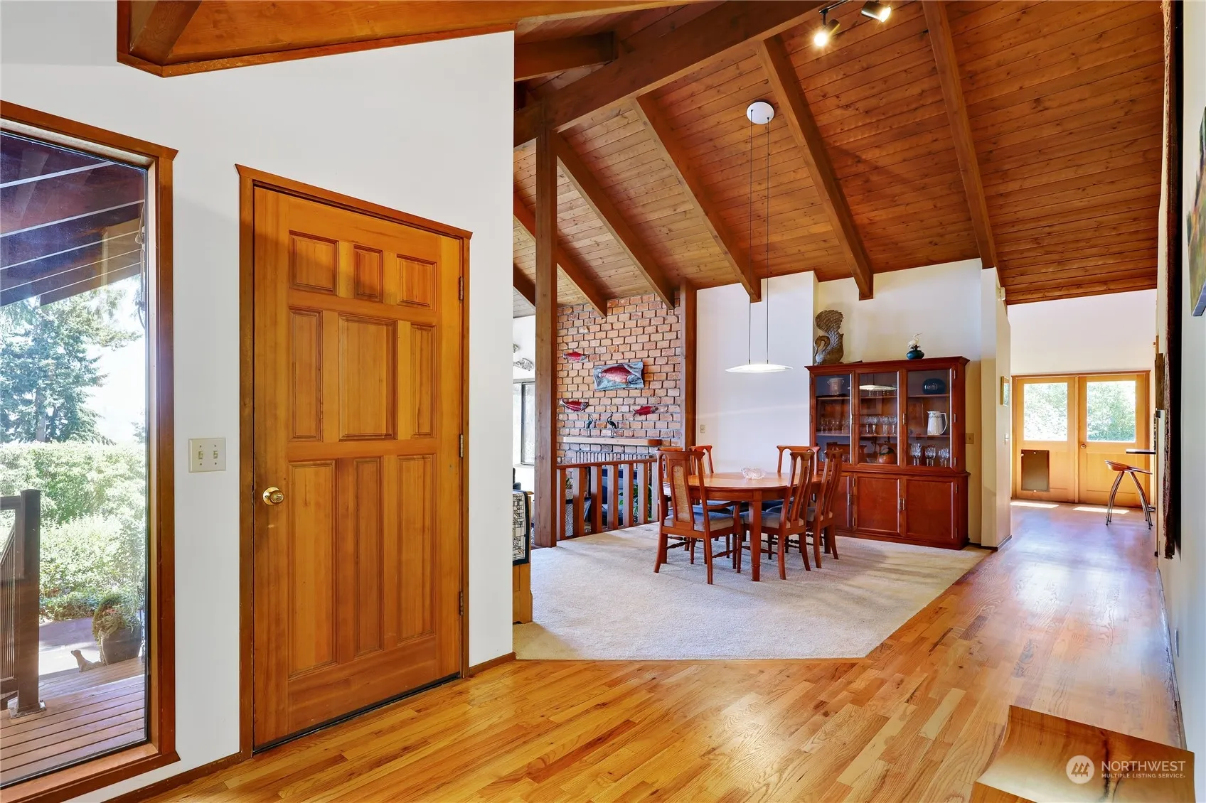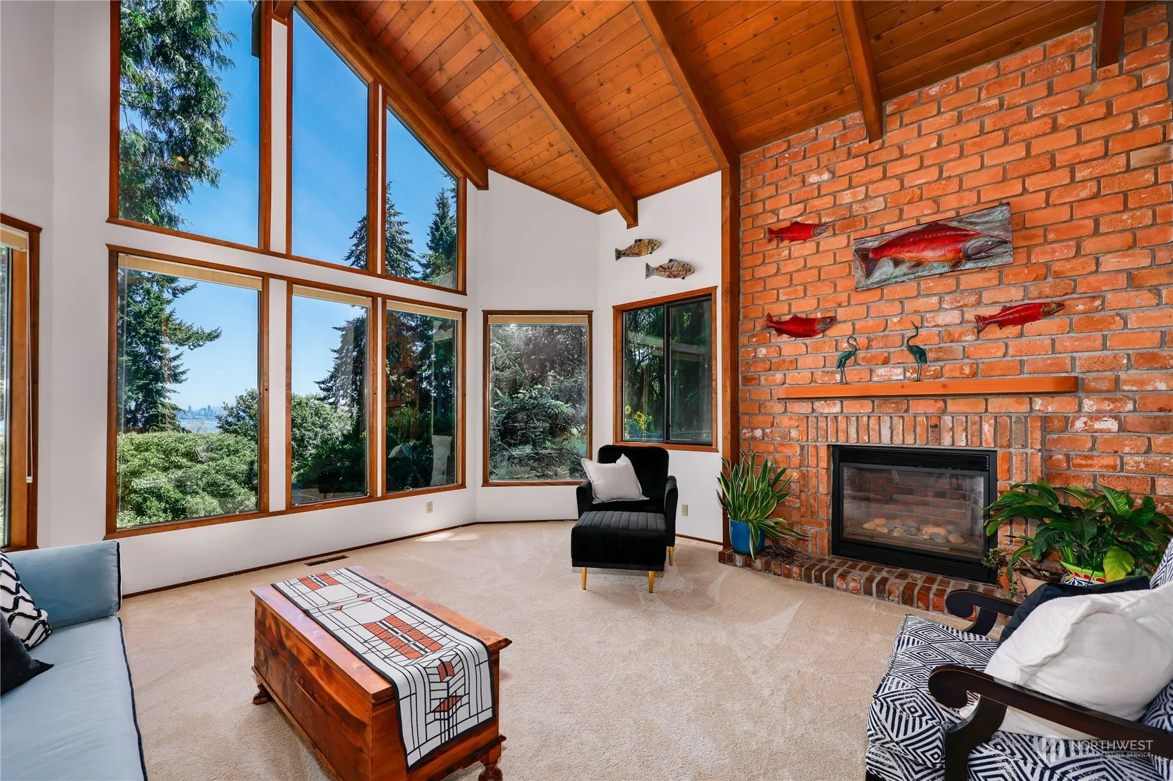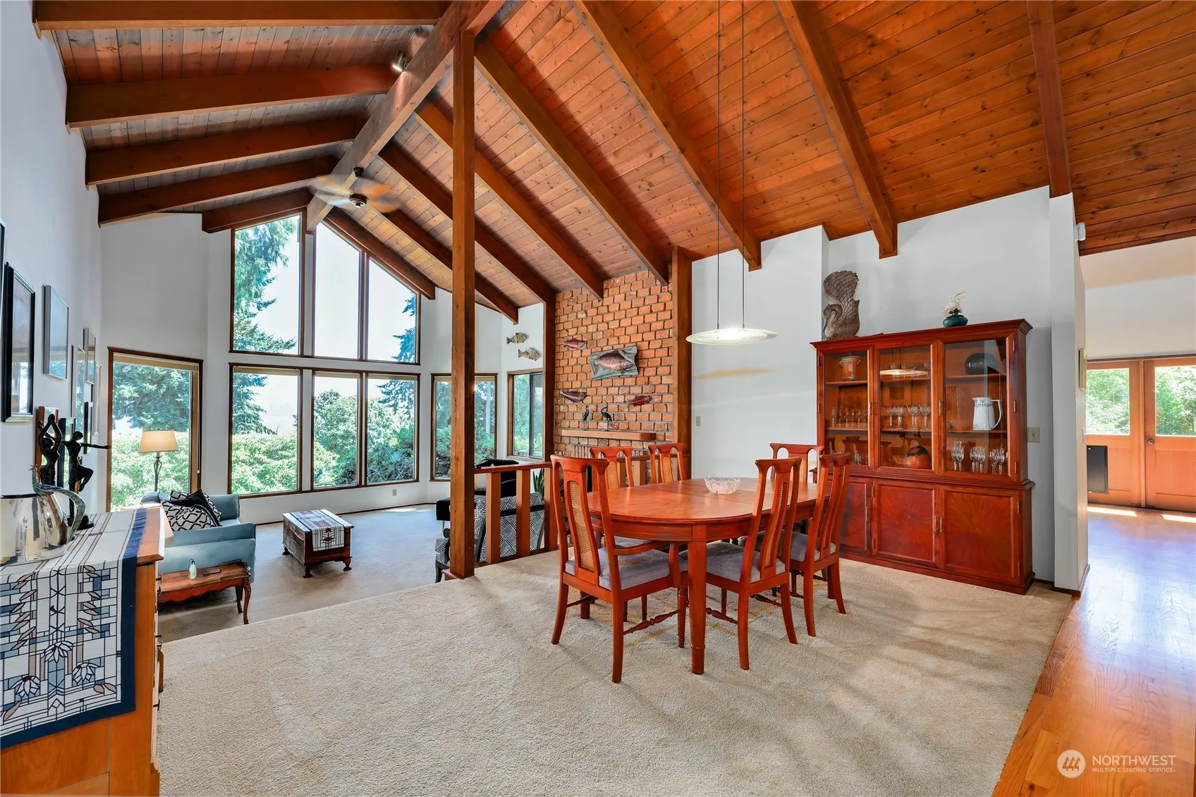 Welcome Home to the desirable Murden Cove neighborhood. This 3 bedroom and 2.5 bath home has vaulted beamed ceilings with floor to ceiling windows that bring in the captivating views of Puget Sound, the shipping lanes and the Seattle skyline. Surrounded by gardens this thoughtfully renovated home has gleaming oak floors and a remodeled kitchen that boasts soap stone counters and cherry cabinetry. The primary bedroom enjoys the same views with modernized bath and walk in closet. There is even a hot tub room with private balcony. The outdoor decking is the perfect place for alfresco meals. Surrounded by nature, you are just steps away from Manitou beach, and just minutes to Winslow. The neighborhood enjoys 168 feet of private community beach.