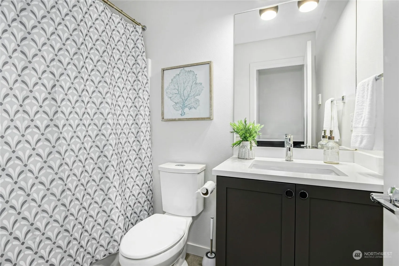 Nestled in the Echo Lake neighborhood, this townhome, built in 2021, boasts a spacious floor plan with a designated dining room, and an attached one-car garage. Each of the three bedrooms has an en-suite bathroom, with the ground-floor bedroom ideal for guests or a home office. The main floor with its open floor plan is perfect for entertaining. SS Appliances, quartz counters, smart lighting on the main level, primary bedroom and bathroom. The home features four covered balconies and a fenced-in patio on the main level. It offers prime access to the Interurban Trail, parks, and the upcoming Shoreline North / 185th Light Rail Station, set to open in 2024. Restaurants and retail options are also within walking distance. No HOA. Pre-inspected.