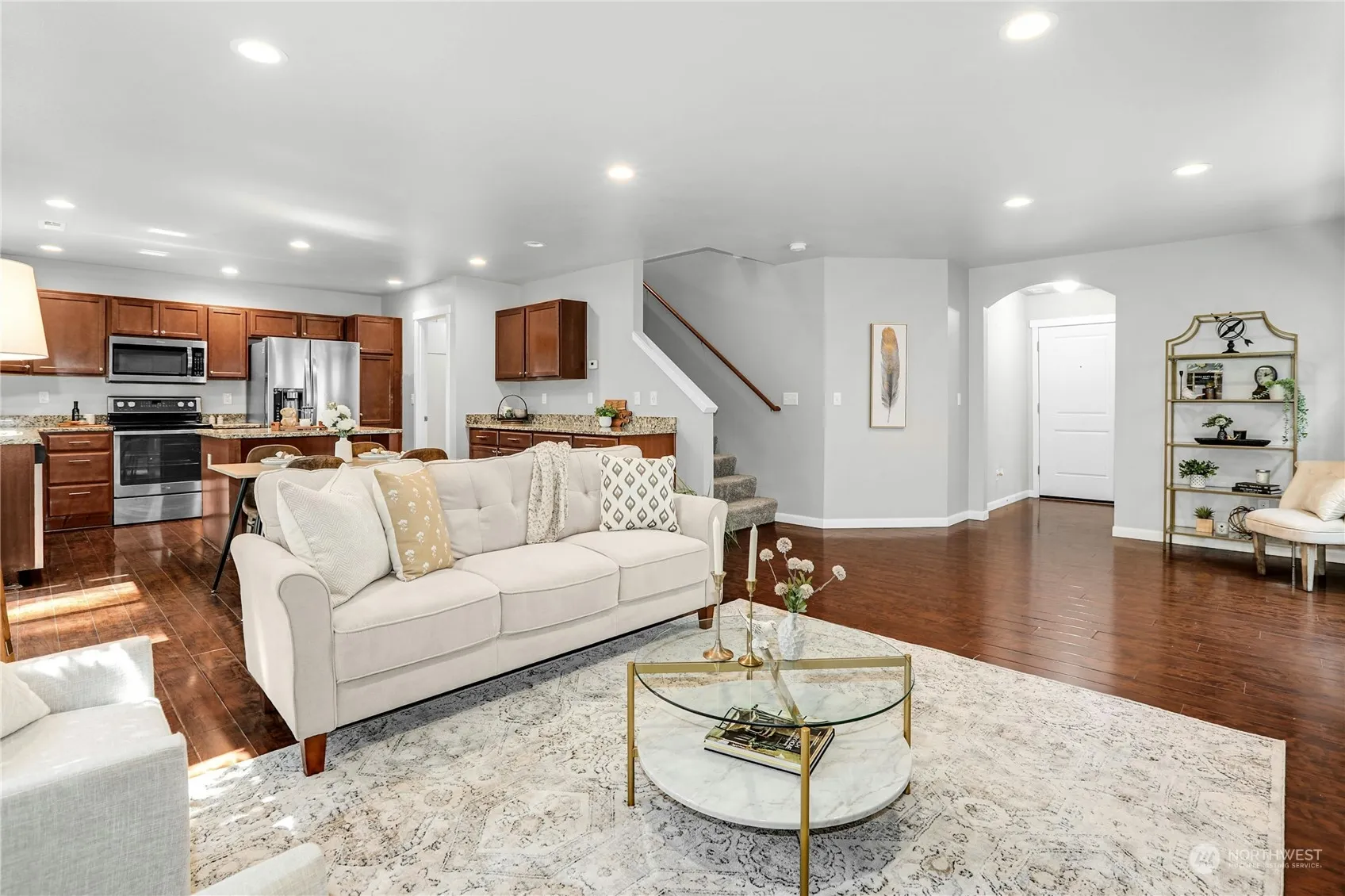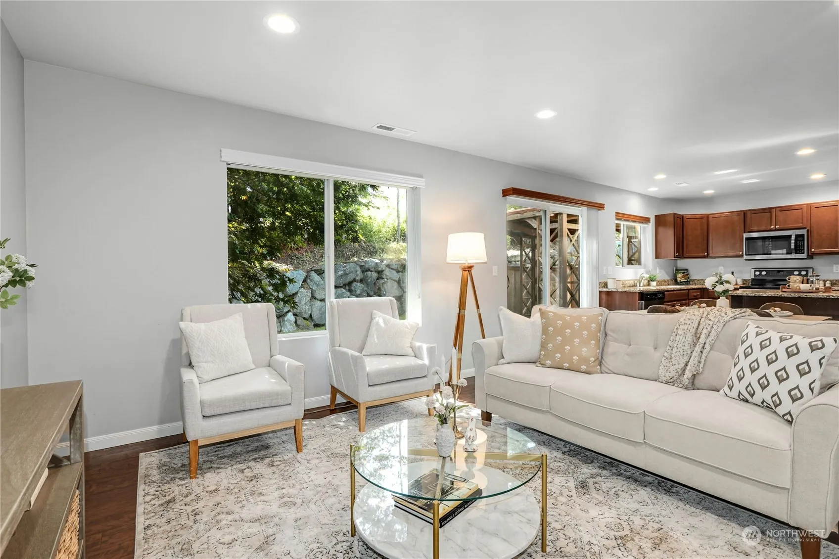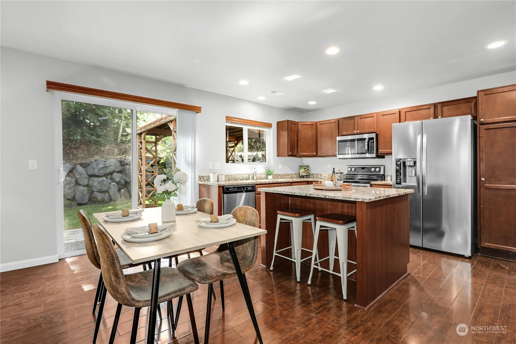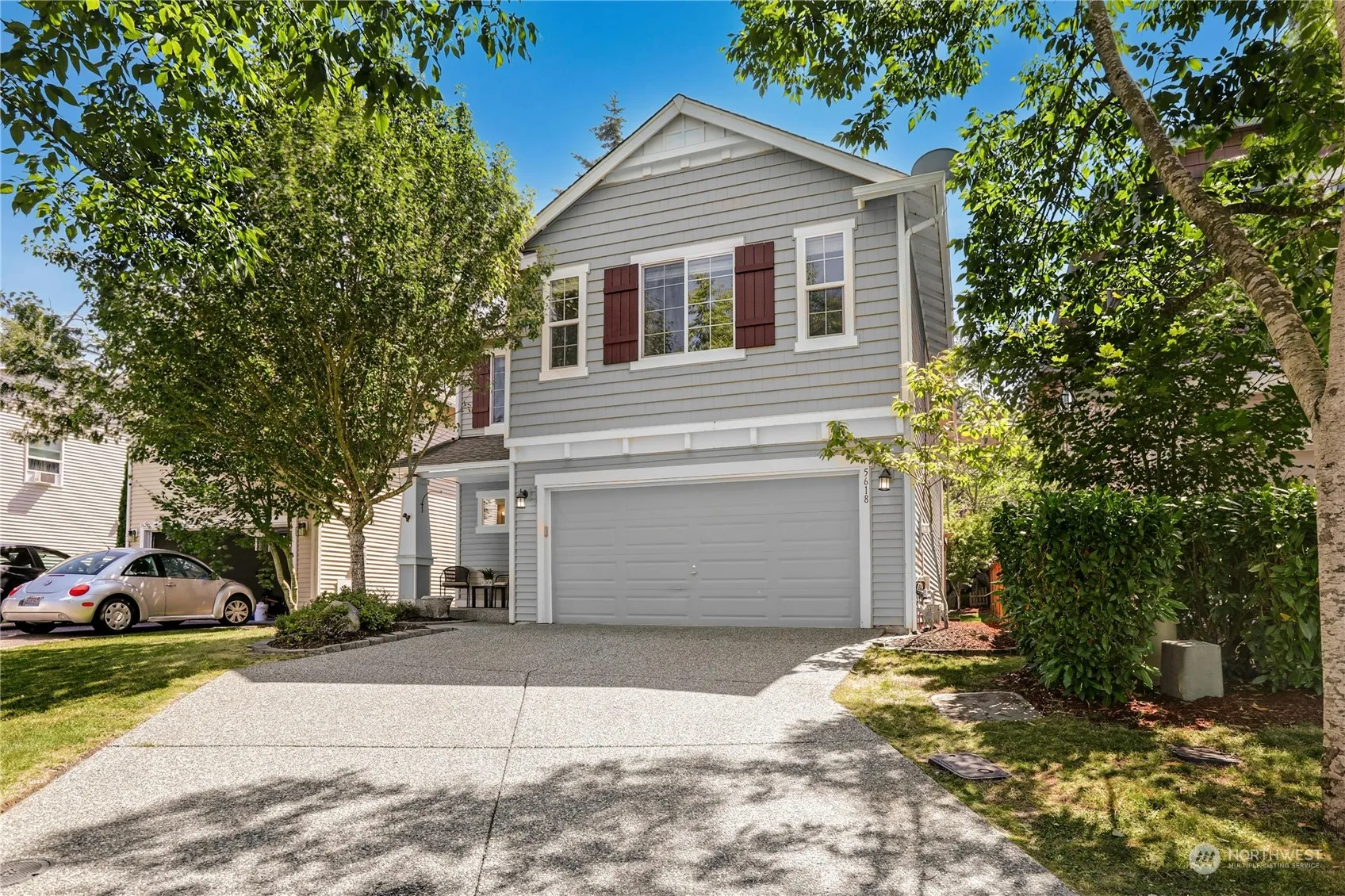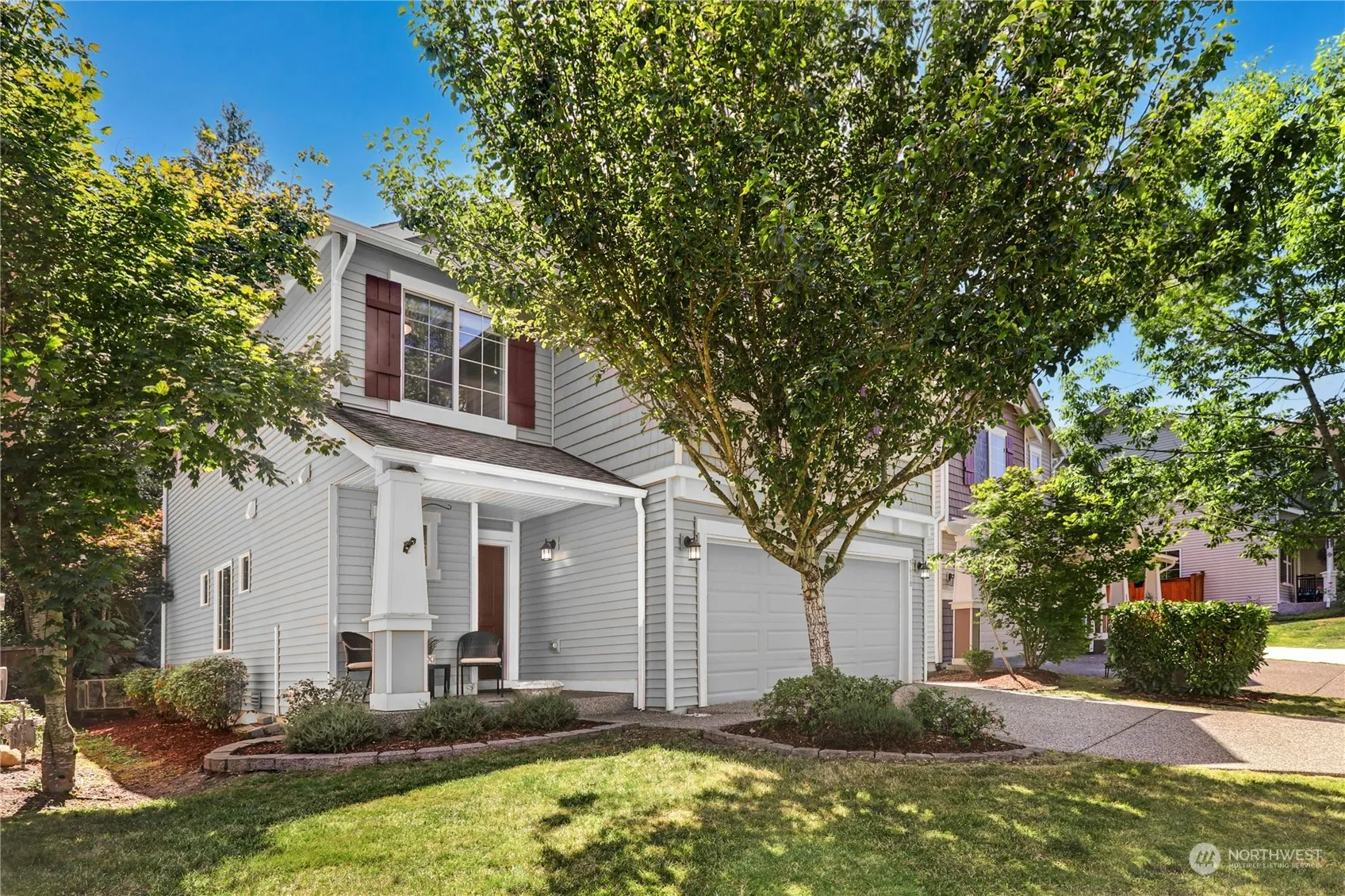 Nestled in the popular Skagit Highlands, this spacious and versatile two-story home offers a charming front porch entry leading to an open floor plan. The generous kitchen area boasts ample storage cabinetry and a center island with seating, seamlessly flowing to the outdoor patio, pergola, and backyard framed by boulders. The primary suite features a walk-in closet and a spacious bathroom with a soaking tub, tile and glass shower, and dual sinks. Three additional bedrooms and a generous landing area offer potential for a workspace, play zone, or media area. The property includes an attached 2-car garage and driveway parking. Enjoy Skagit Creek Park across the street, with mountain views and nearby trails. This home awaits your presence!