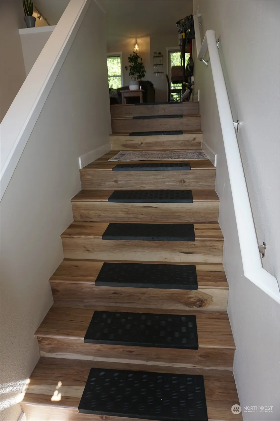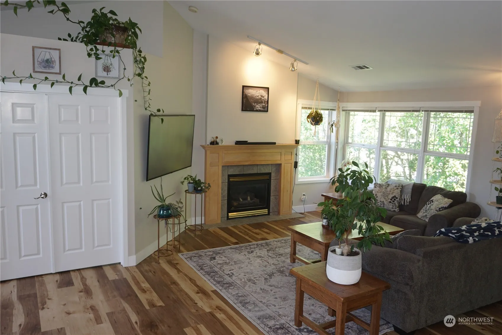 Open Bright Floorplan nestled in a Serine well maintained community welcomes you home. Two car garage and entryway at street level and all living space on the second floor (primary, guest, + den/office/hobby room.) Recently added upgrades include heat pump with two ductless mini-split units providing ample efficient heat and cooling, luxury vinyl plank flooring, carpet and interior paint. Enjoy the privacy of the greenbelt behind this unit that this selected unit faces. Primary included dual closets, (one walk-in), and large bathroom with double sink vanity. Close and convenient to walking trails, parks, and amenities.