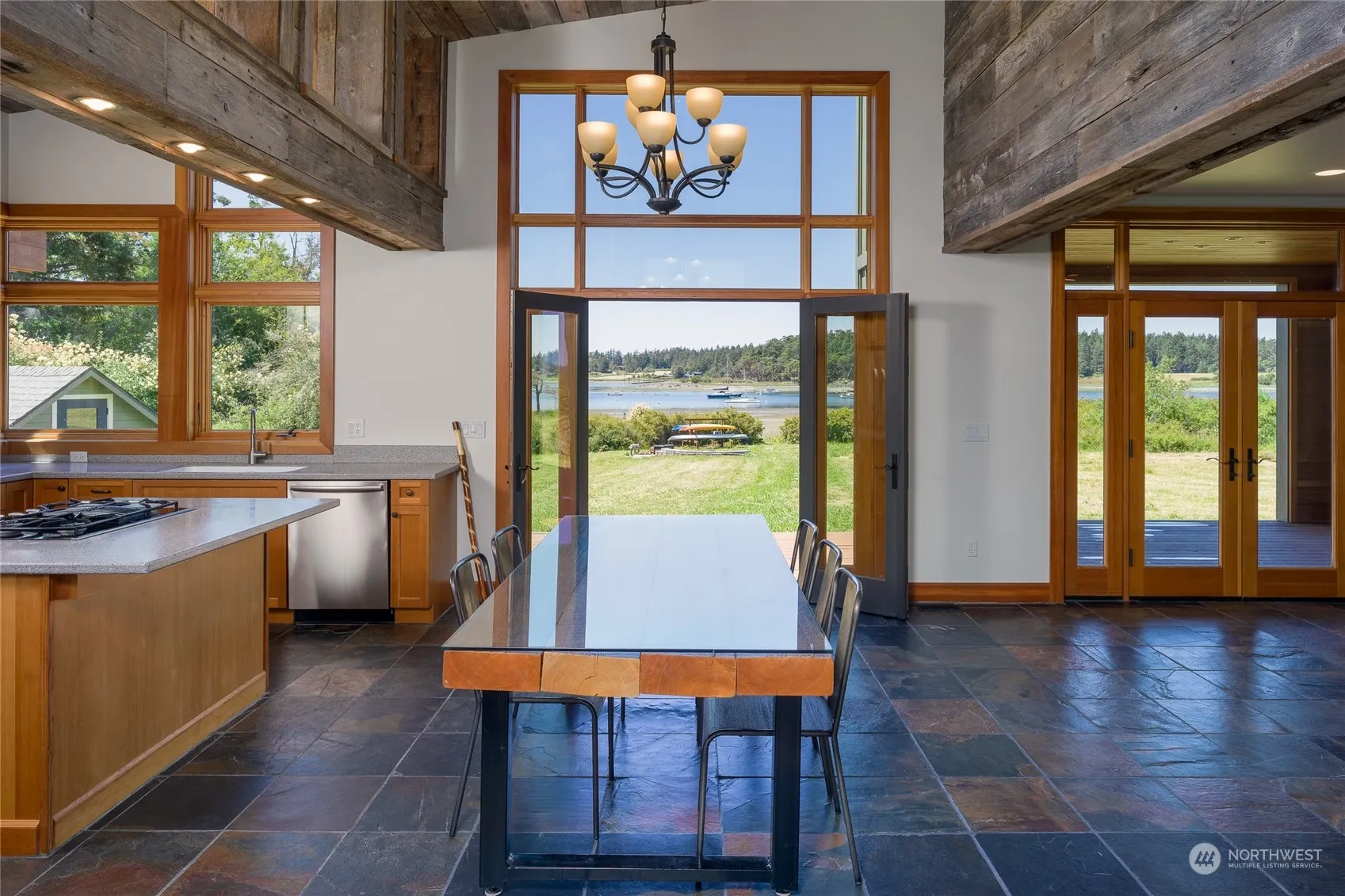 Waterfront estate next to the Village emanates modern style, integrity of construction & harmony w/ nature. Custom-built, legacy home nestled among seasonal stream, 400ft low-bank waterfront, & fruit trees. Barnwood harvested from the property is showcased throughout the ground level. Cedar siding, metal roof, Loewen windows/doors, slate & fir floors. Firepit is steps from your private beach. 2-car garage, 4 acres, wraparound deck, playhouse, SIP construction, mooring buoys, & awesome well water. Walk to the village for coffee or go kayaking before breakfast. Seaplane nearby. Possible seller financing.