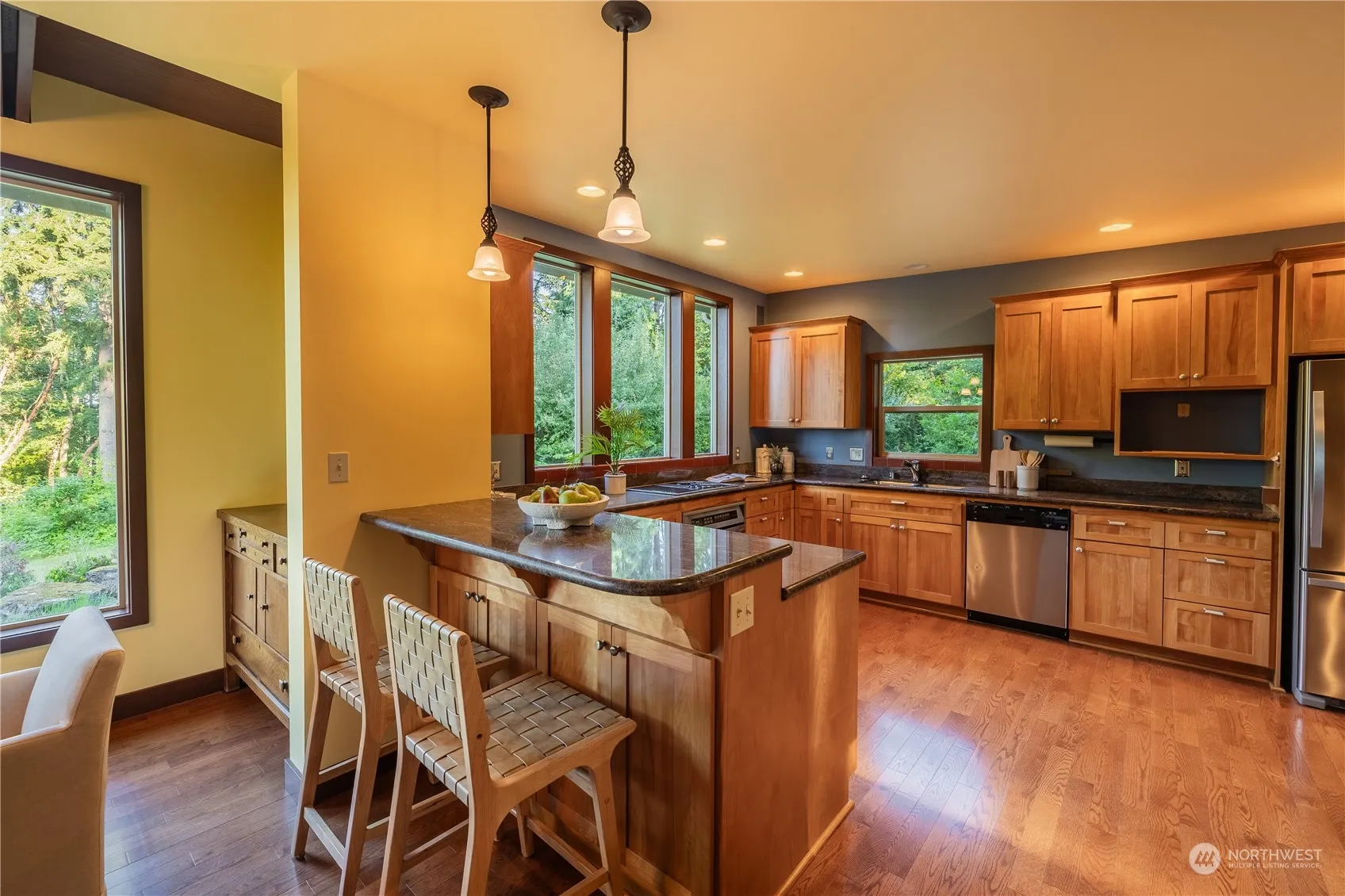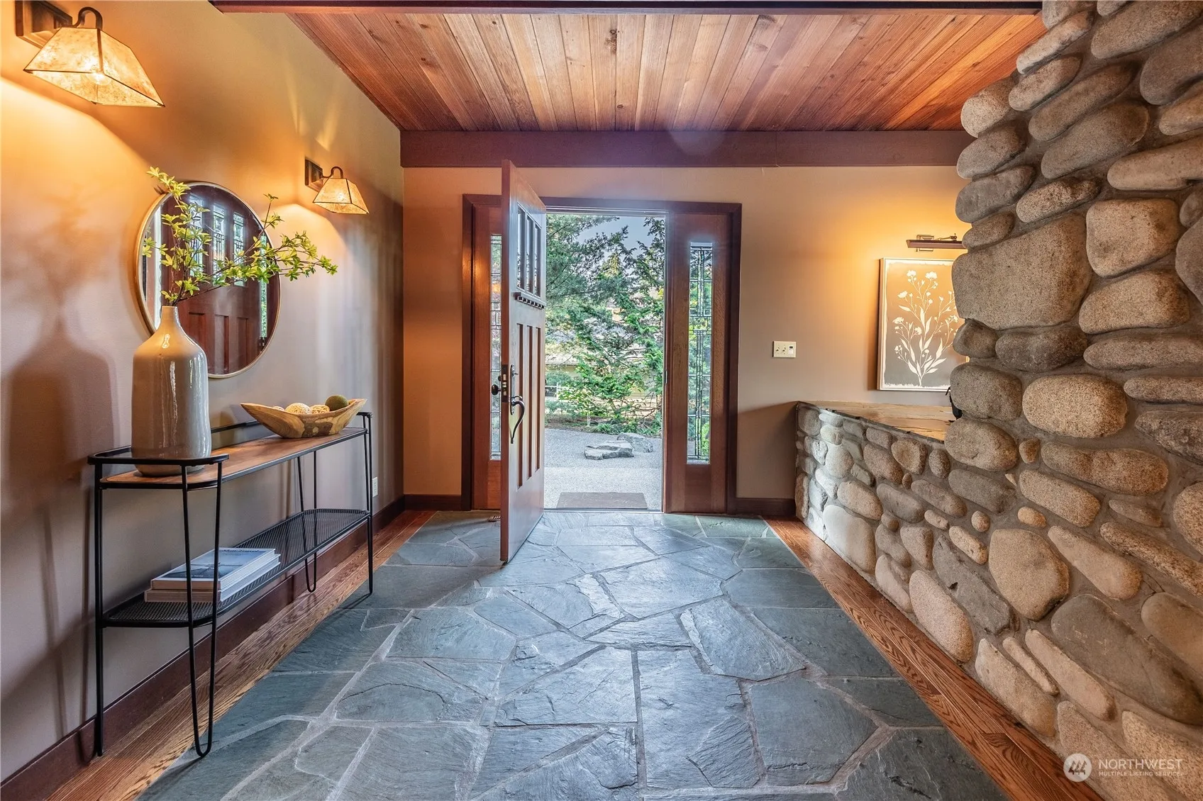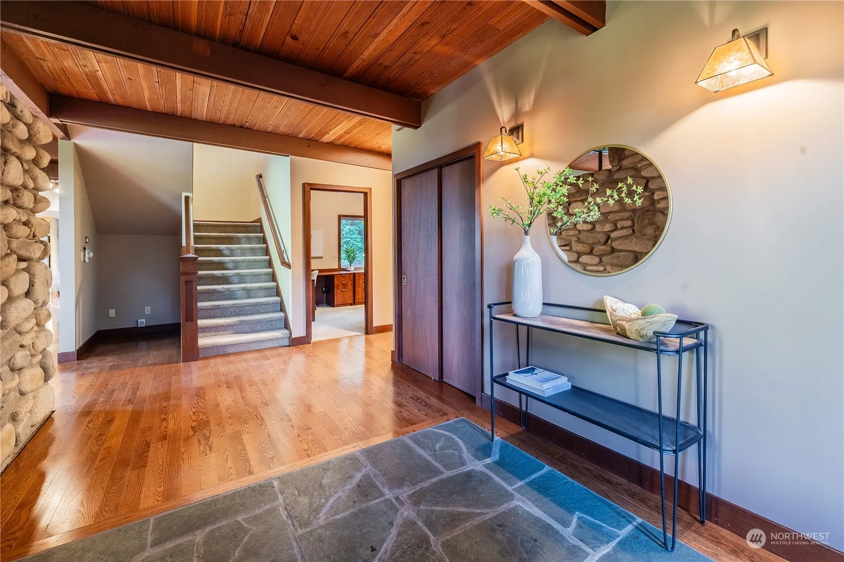 On two tax parcels, this well maintained & updated MCM home is everything you need. Beautiful entrance to open floor plan w/ iconic stone fireplace & a wall of windows that blends home & nature seamlessly to take in the park like grounds around it. Main level has large kitchen & breakfast area that opens to a comfortable patio, dining room, living rm, bedroom, bath, & office. Great primary suite upstairs + 2 more bedrooms & bath on upper level & rec rm which opens up to balcony w/ territorial views. Basement has incredible wine storage system, bath, & the shop of all shops complete w/220. Wired for generator, + LFP Civic Club rights! LFP is known for its beauty & natural settings, parks, schools, shopping, & convenient commute.