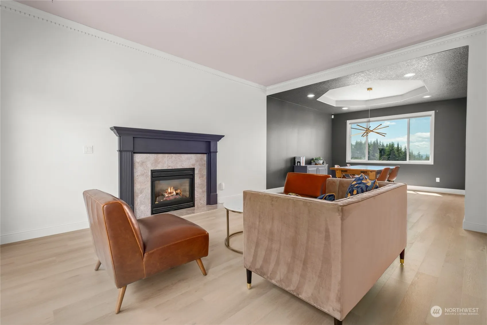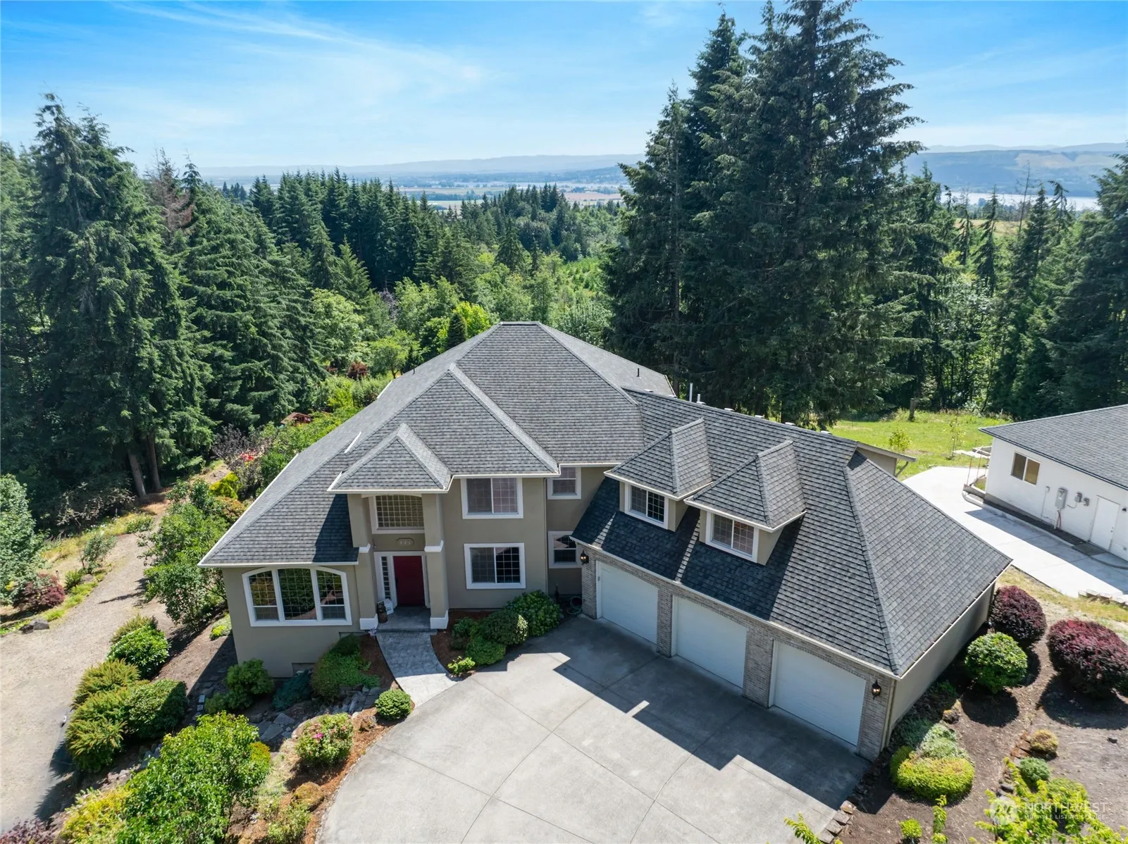 Perfection throughout! Halfway to Heaven! Best Custom home with 2 separate living areas! 5 bedrooms and 3.5 baths home on 5 gorgeous acres with amazing downstairs with living/dining rooms and patio, kitchen and bedroom. Main grand entry opens to formal living and dining on the left and office on the right. Kitchen has center granite island and top of the line appliances, 2 pantries, and nook with deck and sitting areas. Many rooms also view custom tiered back yard with mystery paths and special rest areas. Gran stairway leads up to primary suite with walk in shower, double sinks, fireplace and deck veranda area with view. 3 more bedrooms + bonus room up. Rear stairway . Incredible heated huge 48’X 24′ heated shop -14 ft shed. 3 car garage.