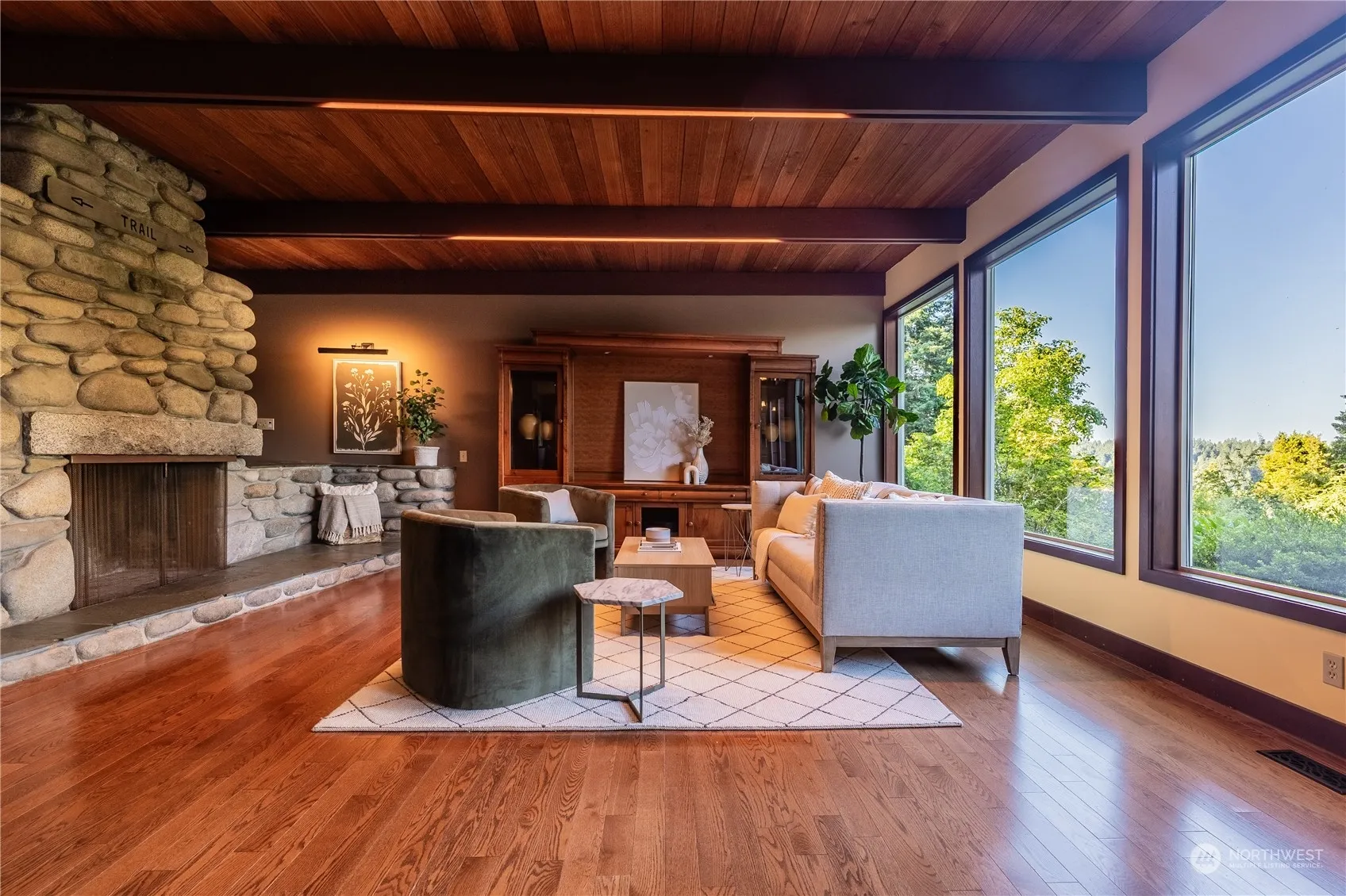 First time available in decades, this well maintained & updated MCM home is everything you need. Beautiful entrance to open floor plan w/ iconic stone fireplace & a wall of windows that blends home & nature seamlessly to take in the park like grounds around it. Main level has large kitchen & breakfast area that opens to a comfortable patio, dining room, living rm, bedroom, bath, & office. Great primary suite upstairs + 2 more bedrooms & bath on upper level & rec rm which opens up to balcony w/ territorial views. Basement has incredible wine storage system, bath, & the shop of all shops complete w/220. Wired for generator, + LFP Civic Club rights! LFP is known for its beauty & natural settings, parks, schools, shopping, & convenient commute.