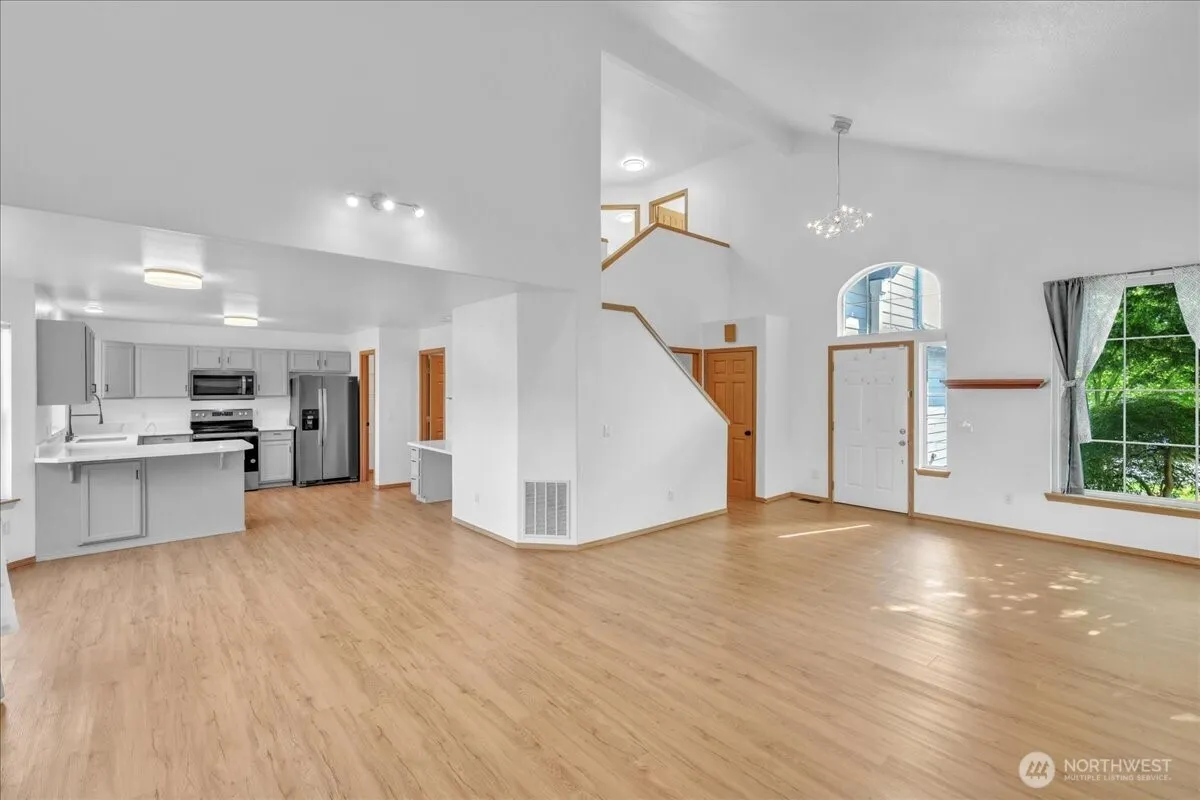 Small town w/ a BIG VIEW! Welcome to this stunning corner-lot property in Orting! This open layout showcases soaring vaulted ceilings, abundant natural light, and thoughtful updates throughout—new vinyl flooring + fresh interior paint. Enjoy year-round comfort with AC & gas fireplace. The newly remodeled kitchen features modern touches, walk-in pantry, and a spacious dining area. Upstairs offers 3 beds/2 baths highlighted by a spacious primary suite with double sinks, walk-in shower, and a oversized walk-in closet. A convenient half bath is located on the main floor. Fully fenced backyard w/ a covered deck—perfect for relaxing or entertaining. RV parking w/ hookup. Parks, scenic trails & amenities just a skip away. Make this yours today!