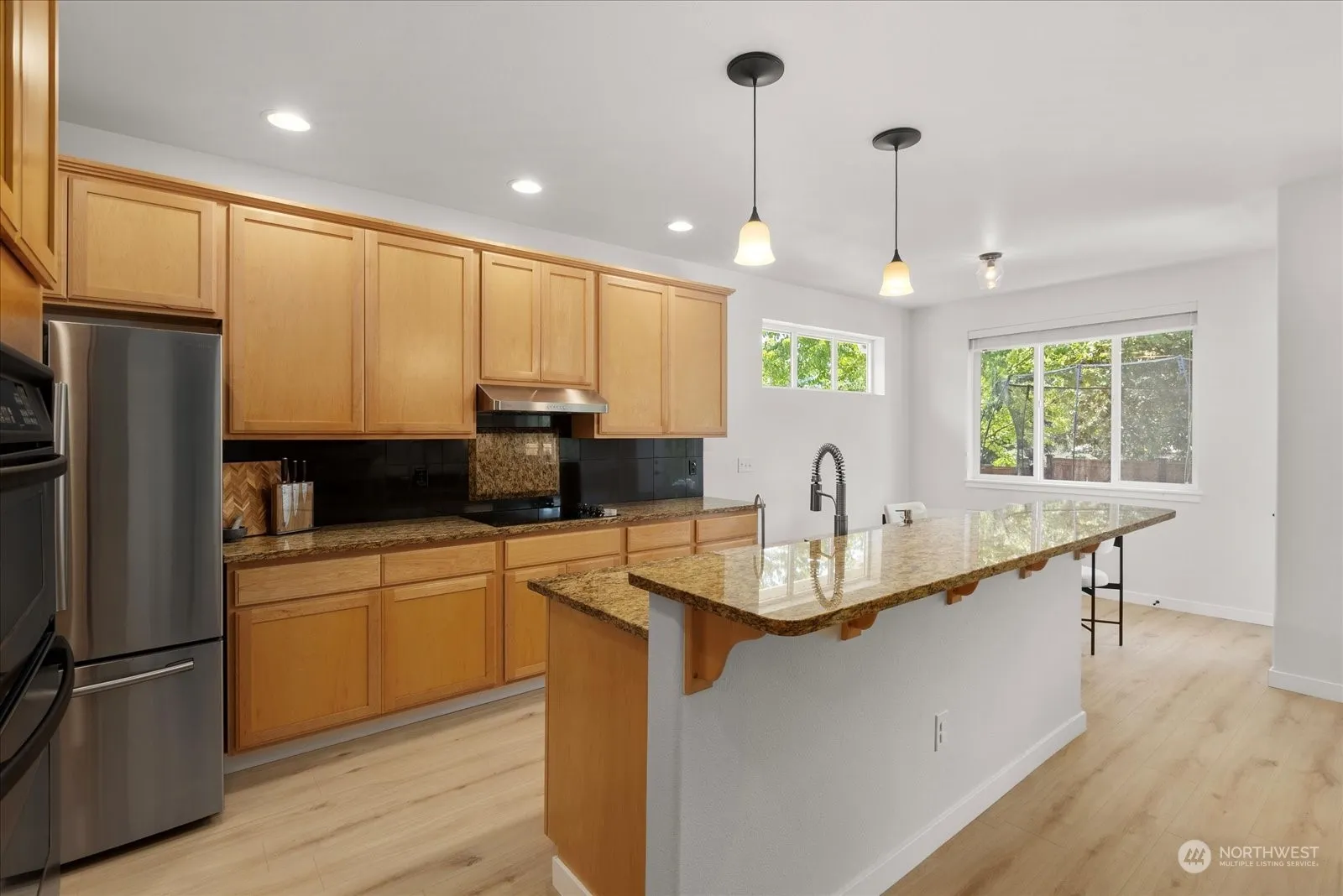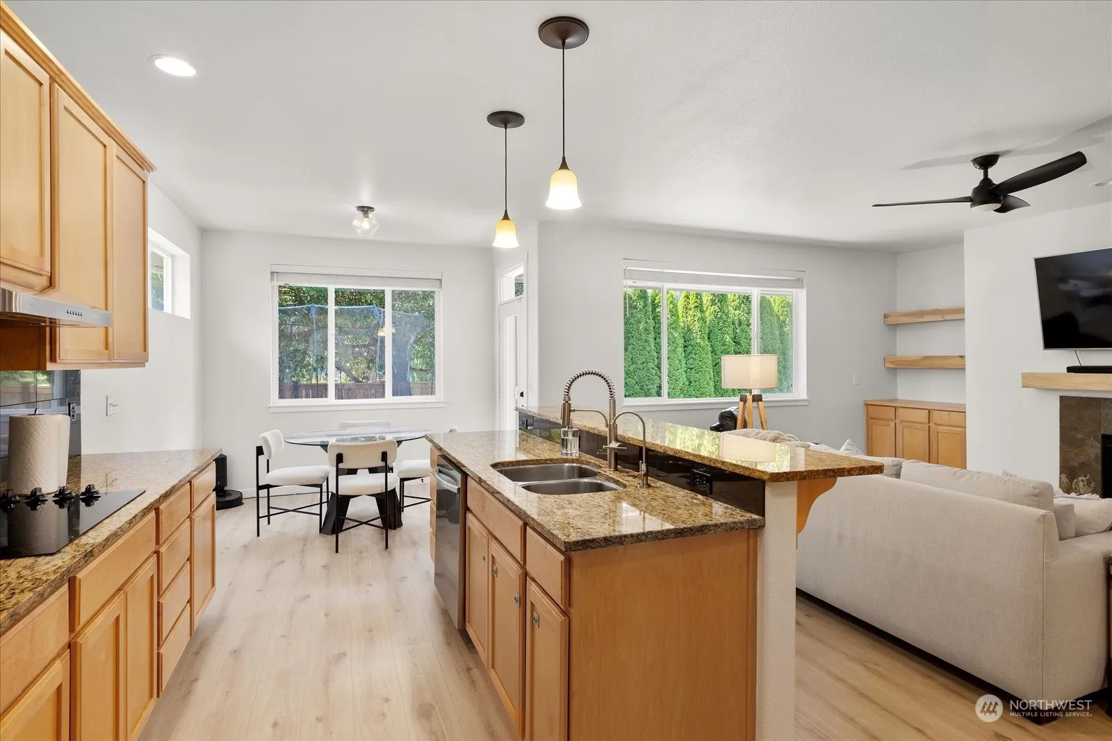 Stunning Rambler located in desirable community.This home boasts 9′ ceilings, a spacious 2,235 SQFT floor plan, featuring 4 beds, 2 baths & large 670SQFT 3-car garage. Enjoy upgraded LVP floors throughout, formal dining room, kitchen W/ stainless steel appliances, granite countertops, eating space & butler’s pantry. Entertain in large living room, with a beautiful gas fireplace, upgraded shelves, and ceiling fan. Escape to your primary suite with custom 5-piece bath including a Soaking tub, Large shower + Walk-in closet. The house features 3 additional bedrooms, full bathroom & large laundry room. Updated furnace W/ air scrubber system, A/C, Generac generator, and security system. Relax in private backyard, new fence, and fire-pit space.