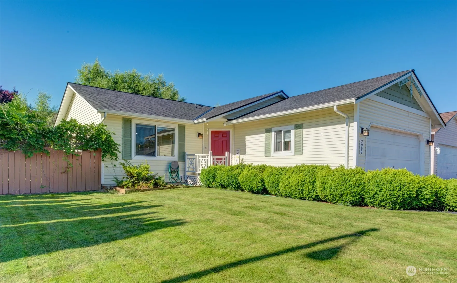 Cutest rambler in Bakerview West! Sellers have made some nice improvements to the home for you to enjoy! Newer mini-split for heating and cooling, newer roof, newer hot water tank, attic and crawlspace all tidied up and all the appliances stay! Pre-inspected. Primary bdrm w/walk-in closet & continental entry to hall bath. 2nd bdrm features brand new carpet. Tile flooring in kitchen/dining area. The slider opens to a patio and fully fenced back yard. Established landscape, water feature and a garden shed. There is wisteria, cherry and apple trees and even blueberries! Located across the street from the highly acclaimed 40 acre Bakerview Park (off-leash dog area, skate park, play areas) and a block away from the Kulshan Trail access.