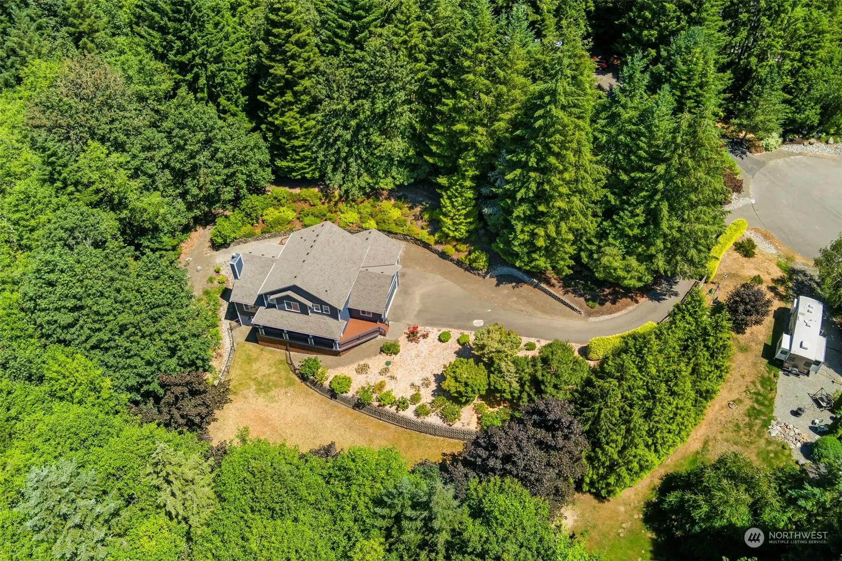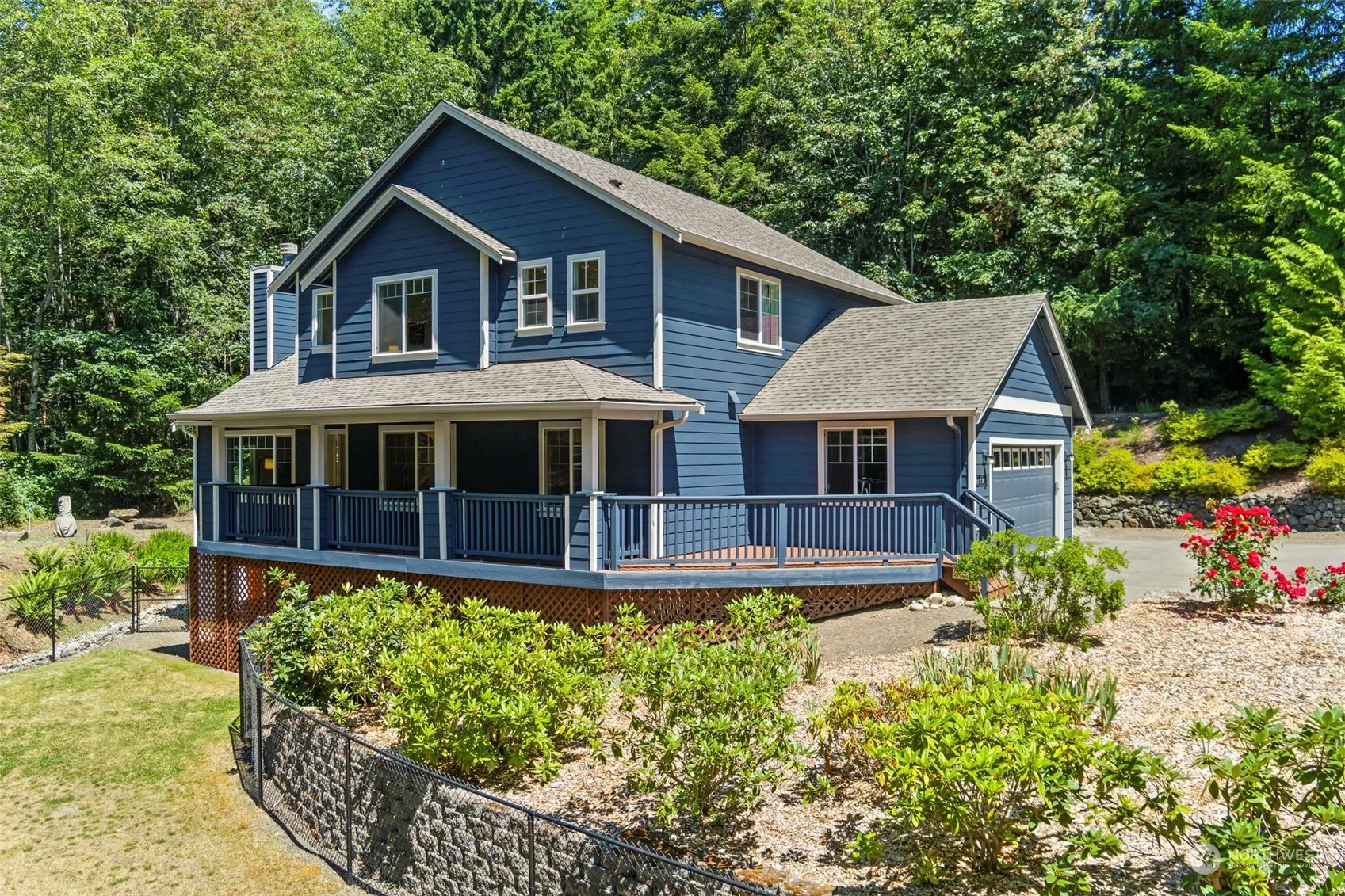 Kingston’s best kept secret: Kingston Highlands. Just 5 min from Kingston ferries is a fabulous, quiet neighborhood! Journey down the pvt driveway and fall in love with this beautiful home! Inviting, freshly painted exterior and newly coated decking wraps around to your front door. Vaulted ceilings, laminate hardwoods and a cozy fireplace. Kitchen features SS appliances, with a custom-built butcher block counter and walk in pantry. Treyed ceiling in dining room. Upstairs is a spacious primary ensuite with a 5piece bathroom, 2 additional guest rooms with jack-n-jill bathroom! HUGE utility/laundry room, New roof, recently fully fenced large side yard, plus a dog run! RV Parking and backs up to a greenbelt. No HOAs! Just feels like home.